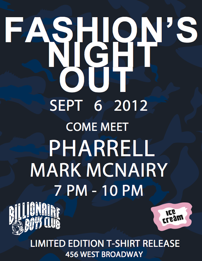 This is going to be crazy… Billionaire Boys Club is hosting a meet-and-greet at their Soho store for Fashions Night Out. The event runs from 7 to 10pm and offers BBC fans a chance to meet Pharrell & Mark McNairy.