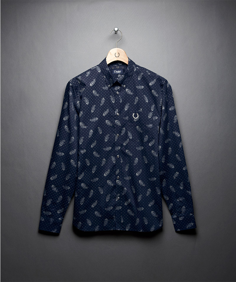 Styles include the classic Fred Perry shirt and Bomber jacket, which both pay homage to Drake’s signature medallion print, whilst an enlivened archive paisley print brings a statement to woven styles. All over print patterns sit alongside more subtly detailed designs, with pattern applied to plackets, collars, linings and footwear; creating a distinctly British collection.