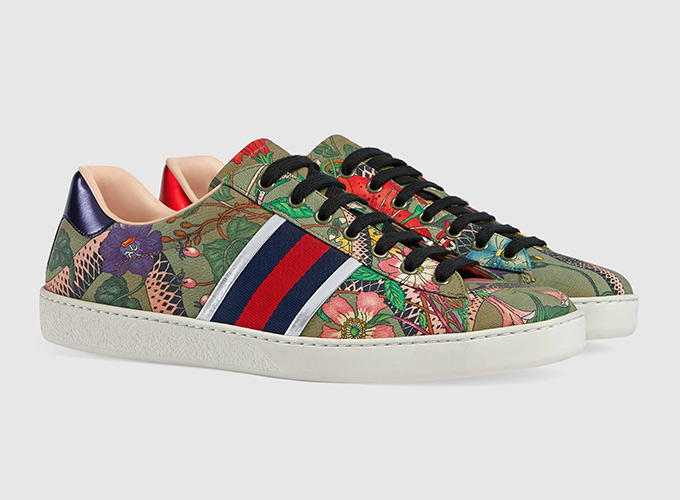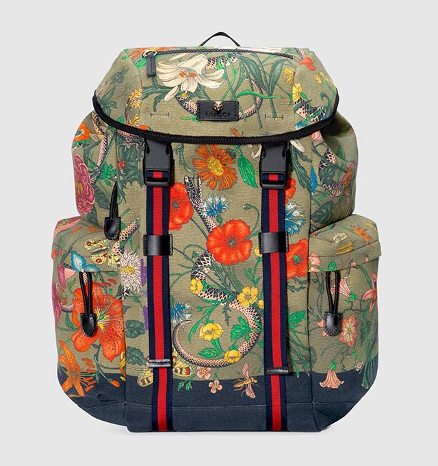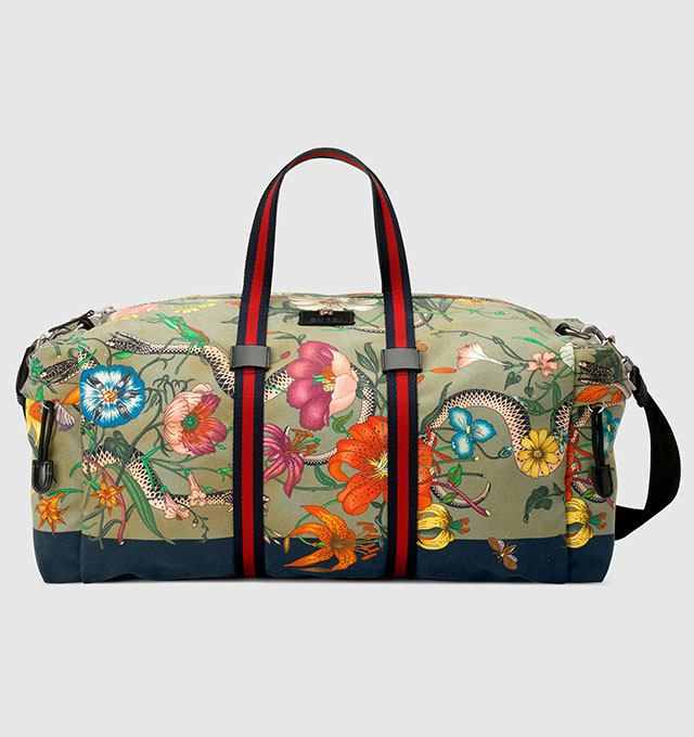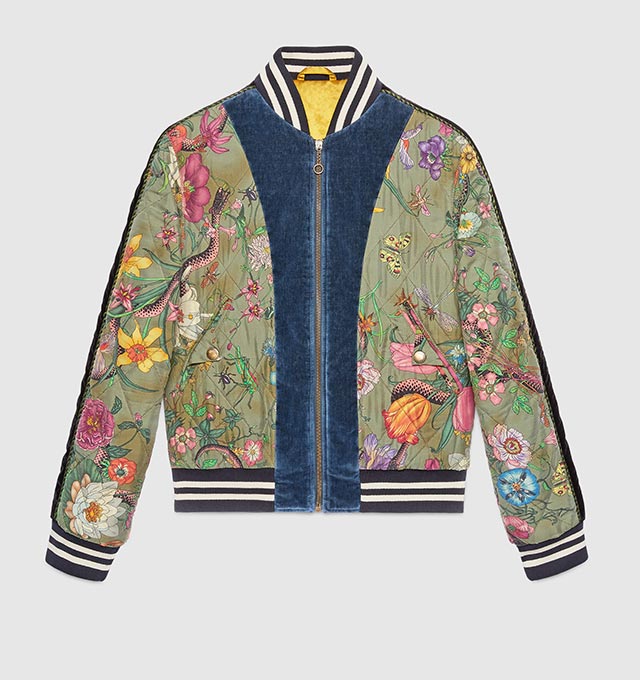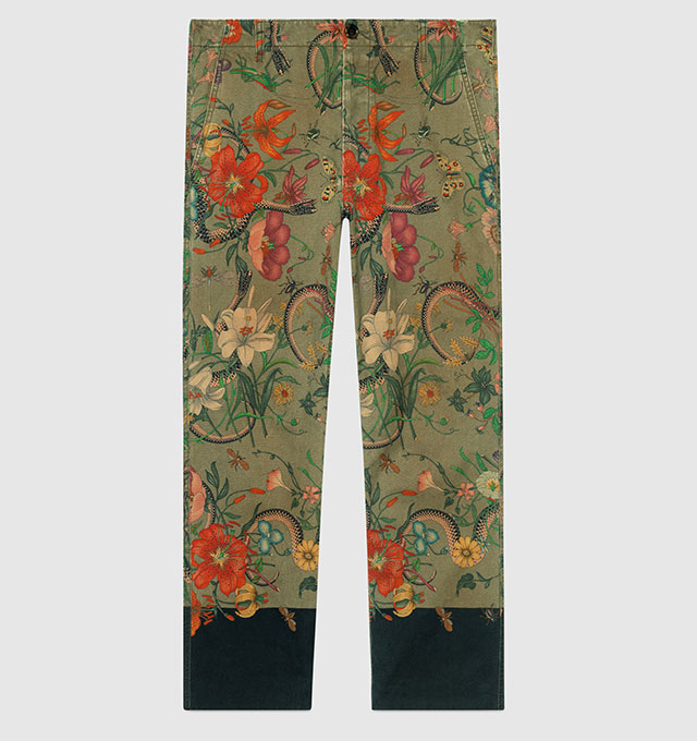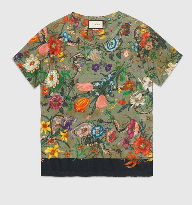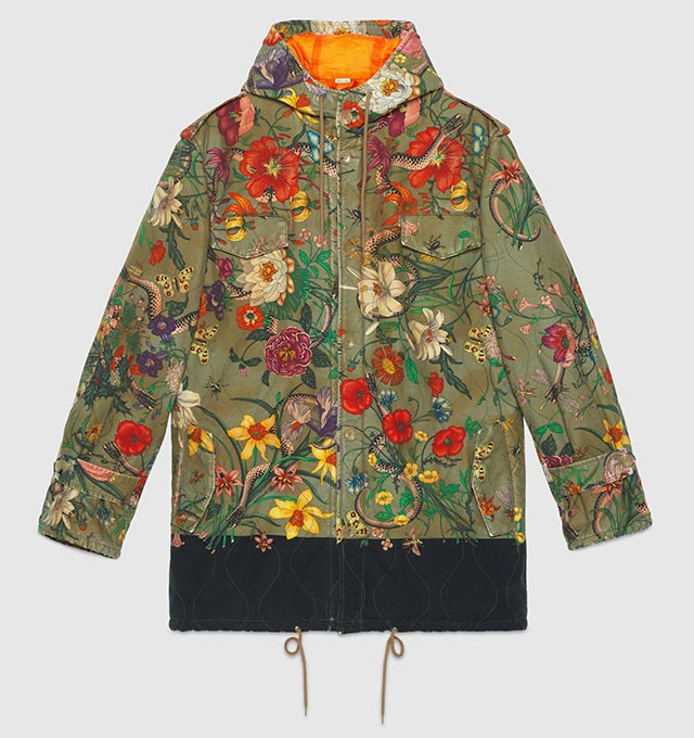 Gucci’s floral motifs were born in the 1960’s when Rodolfo Gucci commissioned illustrator Vittorio Accornero de Testa to create a floral print for a commemorative silk foulard he would present to Princess Grace of Monaco. Creative Director Alessandro Michele continues to explore the houses flora and fauna themes in his SS18 collection. For the Flora Snake Capsule Michele reinterpreted one of these archival prints with his usual baroque exuberance, giving it a tea-stained effect and applying to military-inspired silhouettes. Shop the collection now at gucci.com.