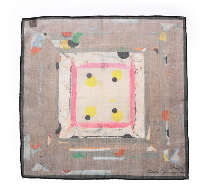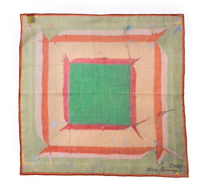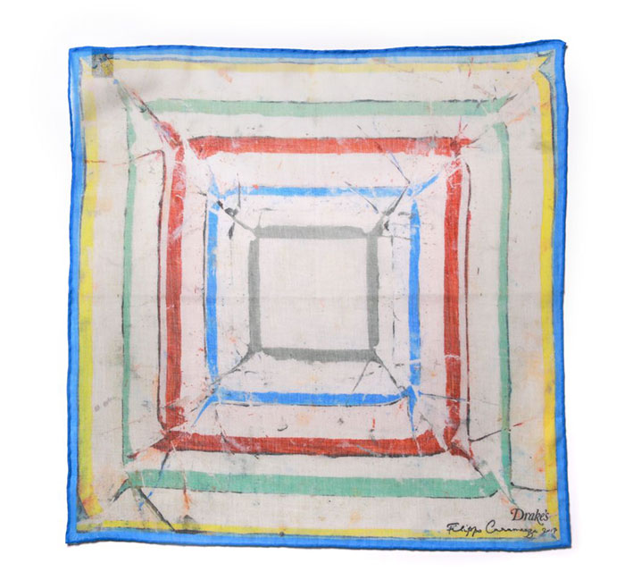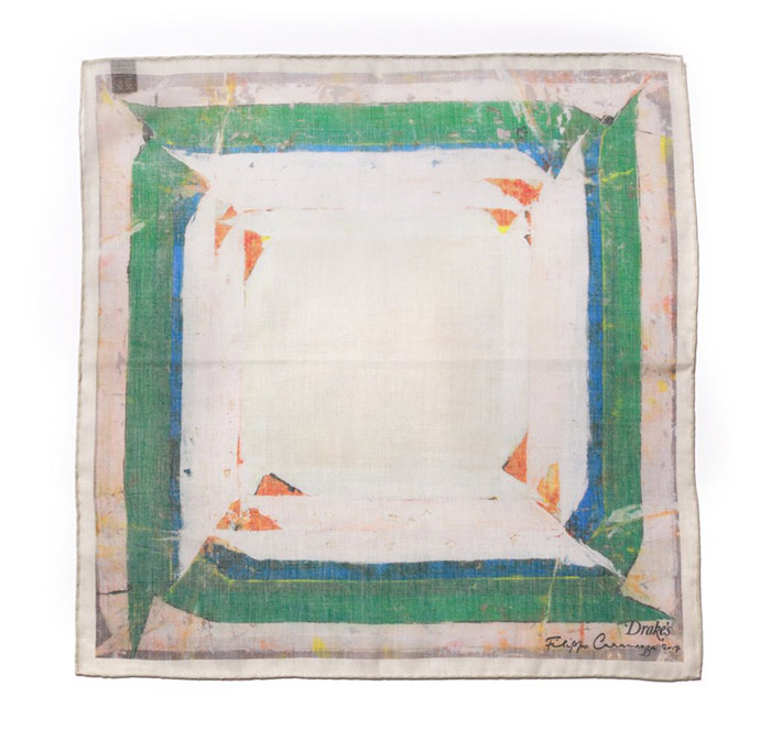 “A square is so simple and versatile, and an inexpensive way to own a work of art – hung on a wall, or as part of an outfit. When Michael [Hill, Creative Director of Drake’s] visited the studio, he was very open-minded about things so the whole process was very straightforward. We decided on a number of existing folded paintings. The paintings in this series often consist of a central motif along with a decorative border, so stylistically they seemed to lend themselves to pocket squares. – Filippo Caramazza