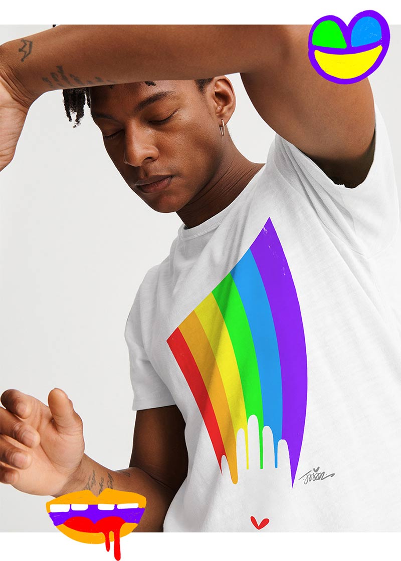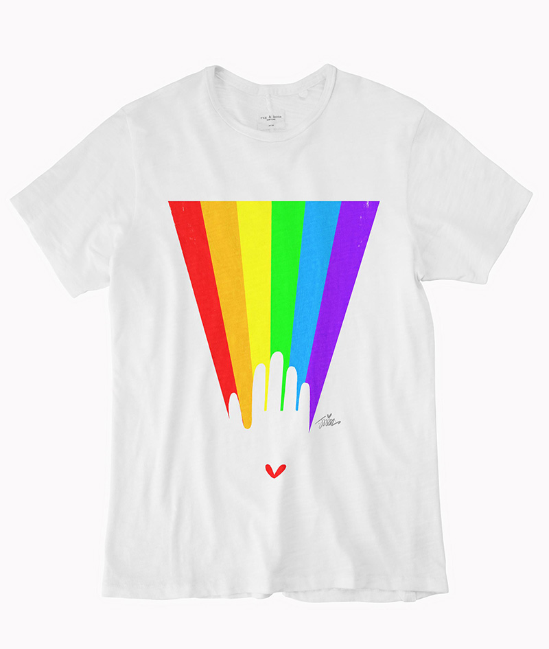 Rag & Bone is celebrating Pride month with two limited edition t-shirts designed by multimedia artist Jason Naylor. Attracted by his electric palette and messages of love and positivity, Marcus Wainwright – founder and chief brand officer at Rag & Bone – commissioned Brooklyn based Naylor to create two original designs inspired by individuality and togetherness. Naylor transformed this direction into the rainbow colored Hand and Lips graphics. The designs are available now at select Rag & Bone stores with 20 percent of sales proceeds donated to the Trevor Project, one of the leading national non-profit organizations providing crisis intervention and suicide prevention services to LGBTQIA+ youth.
