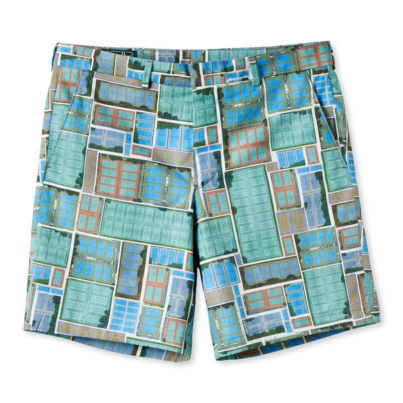 The NYC Courts print features a bird’s eye view of city’s favorite public courts including Canal Street, Park Slope and Central Park. The print decorates a pair of microfiber athletic shorts with knit mesh panels across the back and on the sides. The colorful court print is also used on a pair of tailored shorts, a short sleeve button down shirt and an open collar camp shirt – all cut from 100% cotton and sewn in Gitman’s Pennsylvania factory.
