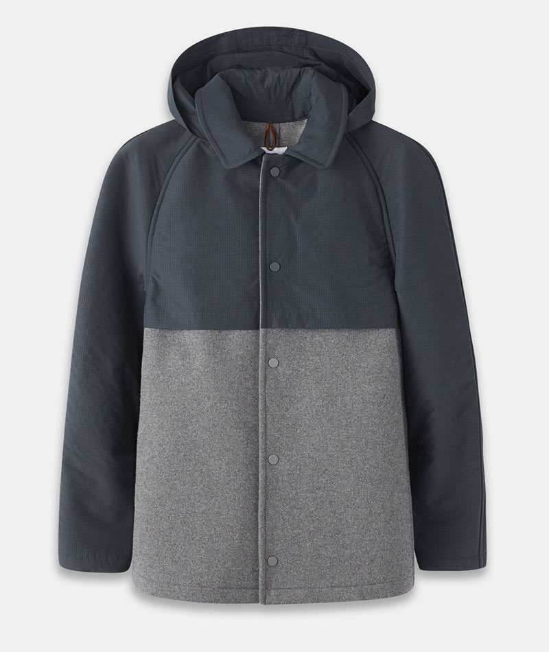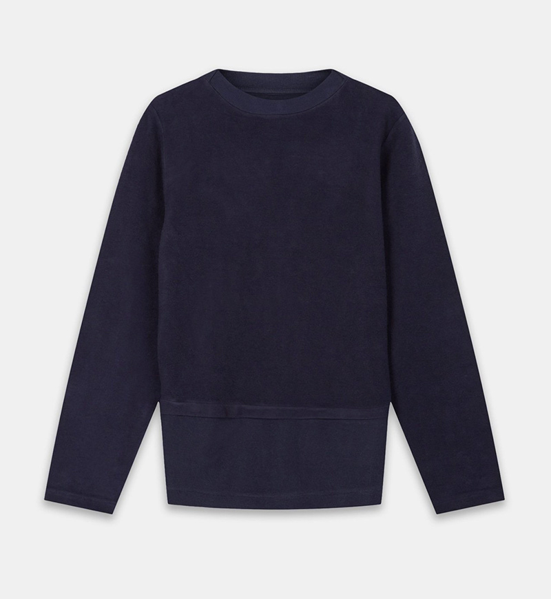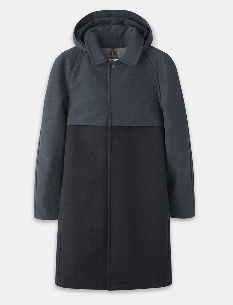 The centerpiece of the capsule is L’Overcoat, an update of Gloverall’s traditional silhouette. Les Basics switched out the traditional toggles for press studs, added a detachable hood and used a combination of jersey-backed wool contrasted with nylon ripstop to create a longer overcoat with a more utilitarian look. The second outerwear piece, Le Coach Jacket crops Gloverall’s Whitby Deck Duffle for a boxy, modern fit. The styling mimics the overcoats raglan sleeves and combination of wool and nylon ripstop. Both outerwear designs are made in England. The collection also includes the Le Boat Neck Sweat and Le Polo Sweat. These minimalist designs in soft cotton loopback knit offer the same comfort and insulation as a sweatshirt – ideal for late summer.