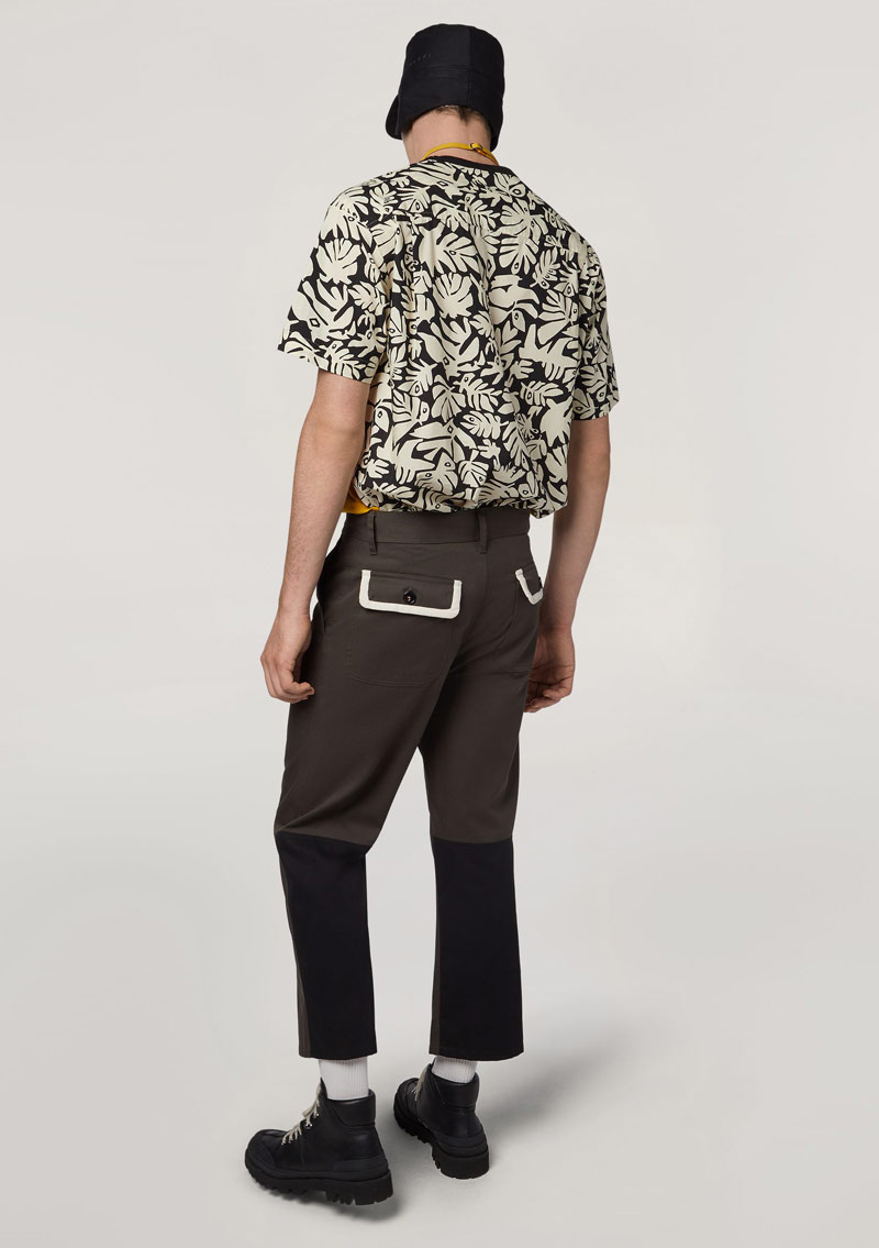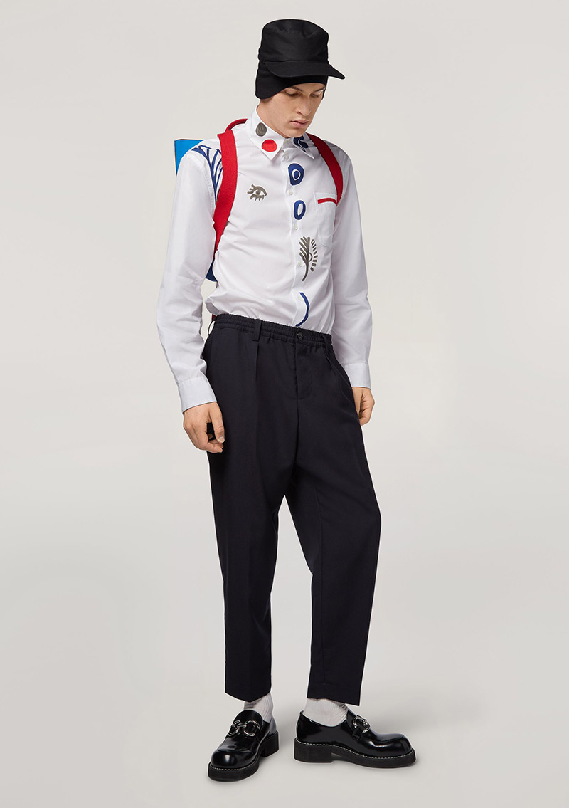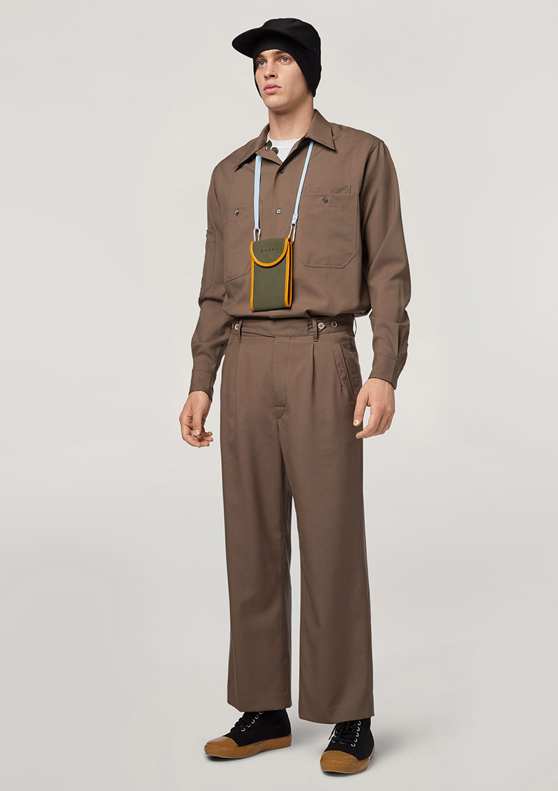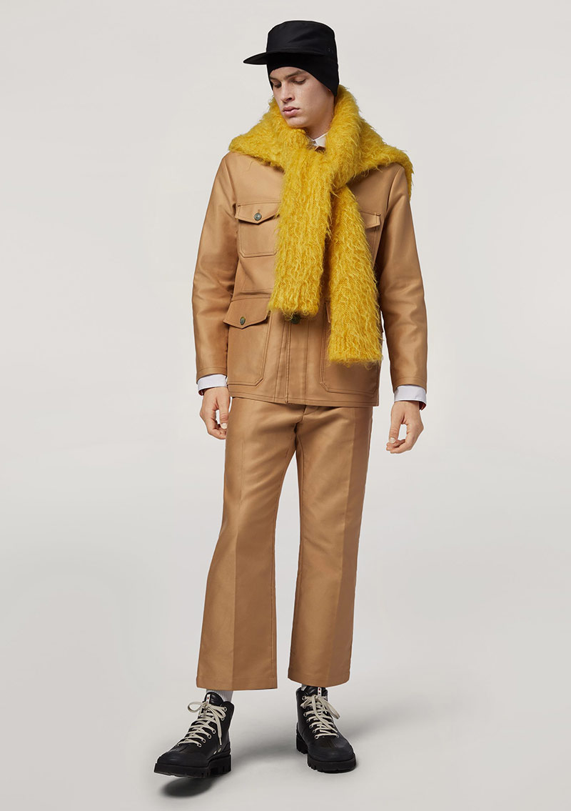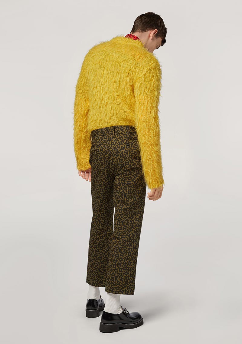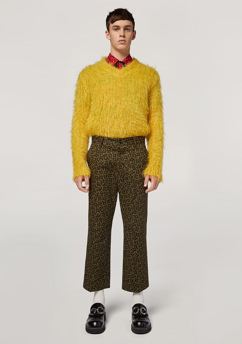 Inspired by thoughts of Che Guevara trekking through a South American jungle in natty fatigues, Francesco Risso’s latest Marni collection serves up tropical wool suits, cotton satin military jackets, lug sole boots, and a bomber style shirt in printed cotton poplin, plus a handful of covetable knitwear pieces, including a shaggy, brushed mohair sweater and knitted polo in 12-gauge virgin wool. His canniest move may have been to show a version of the quirky prints Consuelo Castiglioni made a signature of the brand, such as the abstract Camo Cells and Eyed Leaves prints. The effect is less standard-issue and more smart urban uniform.