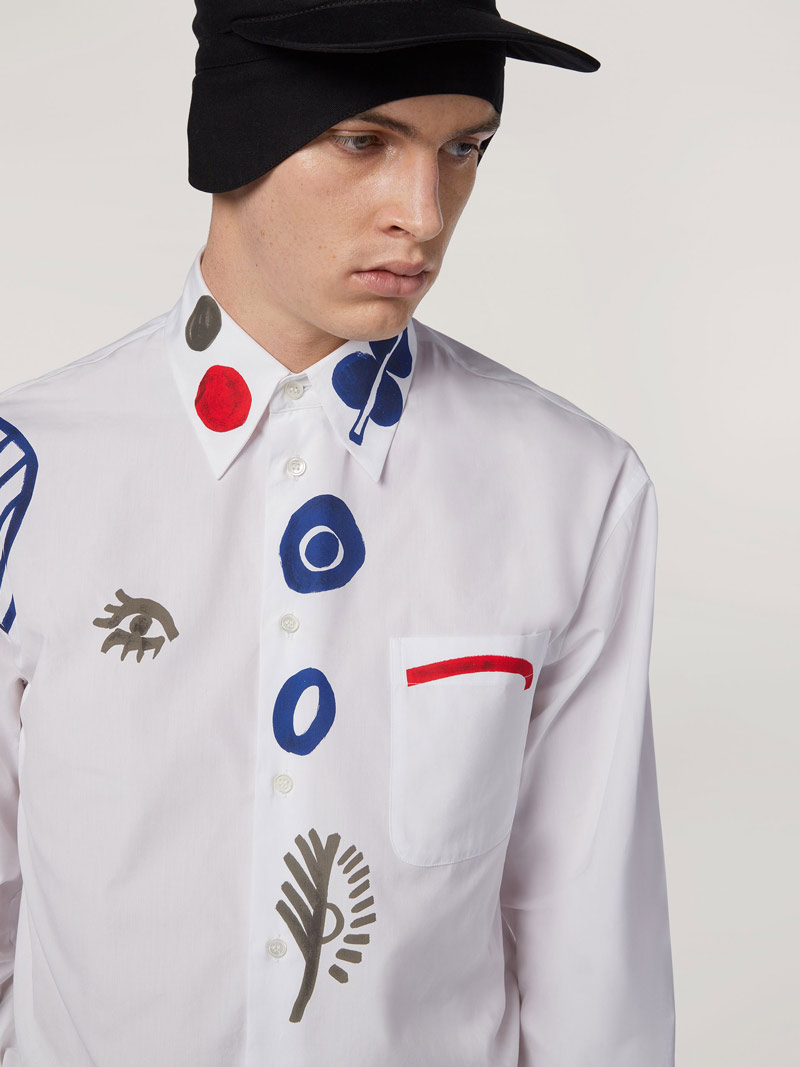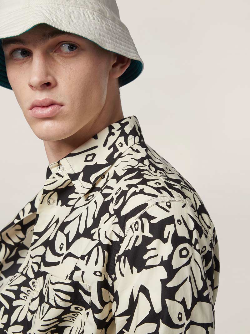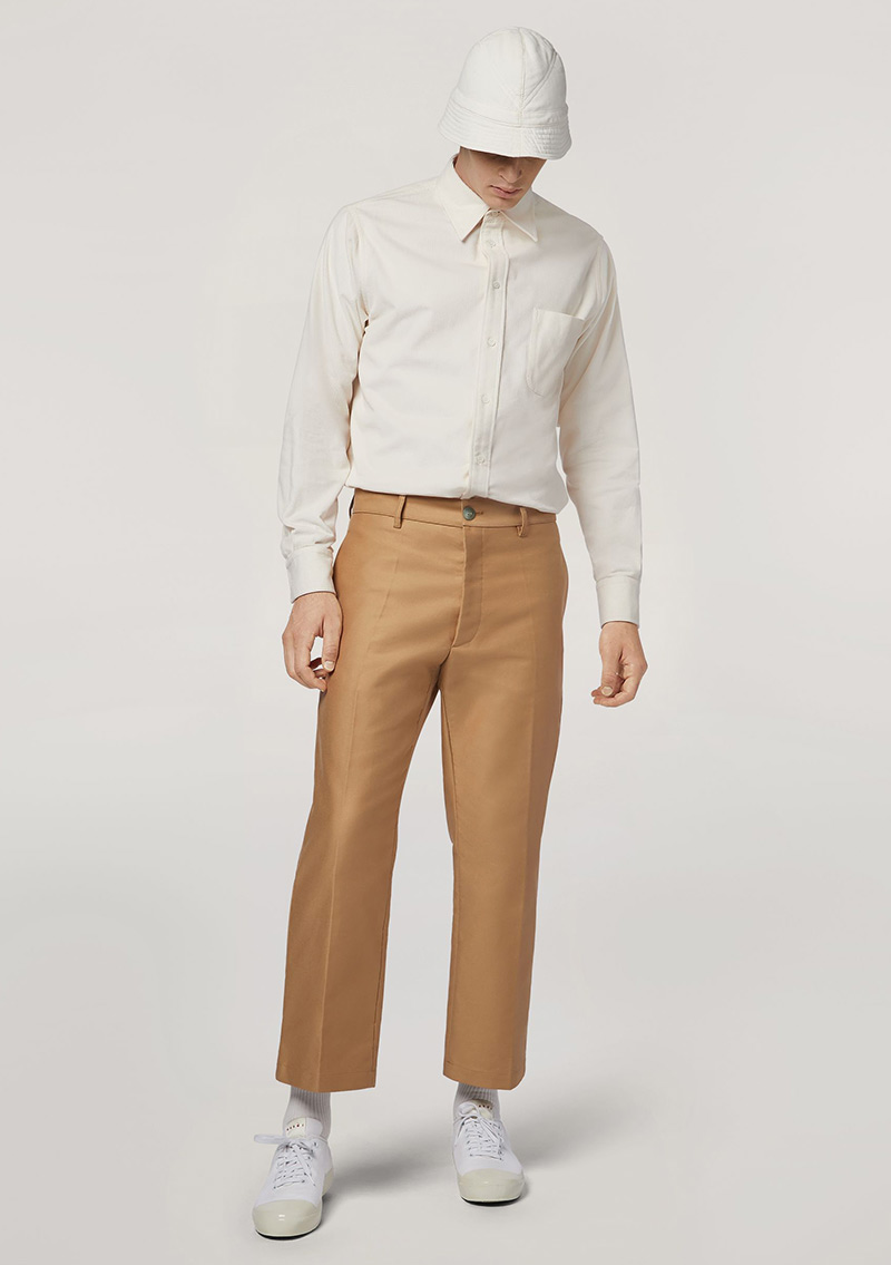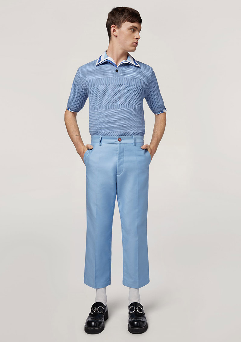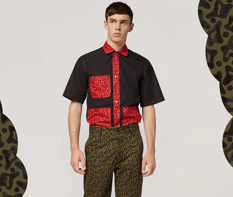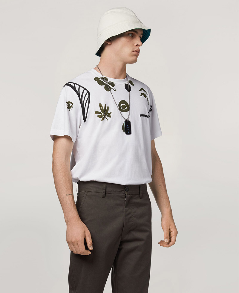 Inspired by thoughts of Che Guevara trekking through a South American jungle in natty fatigues, Francesco Risso’s latest Marni collection serves up tropical wool suits, cotton satin military jackets, lug sole boots, and a bomber style shirt in printed cotton poplin, plus a handful of covetable knitwear pieces, including a shaggy, brushed mohair sweater and knitted polo in 12-gauge virgin wool. His canniest move may have been to show a version of the quirky prints Consuelo Castiglioni made a signature of the brand, such as the abstract Camo Cells and Eyed Leaves prints. The effect is less standard-issue and more smart urban uniform.