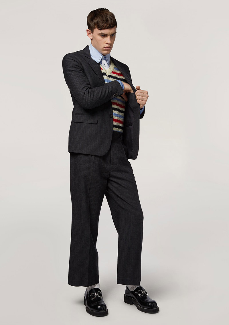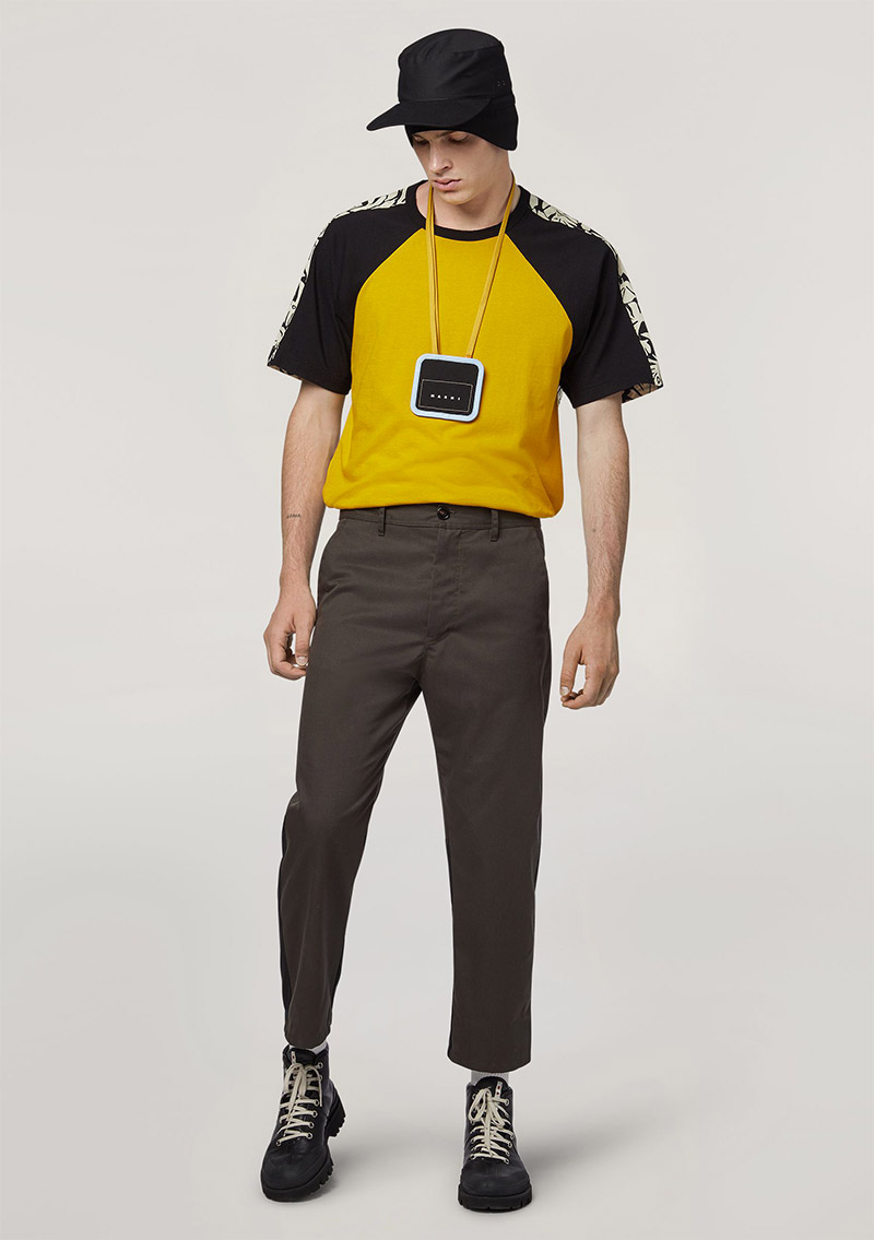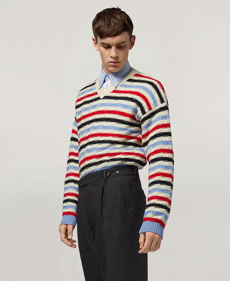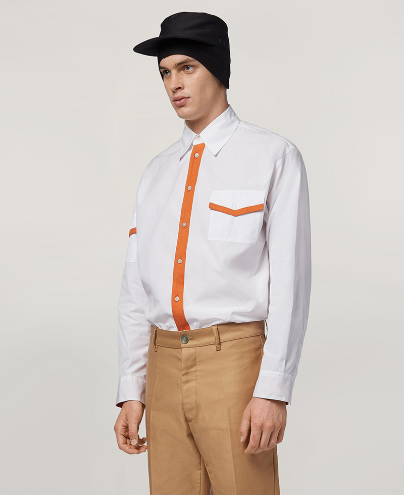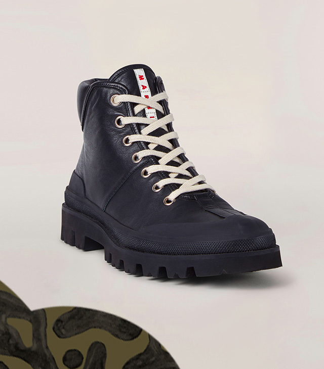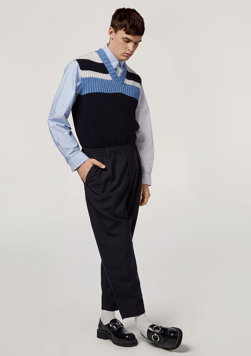 Inspired by thoughts of Che Guevara trekking through a South American jungle in natty fatigues, Francesco Risso’s latest Marni collection serves up tropical wool suits, cotton satin military jackets, lug sole boots, and a bomber style shirt in printed cotton poplin, plus a handful of covetable knitwear pieces, including a shaggy, brushed mohair sweater and knitted polo in 12-gauge virgin wool. His canniest move may have been to show a version of the quirky prints Consuelo Castiglioni made a signature of the brand, such as the abstract Camo Cells and Eyed Leaves prints. The effect is less standard-issue and more smart urban uniform.