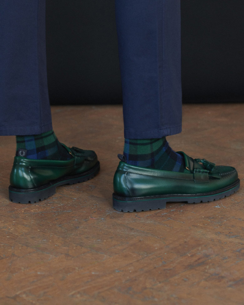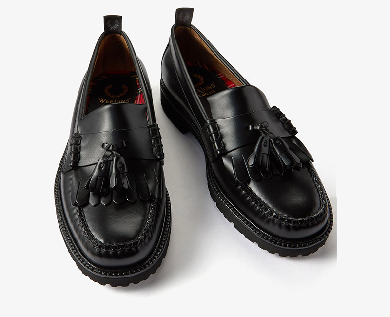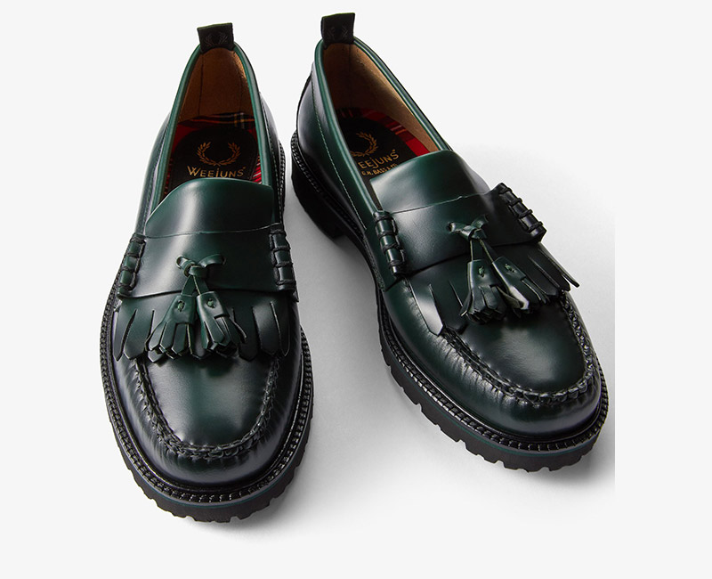 The new Fred Perry x G.H. Bass & Co. collaboration re-imagines this iconic American style along with the kiltie tassel loafer. Inspired by a 1990s Weejuns design, Fred Perry’s Larson Weejun is available in polished Oxblood and Navy leather with a thick lugged sole. The Layton Kiltie Tassel Loafer is available in Black and Bottle Green polished leather with the same thick, lugged sole made from lightweight EVA.
