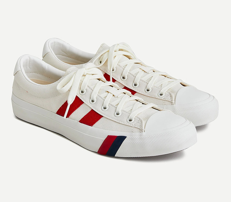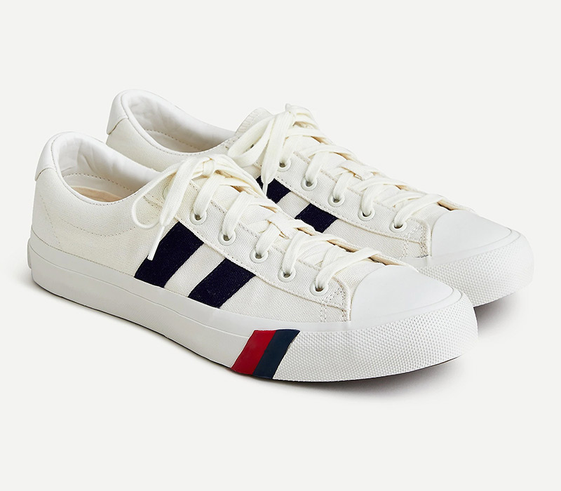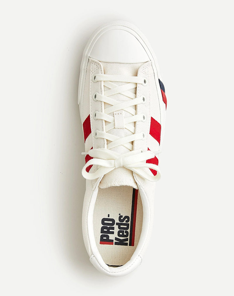 J.Crew puts its spin on the very first Pro-Keds style, the Royal basketball shoe. Originally marketed as the Sureshot when it launched in 1949, the canvas hi-top was quickly endorsed by Mr. Basketball, George Mikan – one of the early pioneers of the game. J.Crew maintains the spirit of the original design with a low-top sneaker in durable cotton canvas printed with herringbone stripes in navy or red, sitting on a rubber outsole with the Pro-Keds signature red and blue power stripes.