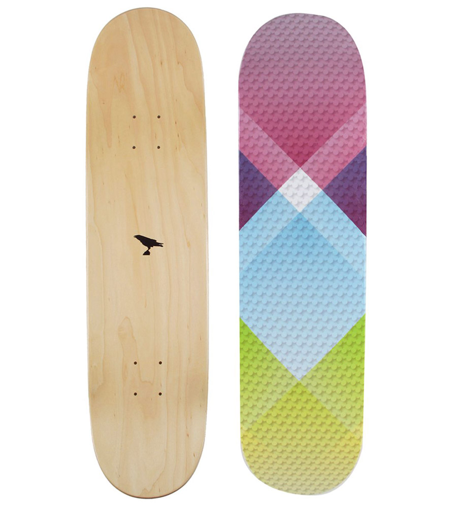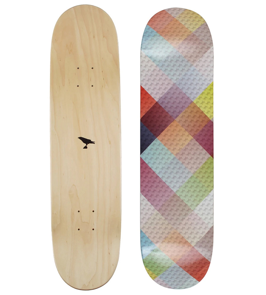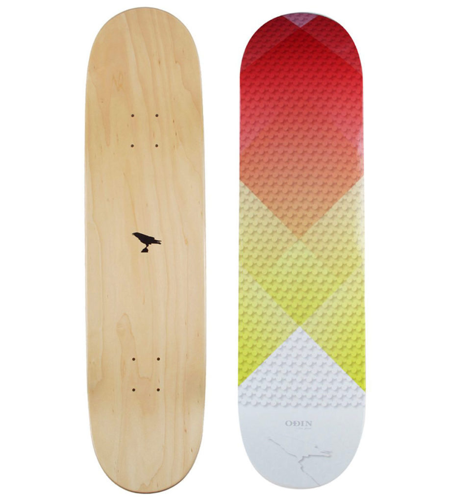 Odin New York just reissued a limited edition collection of four skateboard decks in bright, summer-ready geometric patterns. Handmade in California using 7-ply maple panels, the popsicle shaped decks have hardwood grains running the length of the top side, with the crisscross patterns on the bottom. Each board is finished with Odin’s signature raven logo on the top side.