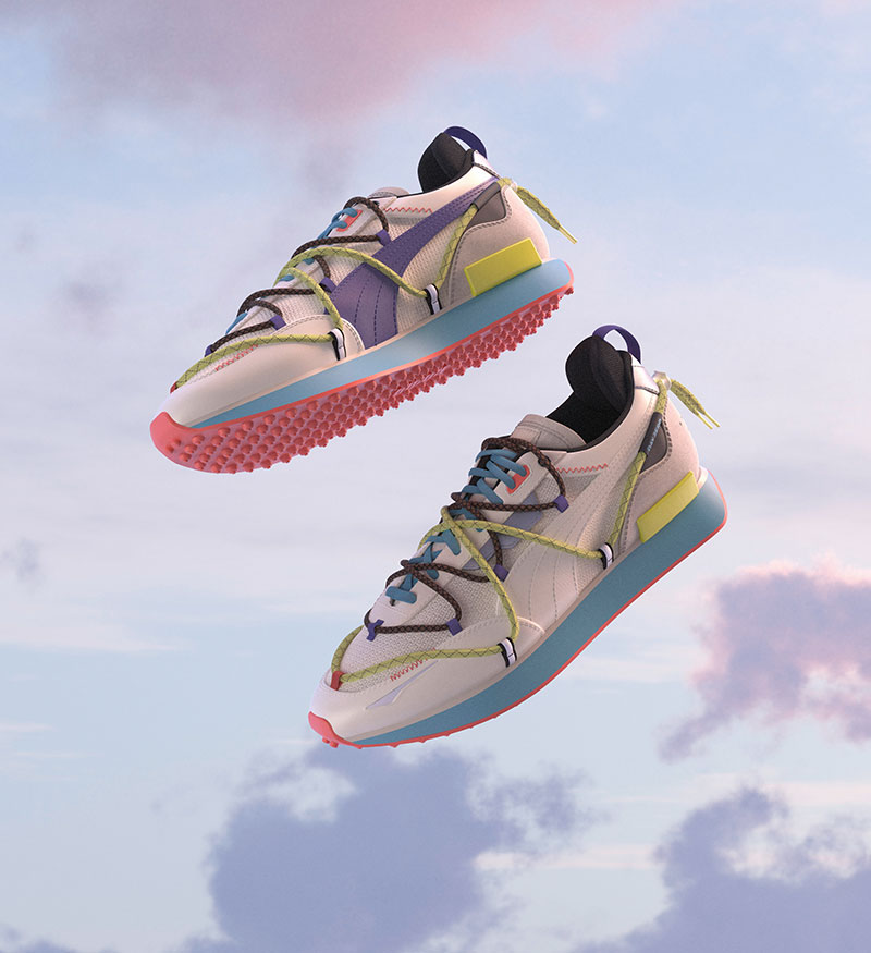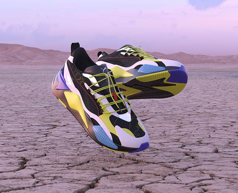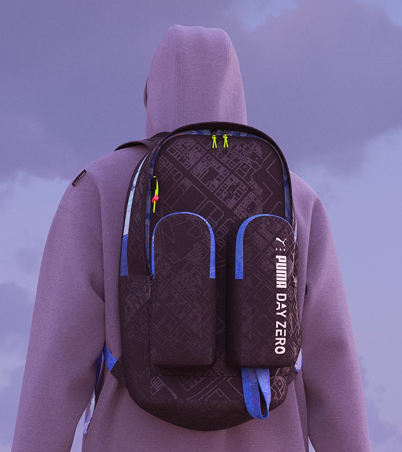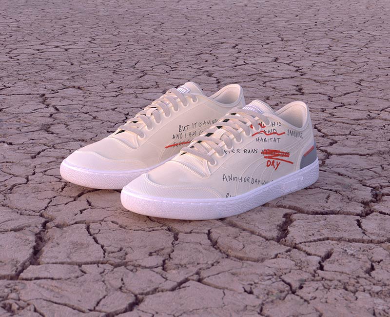 PUMA partnered with the BA Fashion course at Central Saint Martins to explore, test and refine sustainable textile manufacturing techniques. The results became the new PUMA x CSM collection. The footwear, apparel and accessories in the CSM capsule use “Dope Dye” and digital printing to reduce the amount of chemicals and water used in the manufacturing process. PUMA is testing the techniques with the collaboration before rolling out the technology in other products