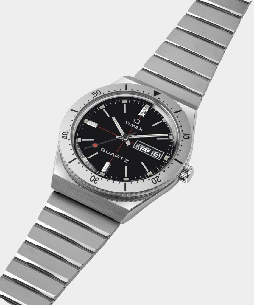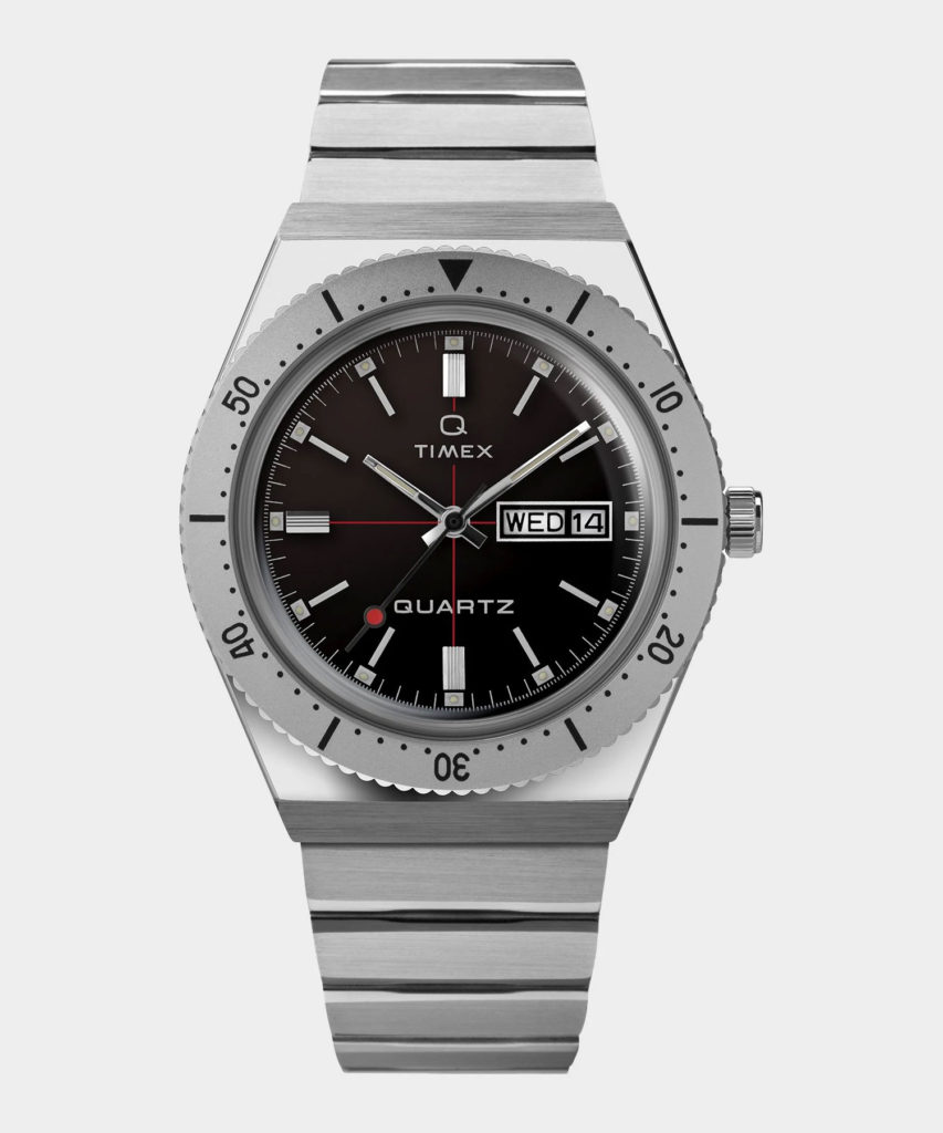 The Todd Snyder + Timex Q Bracelet Watch ($179.00) keeps some of the best elements of the original – day/date display, luminescent hands, GMT Master-inspired bezel – in a modern, 38mm matted stainless steel case with a newly designed minimalist bracelet that’s exclusive to Todd Snyder.