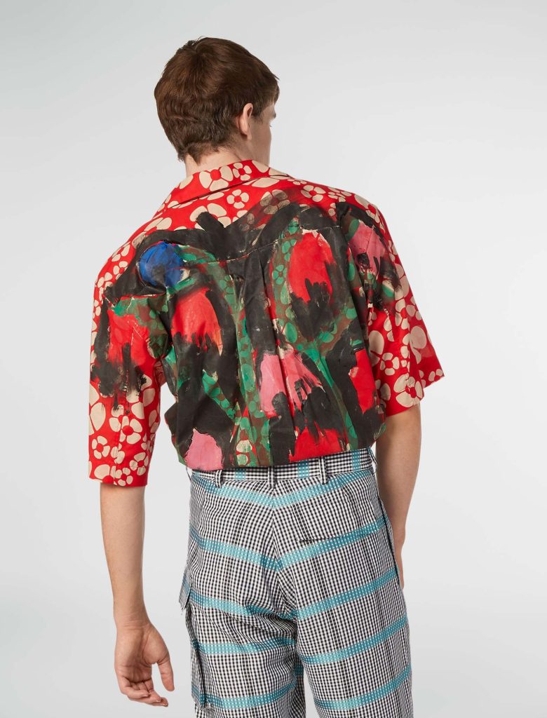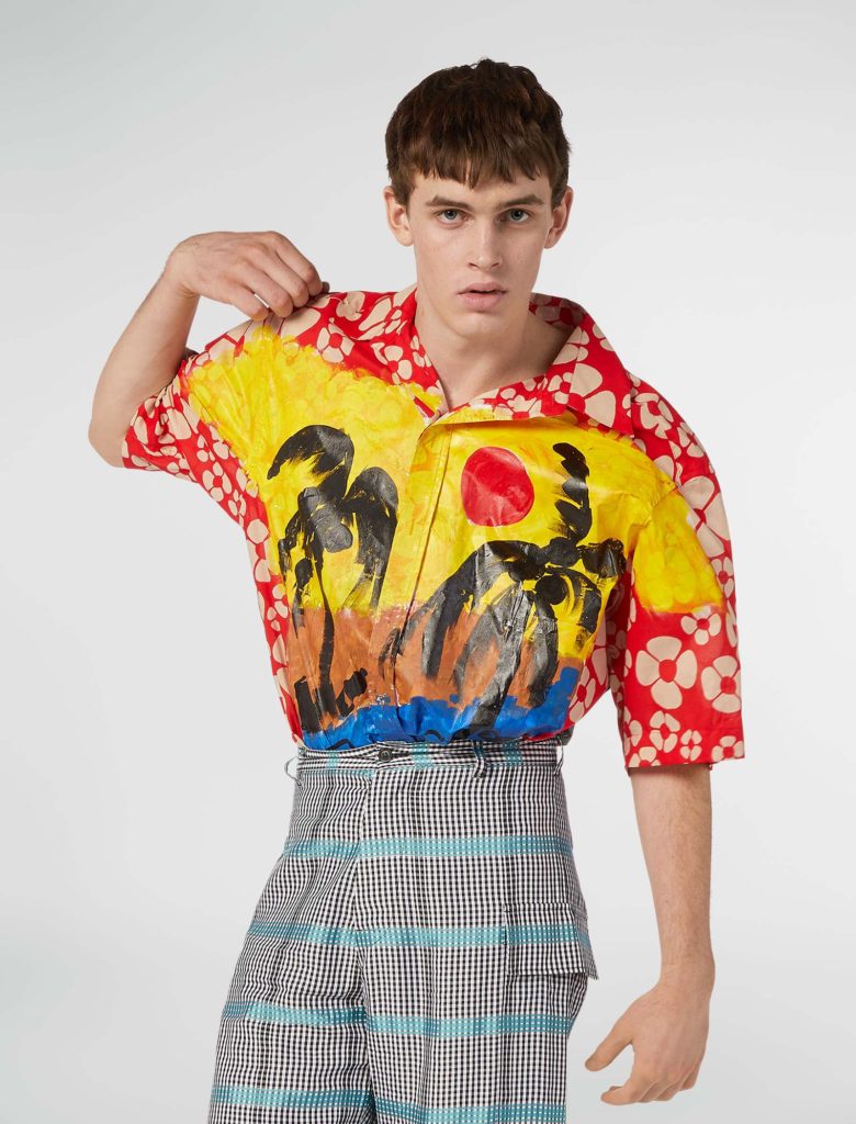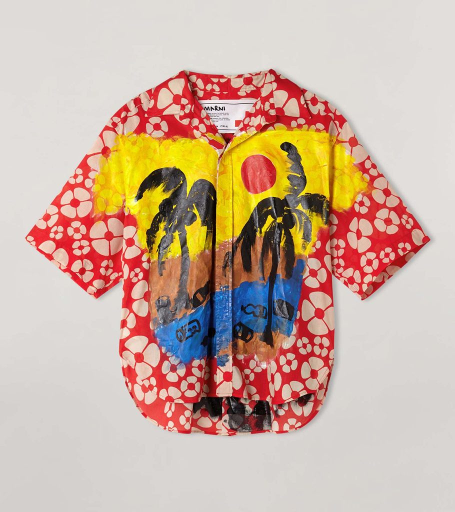 Marni’s creative director Francesco Risso used his SS20 runway show as a platform to raise awareness of the fashion industry’s impact on the environment. He presented a mix of slightly psychedelic patterns and painterly prints inspired by an imaginary affliction in a lush tropical jungle. A version of this multicolored shirt featured in the show. The final product is cut from white cotton poplin and decorated with a hand-painted tropical beach scene by Risso and his team in the Marni studio. Available in a limited run of only 50 shirts, the decorations fauvist style is deliberately naive, with aggressive brush strokes depicting a litter strewn beach – putting the collections message at the center of the design.