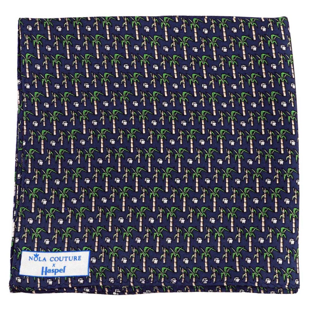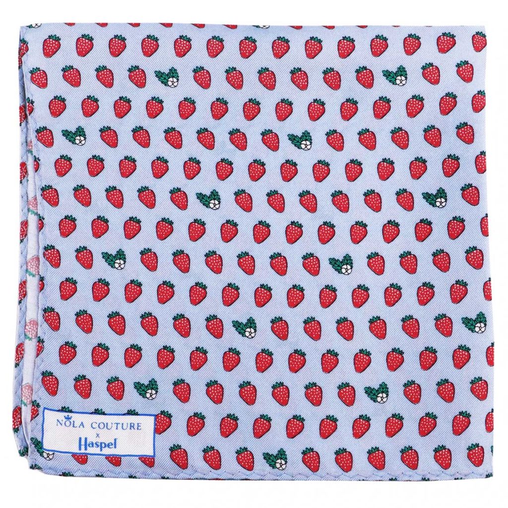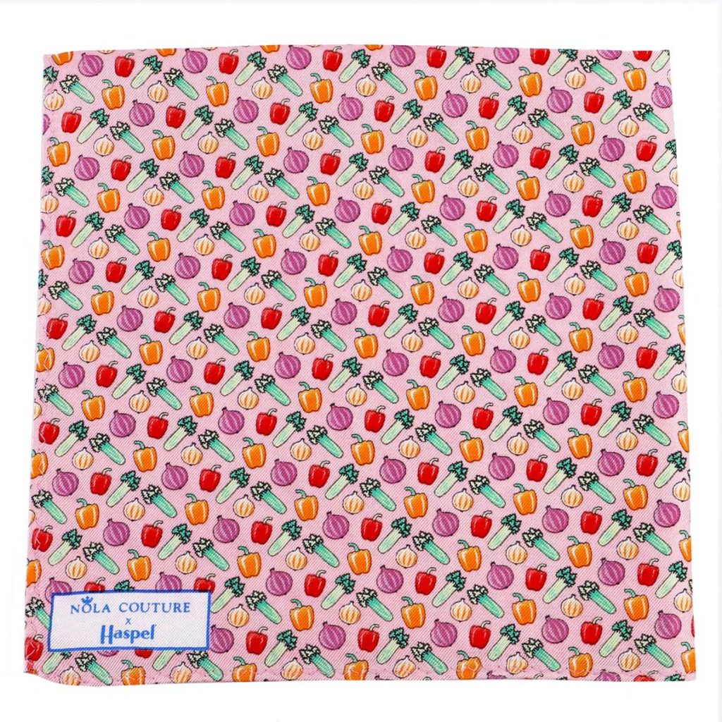 Now, Haspel is teaming up with NOLA Couture, another New Orleans native, on a collection that celebrates the vibrant culture and whimsical style of Louisiana. The 18-piece Haspel x NOLA Couture capsule features silk ties, pocket squares and bow ties covered with images of sugarcane, strawberries, magnolias, catfish, pelicans and the Cajun Holy Trinity (aka onions, celery and bell peppers – the key ingredients in all Cajun dishes). Designed to coordinate with Haspel’s seersucker suits, the silks come in navy, light blue, pink, lavender, yellow and red.