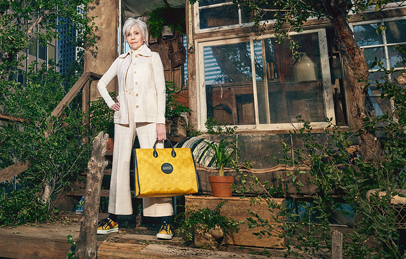 Academy Award-winning actress, producer, and activist Jane Fonda leads the Off The Grid launch campaign, which also includes Lil Nas X, King Princess, Miyavi and David Mayer de Rothschild – all wearing pieces from the collection. Conceived by Gucci’s creative director Alessandro Michele, the campaign was shot by photographer and director Harmony Korine in the most bucolic of settings.. a penthouse ‘tree-house’ – its still Gucci.