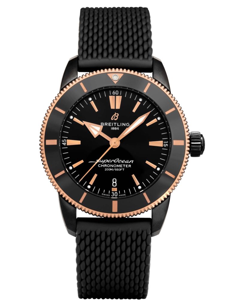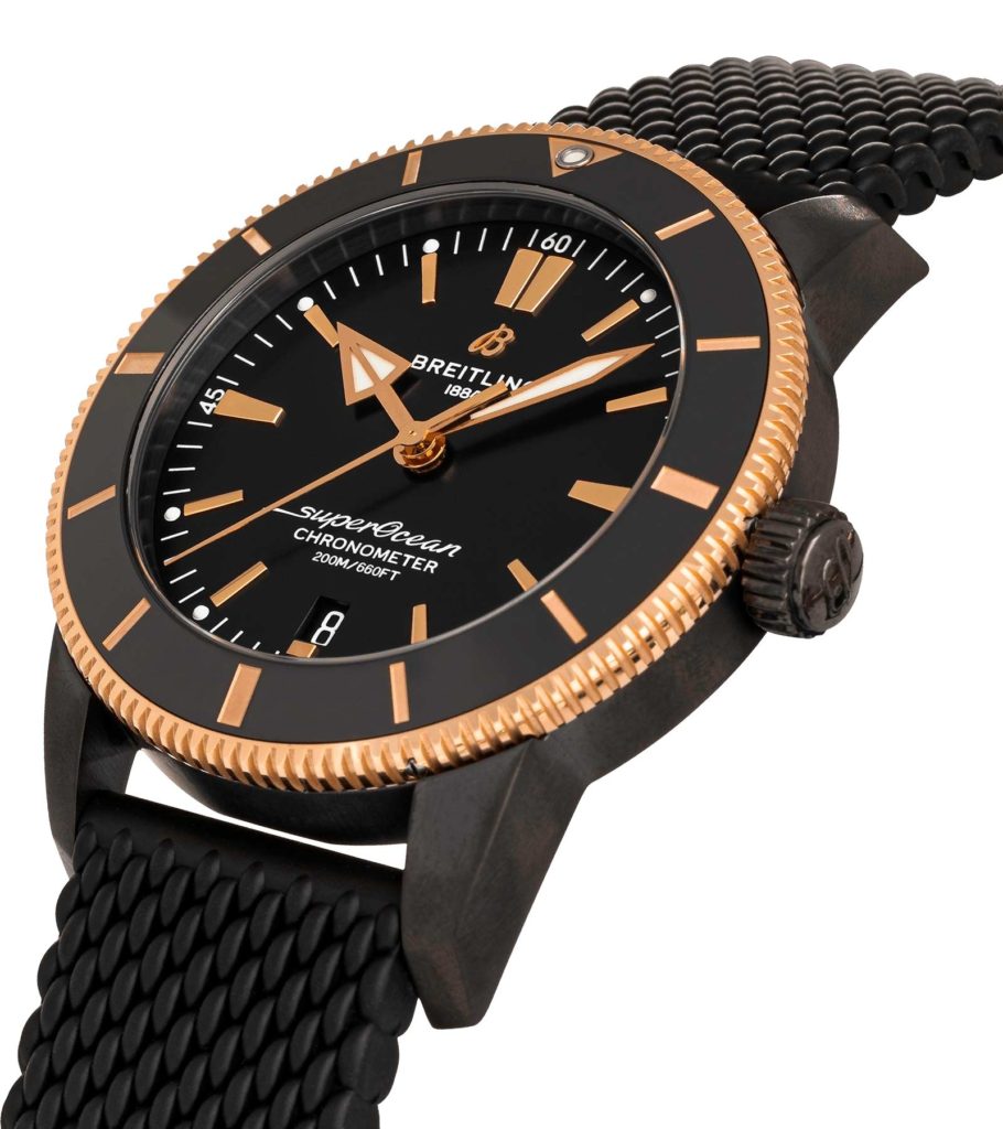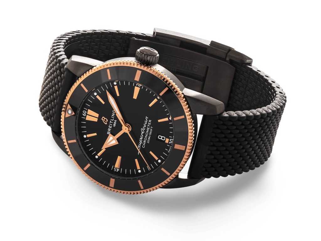 Celebrating Breitling’s new Beverly Hills Boutique, this diver is limited to 50 individually numbered pieces. The 44mm DLC-coated stainless steel case – water-resistant to an impressive 200 m (660 ft) – is topped with a though as nails ceramic bezel that is scratch-proof, shock-resistant and finished with an 18k rose gold edge. Its all powered by the Breitling Manufacture Caliber B20, a COSC certified chronometer based on the Tudor Caliber MT5612 that produces a professional level 70 hour power reserve.