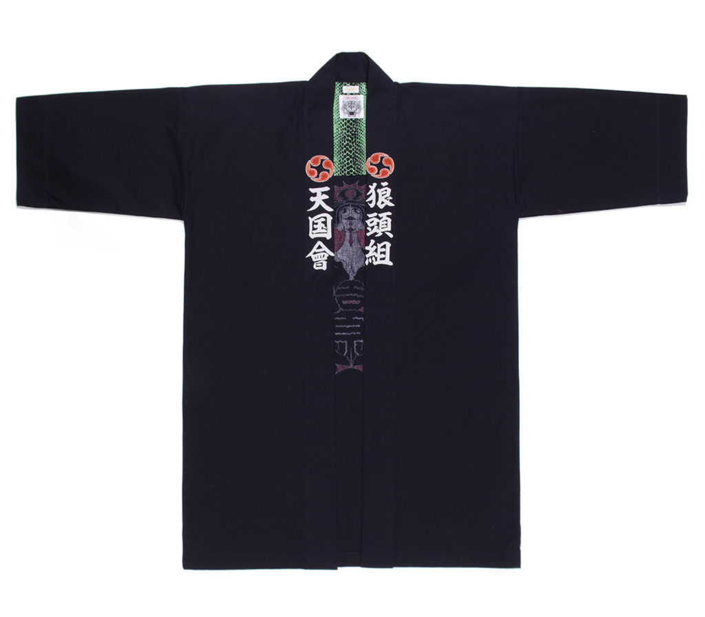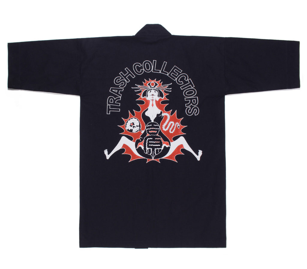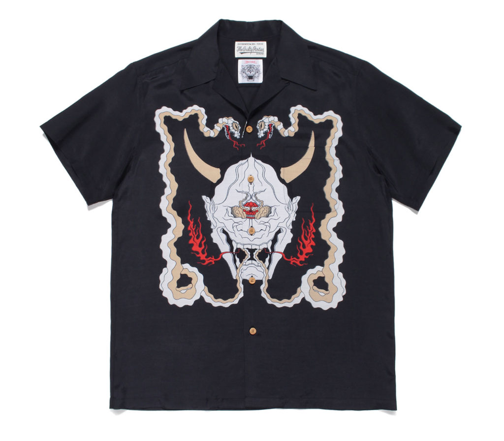 The Wolf’s Head x Wacko Maria SS20 collaboration continues to roll out with a fresh drop of six ’50s style camp-collar Hawaiian shirts, a cotton Hanten coat, Dabo shirt and Dabo shorts. Designed with Wolf’s Head founder Takashi Toda, the Hawaiian shirts featured two versions of an oni face (a kind of yōkai spirit figure from Japanese folklore) framed by snakes printed across the chest. The navy Hanten coat has a ‘Trash Collector’ graphic printed on the back and Japanese kanji embroidered on the collar. The Dabo shirt also features the ‘Trash Collector’ graphic printed on the back and a WA-neck collar design.