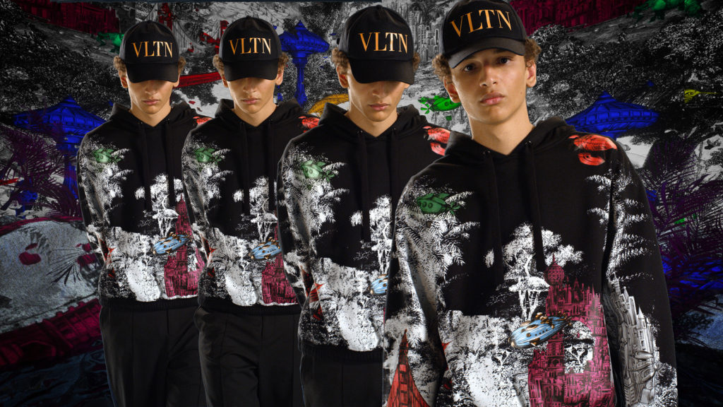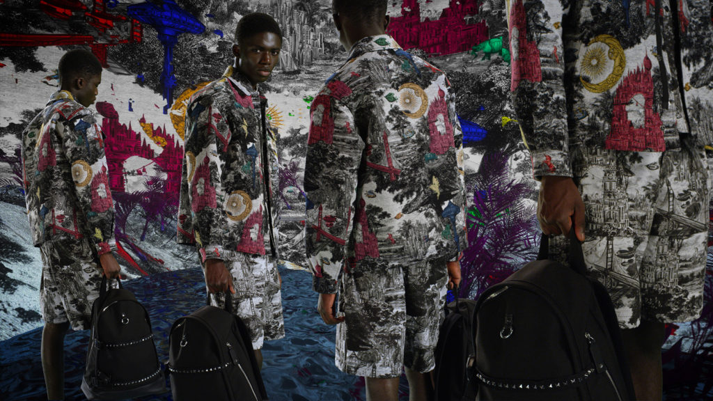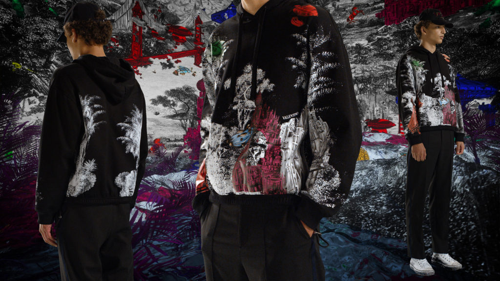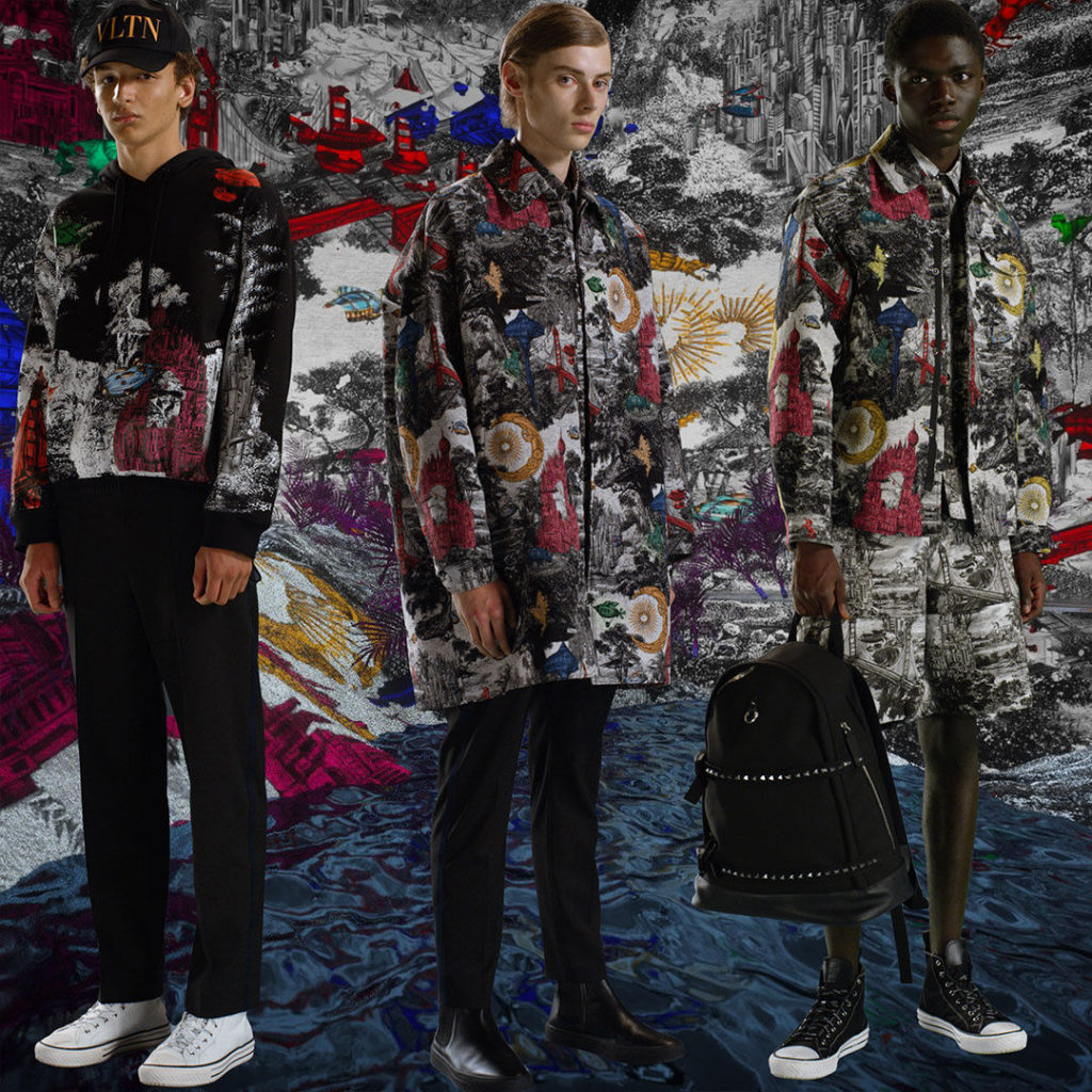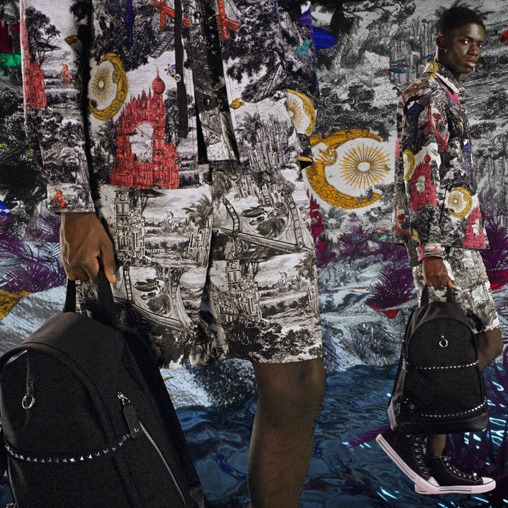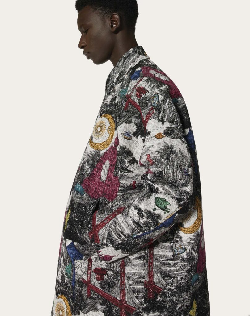 Valentino’s Creative Director Pierpaolo Piccioli brings a couture sensibility to his men’s Pre-Fall 2020 Dreamatic capsule. At the center of the collection is an all-over, monochrome print featuring a bucolic landscape rendered in the style of a Dürer woodcut. Emerging from the landscape is a fantastical vision of tomorrow filled with “ultra airships, giant bridges, sci-fi animals” and unicorns, some in fluorescent colors. The print is embellished with intricate three-dimensional details created by micro glass beads and metallic embroideries, enriching the fabrics with couture level complexity.