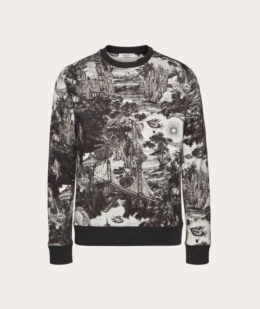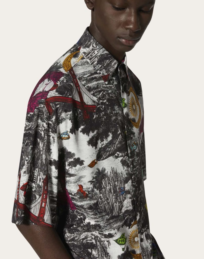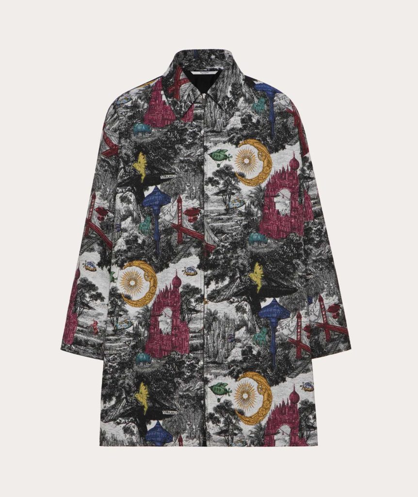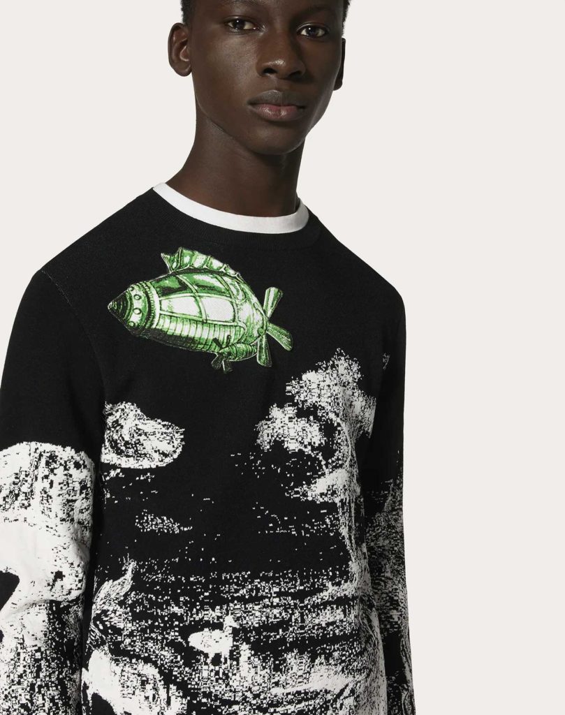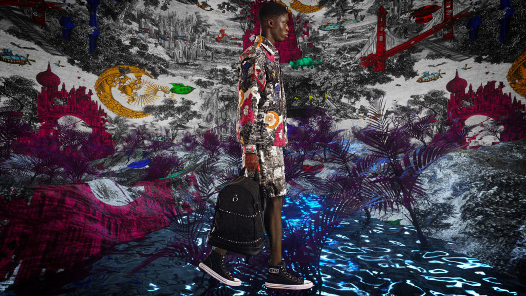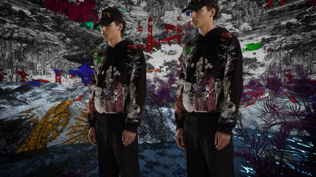 Valentino’s Creative Director Pierpaolo Piccioli brings a couture sensibility to his men’s Pre-Fall 2020 Dreamatic capsule. At the center of the collection is an all-over, monochrome print featuring a bucolic landscape rendered in the style of a Dürer woodcut. Emerging from the landscape is a fantastical vision of tomorrow filled with “ultra airships, giant bridges, sci-fi animals” and unicorns, some in fluorescent colors. The print is embellished with intricate three-dimensional details created by micro glass beads and metallic embroideries, enriching the fabrics with couture level complexity.