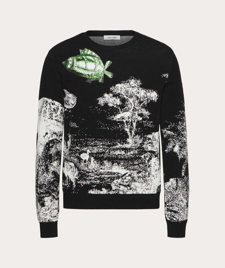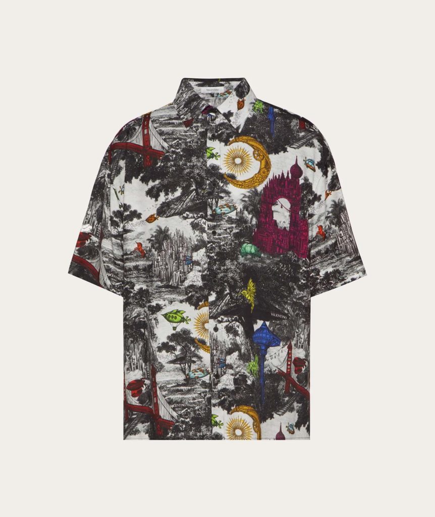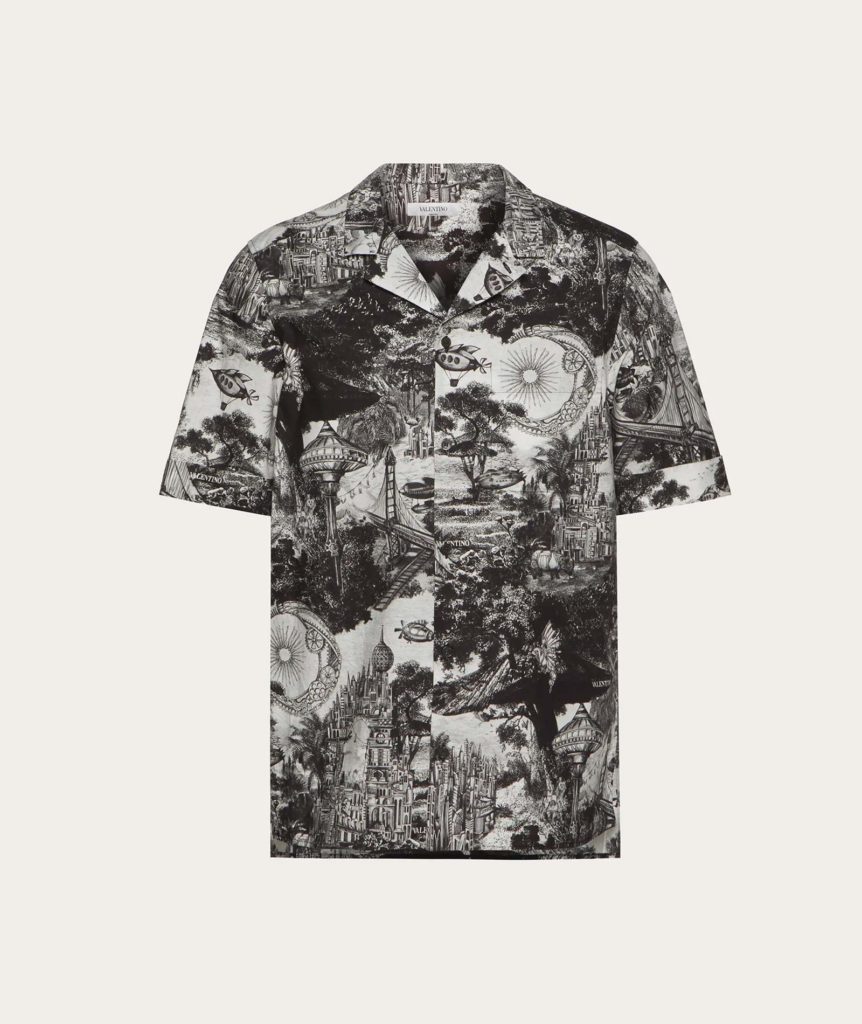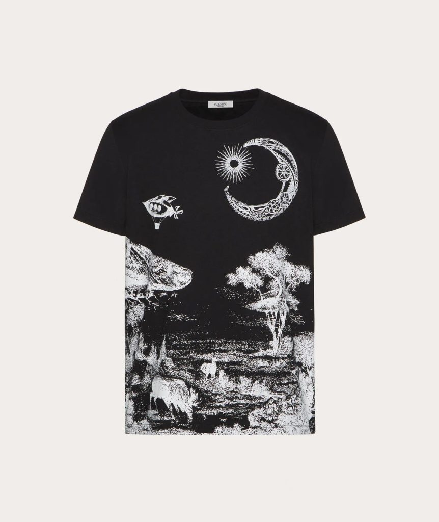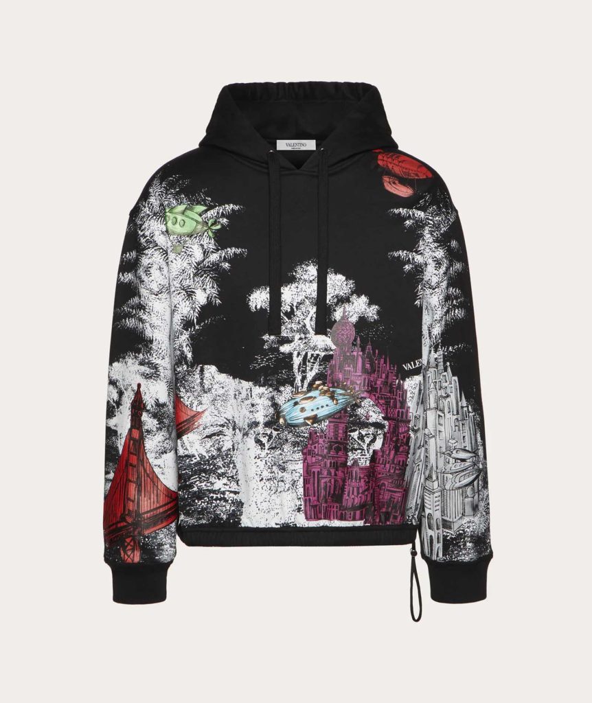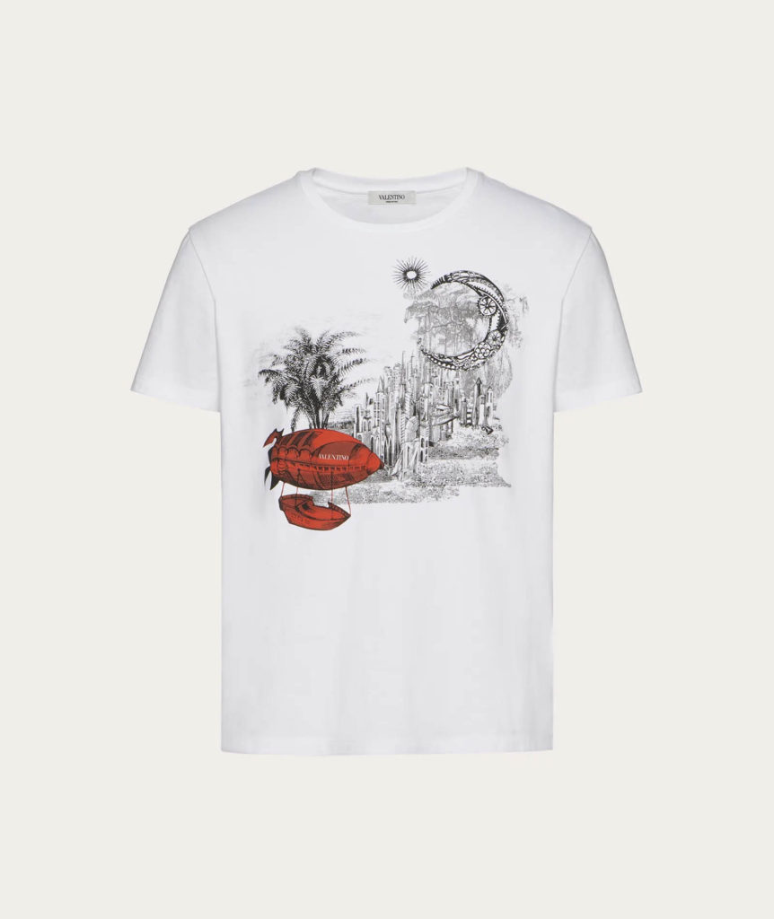 Valentino’s Creative Director Pierpaolo Piccioli brings a couture sensibility to his men’s Pre-Fall 2020 Dreamatic capsule. At the center of the collection is an all-over, monochrome print featuring a bucolic landscape rendered in the style of a Dürer woodcut. Emerging from the landscape is a fantastical vision of tomorrow filled with “ultra airships, giant bridges, sci-fi animals” and unicorns, some in fluorescent colors. The print is embellished with intricate three-dimensional details created by micro glass beads and metallic embroideries, enriching the fabrics with couture level complexity.