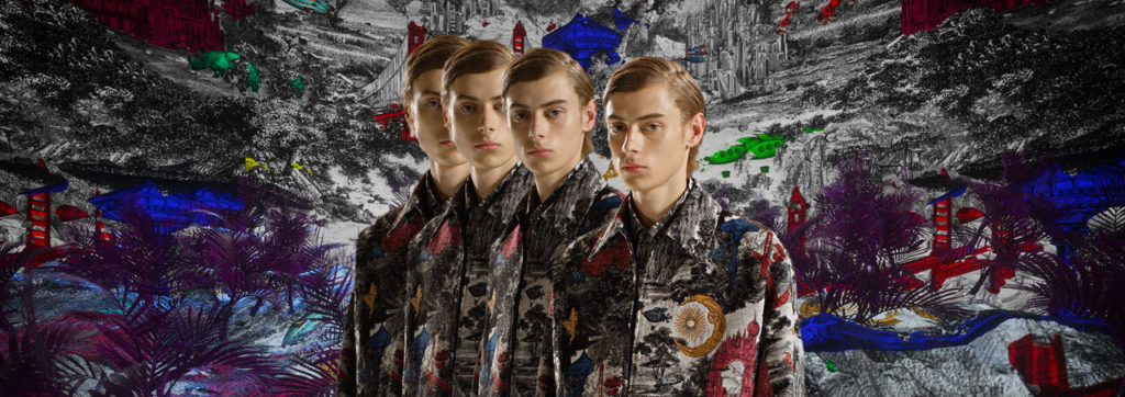 Valentino recruited London-based film director and digital artist YH Fong to create the imagery used in the Dreamatic campaign. Fong blew up the all-over print and used digital editing to create a seamless background for models Jethro Sapon, Berko Fourdjour and Callum Heslop.
