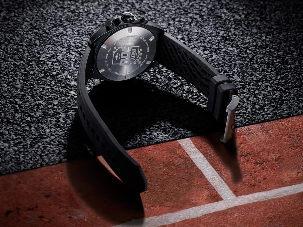 Designed in collaboration with the IndyCar team, the 43 mm chronograph honors the long-standing partnership with a brick motif on the dial, a reference to the racetrack’s “Brickyard” nickname. The black dial also features three sub-dials: 3 o’clock permanent second indicator, 6 o’clock hour chronograph counter and 1/10th second chronograph counter embellished with the Indy 500 logo, and a 9 o’clock minute chronograph counter, with a date window at 4 o’clock. The Indy 500 logo is displayed on the 6 o’clock sub-dial with “Indy 500” engraved in red on the ceramic bezel.
