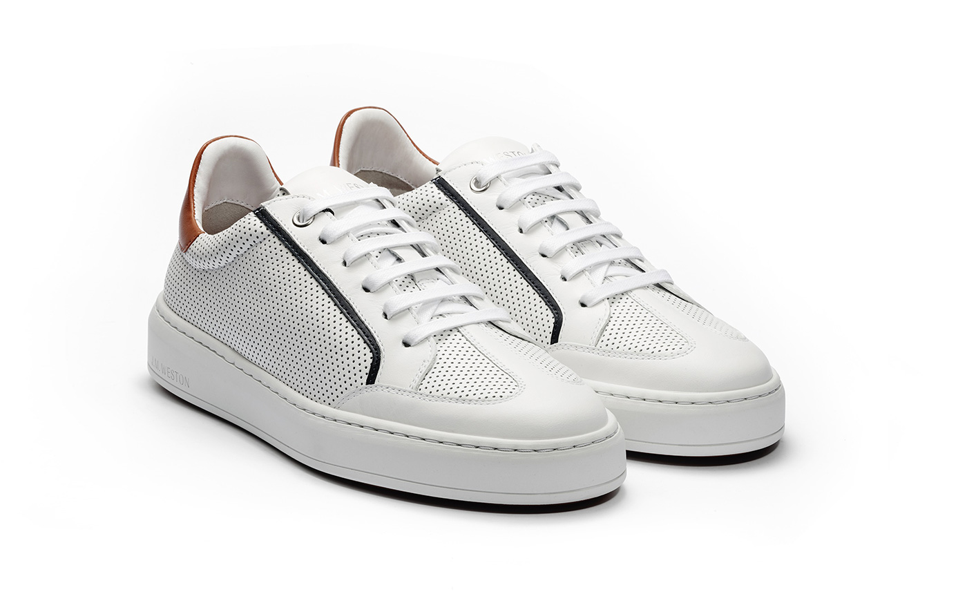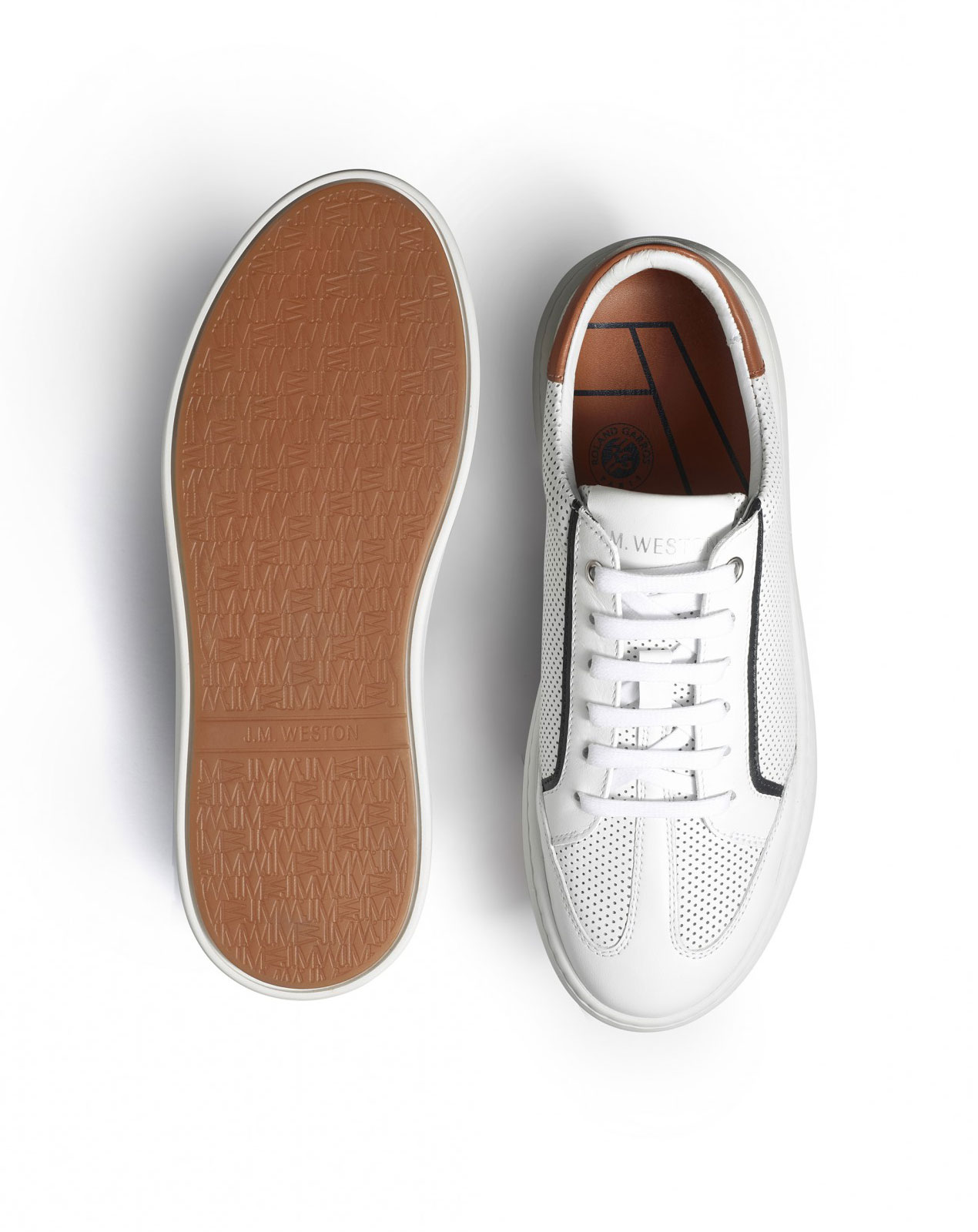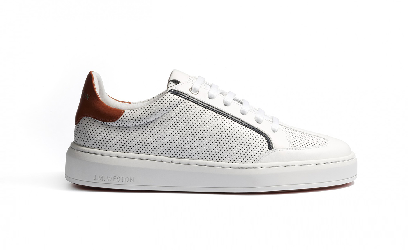 Here’s an example of unintentional irony. J.M. Weston created a new unisex sneaker dubbed the On Time for this years French Open. Then in March – as COVID 19 spread through Europe – the French Tennis Federation postponed the Grand Slam tournament, twice. Whatever the timing, the sneakers vintage inspired, minimalist design is completely intentional. Perforated white calfskin adds texture to the uppers, while blue piping and a hints of terracotta orange, a nod to the clay courts, add color. The shoes are finished with double seams, metal eyelets and a new monogrammed rubber sole.