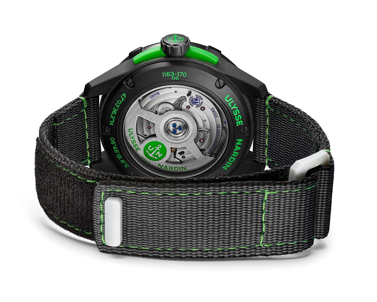 As part of its ongoing commitment to preserving the marine environment and creating a circular economy, Ulysse Nardin partnered with Fil&Fab to create an innovative concept watch made with upcycled plastics. The case, middle, back and bezel of the new Ulysse Nardin DIVER NET are fabricated from these recycled nets. The strap is woven with yarn made by Swiss company Tide from recaptured ocean plastic. Inside the case, acid green Superluminova on the hour markers and hands improve visibility in low light. The dial also features a power reserve indicator at 12 o’clock, as well as a date window and a small second hand at 6 o’clock. The silicon technology of the in-house UN-118 movement can be admired through the back of its 44mm case.