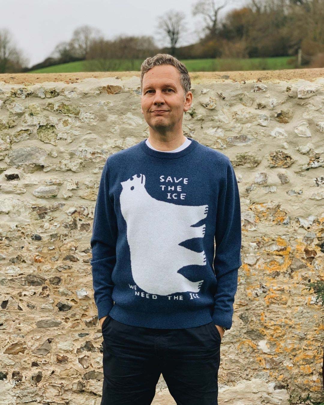Sunspel teamed up with artist David Shrigley on a capsule collection of modern Christmas sweaters with a message. Known for his caustic illustrations of the bizarre and often mundane elements of everyday life, Shrigley created a set of exclusive illustrations focused on environmental responsibility and sustainability. Combining animal motifs with slightly sarcastic messages like “Protect The Cold Places, And The Other Places” and “Yes To Icebergs, No To Zoos,” the drawings are printed on t-shirts and sweatshirts, and applied to English spun lambswool sweaters using a contemporary jacquard knit. All of the lambswool used in the collection carries the Woolmark certification, meaning producers follow specific animal welfare and sustainable land use practices. Sunspel will donate 10% of the profits from each garment sold to Stump Up For Trees – a community-based charity focused on enhancing biodiversity through woodland creation and preservation.