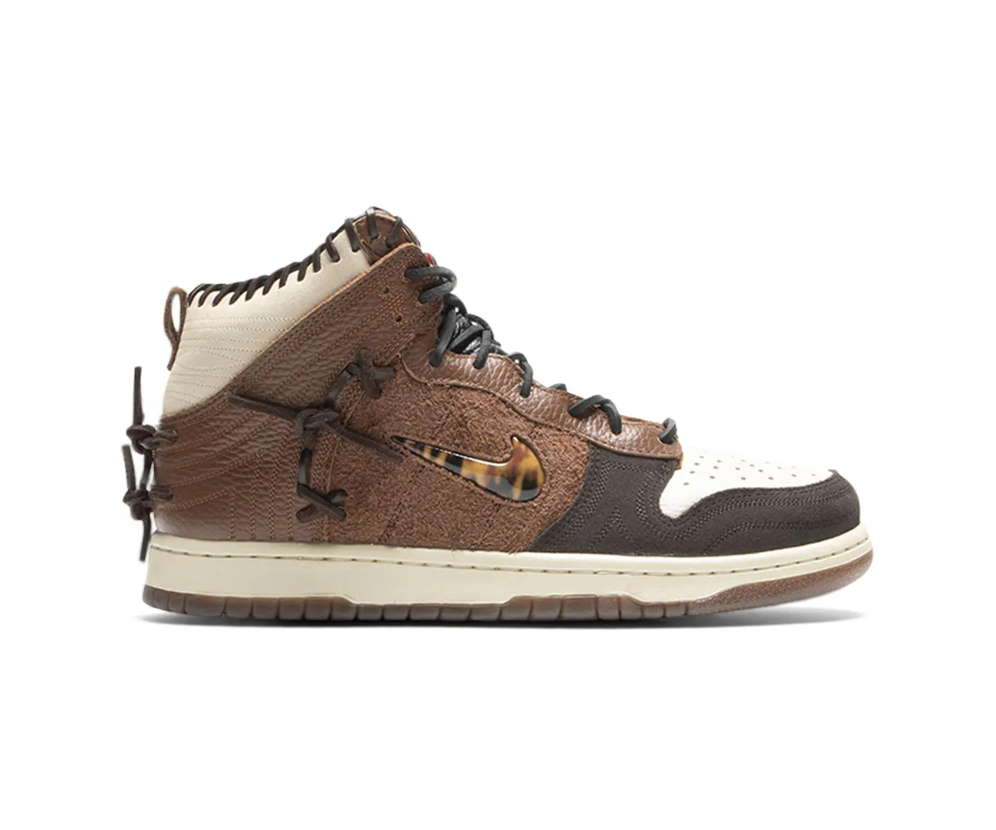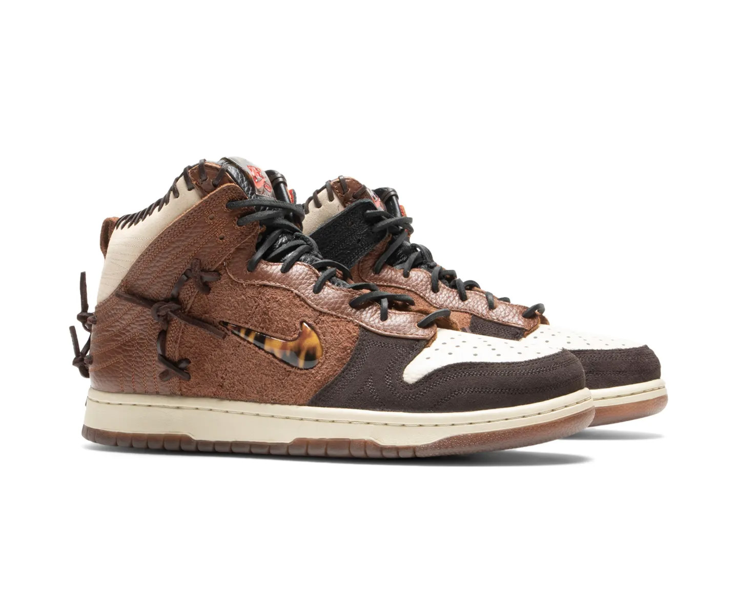Connecting two of Boston’s biggest sporting fandoms, the Nike x Bodega Dunk High respects the hi-tops basketball roots while adding nostalgic nods to baseball to the design. The uppers rich pebble leather, rawhide lacing and boot stitch detailing reference old-fashioned baseball mitts. Modern elements are incorporated with embossed ‘Bodega’ branding opposite a tortoiseshell, jewel Nike Swoosh.
