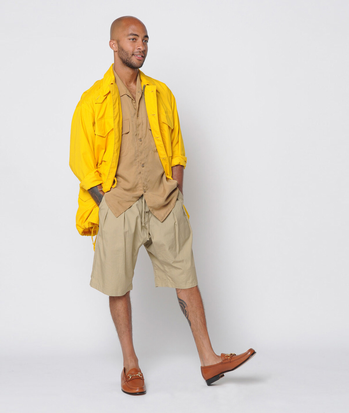 For Spring/Summer 2021, Monitaly’s founder Yuki Matsuda adapted his winning mix of workwear, Americana and Military surplus to the WFH era. Along with the fan favorite cargo pants and chore jackets, you’ll find easy, voluminous looks like, an oversize jersey tee with high-rise chinos accentuated by pressed pleats, wide legs and cropped hems, or a series of woven Baja ponchos, and paperbag waist drawstring lounge pants paired with a simple singlet. Matsuda also offers made in the USA masks, some with fully coordinated head-to-toe looks.