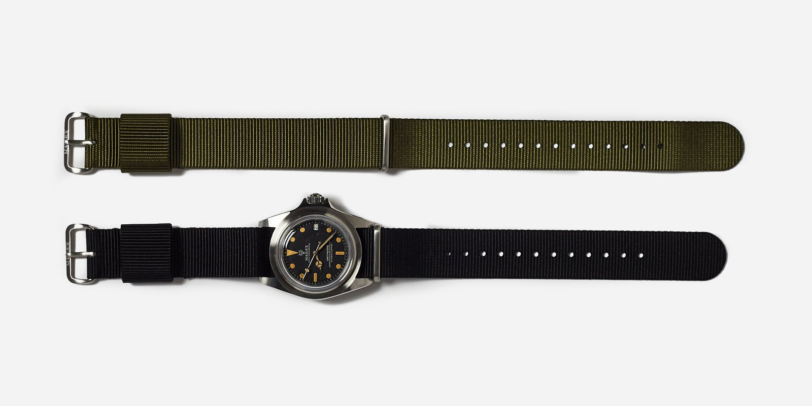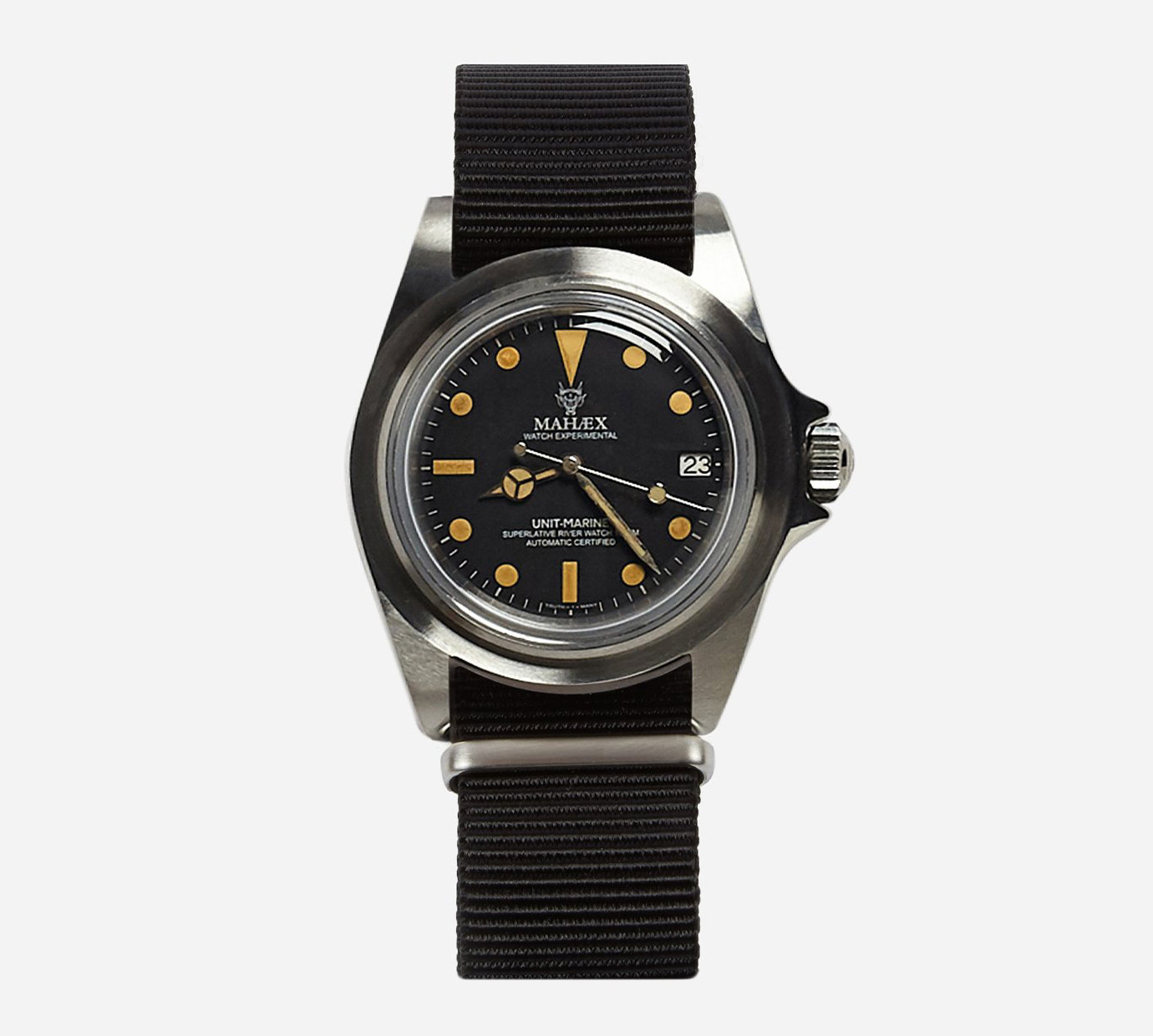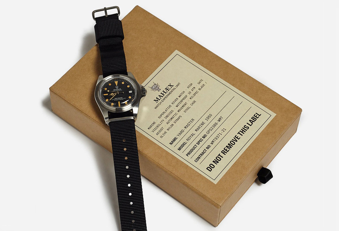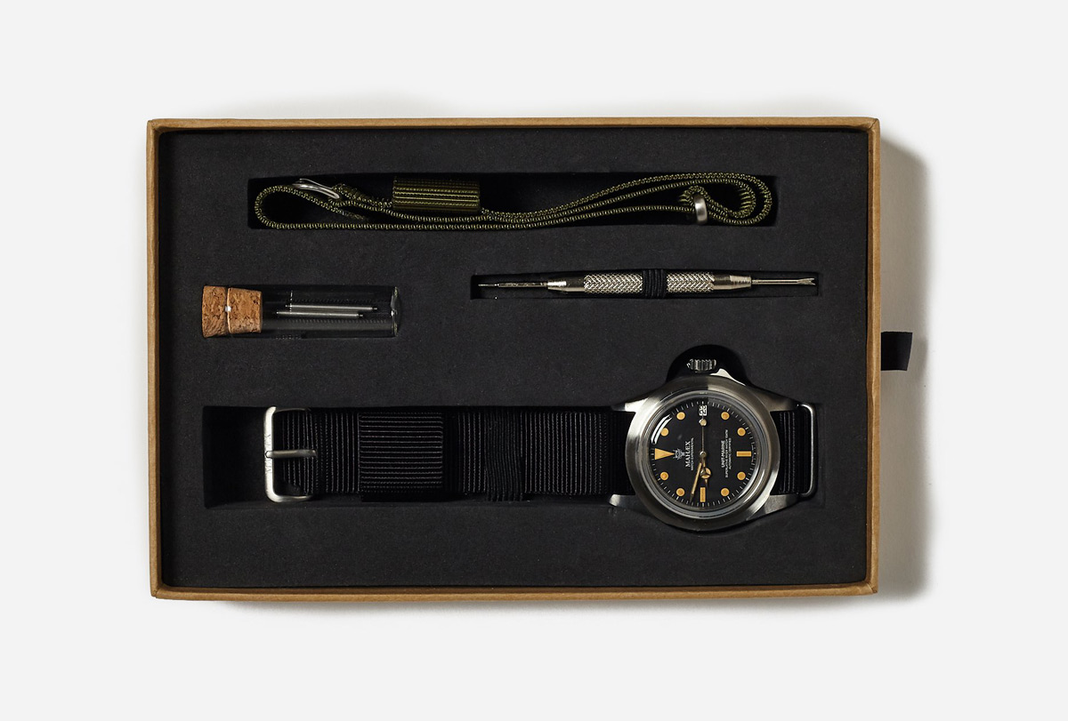 Produced in collaboration with Watch Experiment Unit, the Royal Marine 1950 has a vintage feel with an aged dial inside the steel case. The ‘M. Rishi’ signature on the case-back mirrors the ‘M. Brando’ marking on the back of the original watch, hand-engraved by Marlon Brando himself. Each limited edition watch comes in a specially designed box with interchangeable olive and black Mil-Spec nylon straps, spare pins and a watch tool.