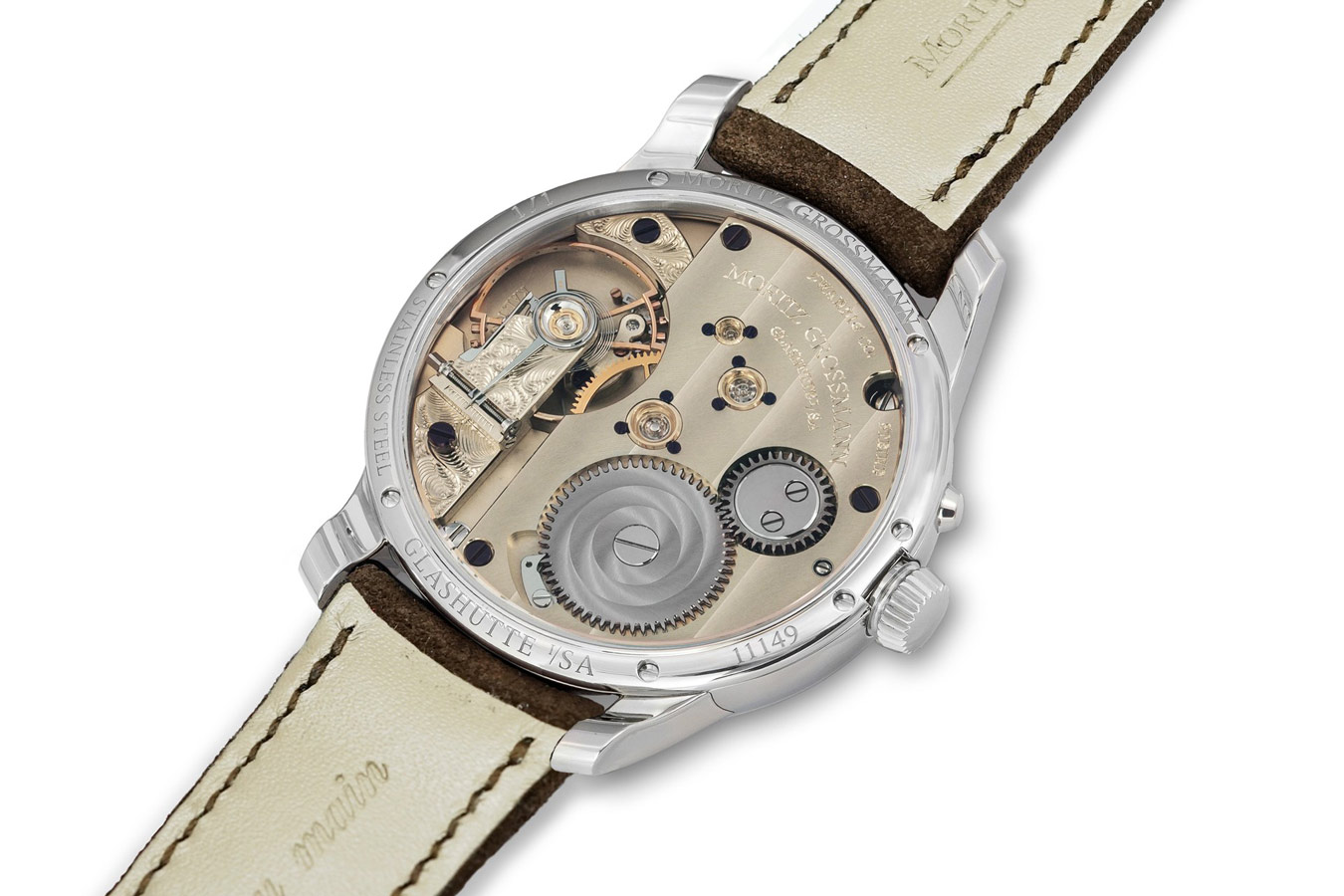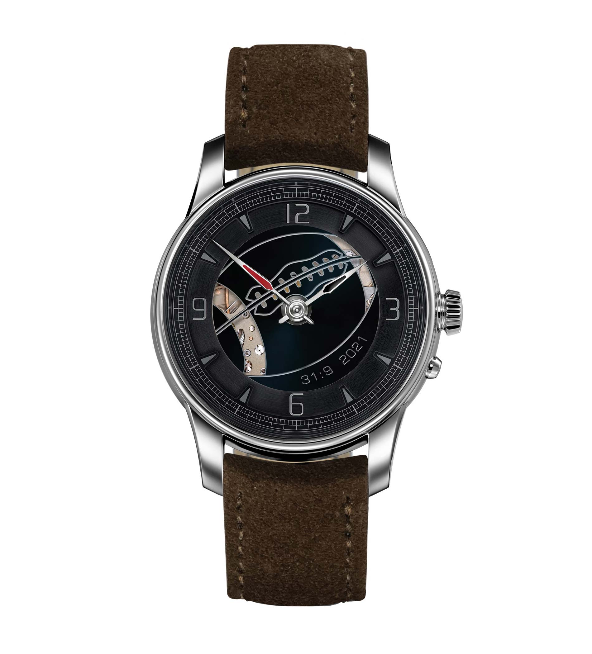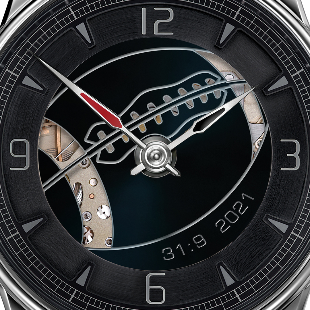 With the new ‘Super Bowl 2021’ Tampa Bay Buccaneers watch, Moritz Grossmann continues its annual tradition of creating special edition tributes for the NFL champions. Available exclusively in the U.S., the watch features a high-gloss football emblazoned on the black dial above an engraving of the year and final score of the game. Honoring the Bucks, the tips of the hour and minute hands shine in red and black, the team colors. The transparent back of the stainless steel case offers an unobstructed view of the manufacture caliber 100.1’s ratchet wheel, hand-engraved balance cock adorned with floral motifs, golden chatons, and violet screws – just some of the 198 components characteristic for the Glashütte manufacturer.