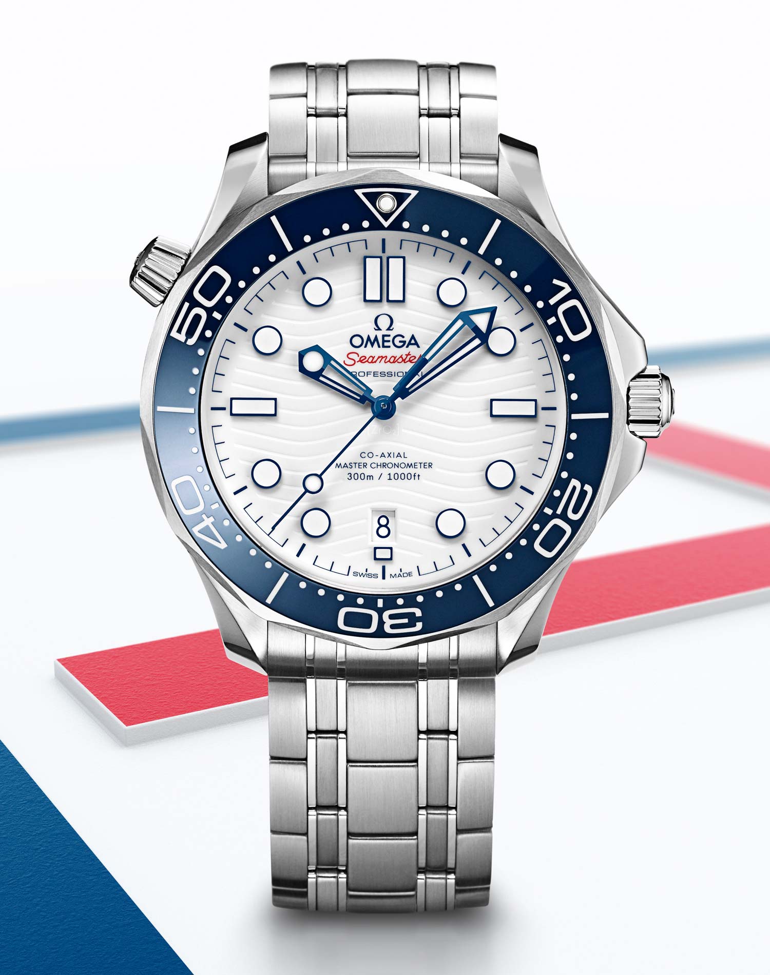 Tokyo 2020 marks Omega’s 29th time serving as the Official Timekeeper of the Olympic Games. In almost 90 years of sponsorship, the lead up to the Games has never been this long. This is the first time the event has been reschedule rather than canceled. Originally due to start on July 24, 2020, this years Summer Olympics will still be dubbed Tokyo 2020 despite the postponement. To kick off the 100 day countdown, Omega just introduced the Seamaster Diver 300M Tokyo 2020. Crafted in stainless steel, the 42mm case is topped by a blue ceramic bezel ring engraved with a white enamel diving scale. The white ceramic dial features the 300M’s signature wave pattern with a date window at 6 o’clock, and luminescent hands and indices – all in a color scheme inspired the Games official emblem of 45 indigo rectangles on a white field. Omega’s certified Co-Axial Master Chronometer Calibre 8800 is visible through the sapphire crystal case-back. Each timepiece comes in a special co-branded Olympic Games presentation box.