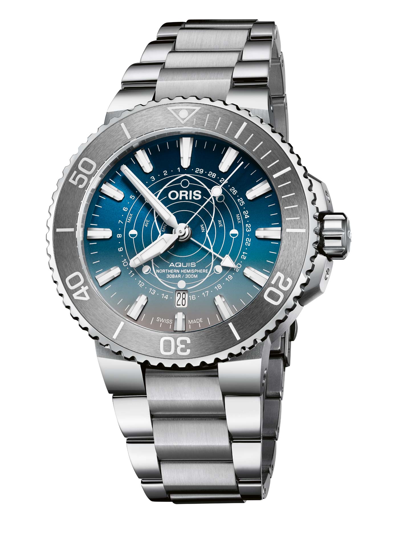Based on the Aquis diver, the Dat Watt’s blue dial displays the lunar and tidal cycles in the Norther Hemisphere via the Pointer Moon function – originally created by Oris for professional divers. This function works using a central white pointer hand that once aligned with the correct day in the 29.5-day lunar cycle, shows the corresponding tidal range via the white outline on the dial. The same hand indicates the waxing and waning of the moon. A true diver, the 43.50 mm stainless steel case is water resistant to 300 meters and features a unidirectional rotating bezel, and luminous hands and indices. Each watch is individually number and comes in a special presentation box. The 2,009 piece edition corresponds to the year the Wadden Sea was awarded UNESCO World Heritage Site status.