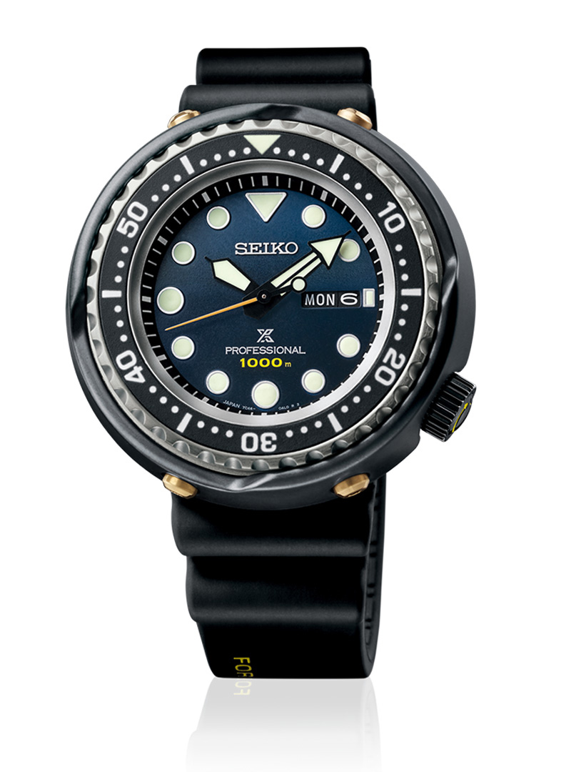 The Prospex 1986 Quartz Diver’s 35th Anniversary Limited Edition keeps the spirit of the mid-70s design while upgrading the features and professional specs. Equipped with Seiko’s 7C46 quartz movement, it still has the 1000m water resistance and helium resistance that saturation diving requires. The new gradient dial – fitted with luminous hands and markers – changes from blue to black, mimicking the way light gradually fades on decent. The familiar one-piece titanium case with its outer protection structure delivers exceptional shock resistance. A vivid yellow ‘lock’ sign and arrow on the crown combined with a yellow winding stem make it easy to ensure the crown is locked before a dive. Available in a limited edition of 1,200 pieces, the watch comes with two extra strength silicone straps.