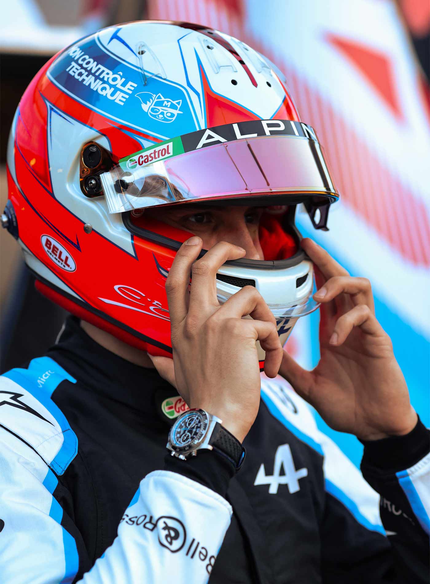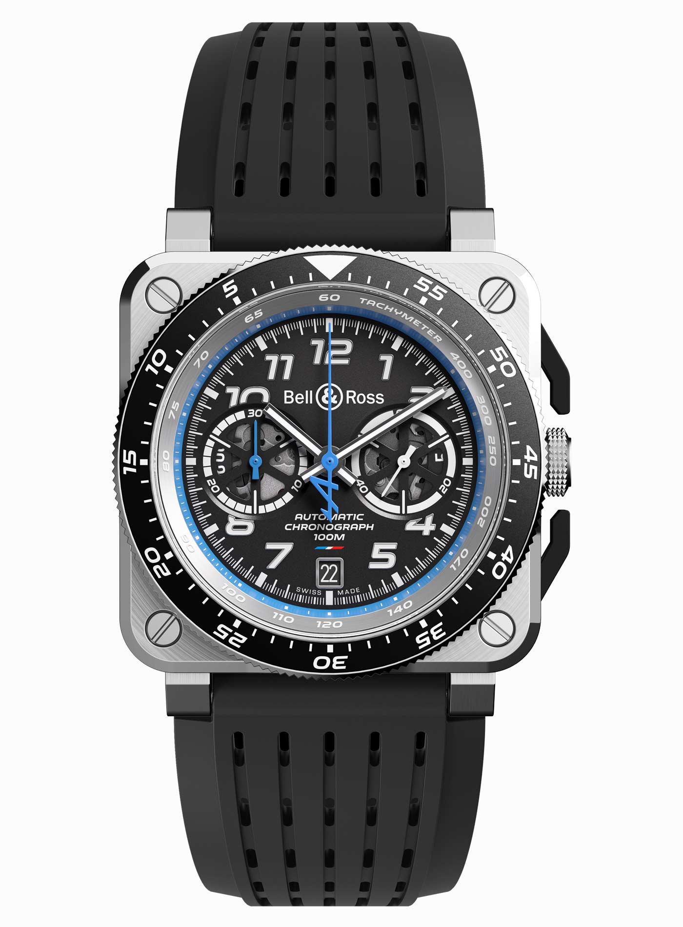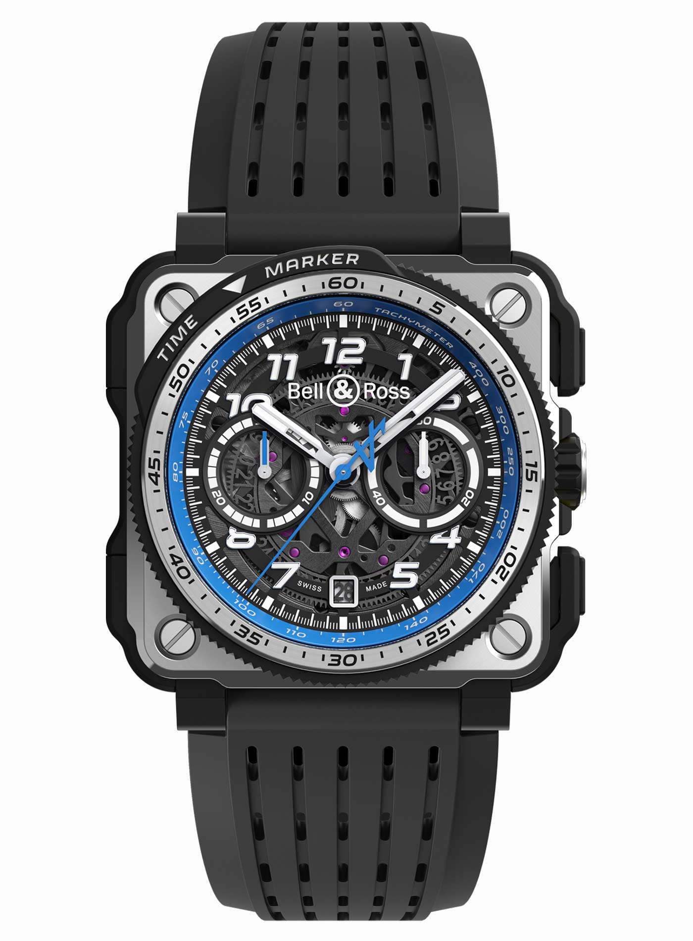 Bell & Ross BR-X1 A521 – Set in the B&R’s signature “circle in a square” case, this is the most innovative model in the Alpine F1 collection. Its 45-mm case combines grade-5 titanium, ceramic and rubber. A rubber shell surrounds the case to protect it from impacts. The ergonomic design of the toggle push-buttons – made from titanium covered in rubber – reference the steering wheel paddles of Formula 1 racing cars. The bezel is divided into a fixed, graduated section made from titanium and the rotating aluminum ring, covered with black PVD. Inside the case, a glazed black skeleton dial offers a view of the symbolic X-shaped central bridge and moving balance spring. Limited to 50 pieces ($21,500.00). Available now at bellross.com.