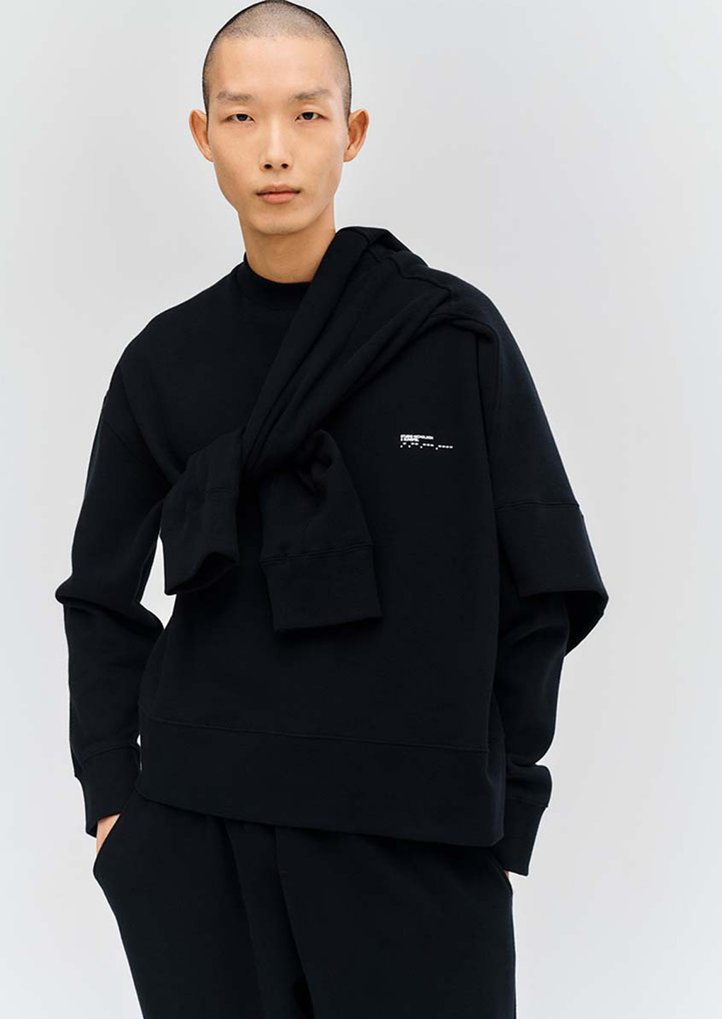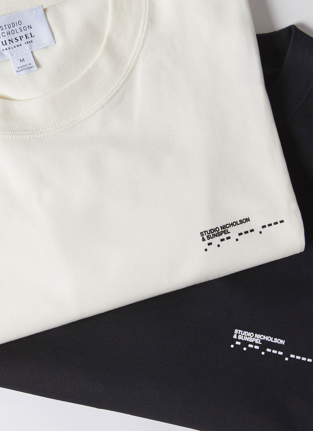 Studio Nicholson partnered with Sunspel to create a monochrome capsule collection of elevated jersey separates. A trailblazer in the production of lightweight cotton clothing, Sunspel has been manufacturing some of the world’s finest t-shirts and undergarments for over 160 years. Studio Nicholson founder Nick Wakeman used the brands expertise in fabrication to produce the range of ‘Milk and Black’ unisex separates cut from Sunspel’s exceptionally soft mid-weight cotton jersey, engineered Cotton Stretch Jersey and the Cotton Loopback – finished in fleece for a softer handle. Designed to be worn together in sets, each piece features the words Sunspel and Studio Nicholson spelled out in Morse code. According to Wakeman, “This isn’t loungewear. They’re definitely not made for ‘slobbing about’ in. We approached every element with the same reverence as a woven garment – incorporating attitude with elevated, well-fitting shapes and the persistent pursuit of the ideal fit. These are definite silhouettes.”