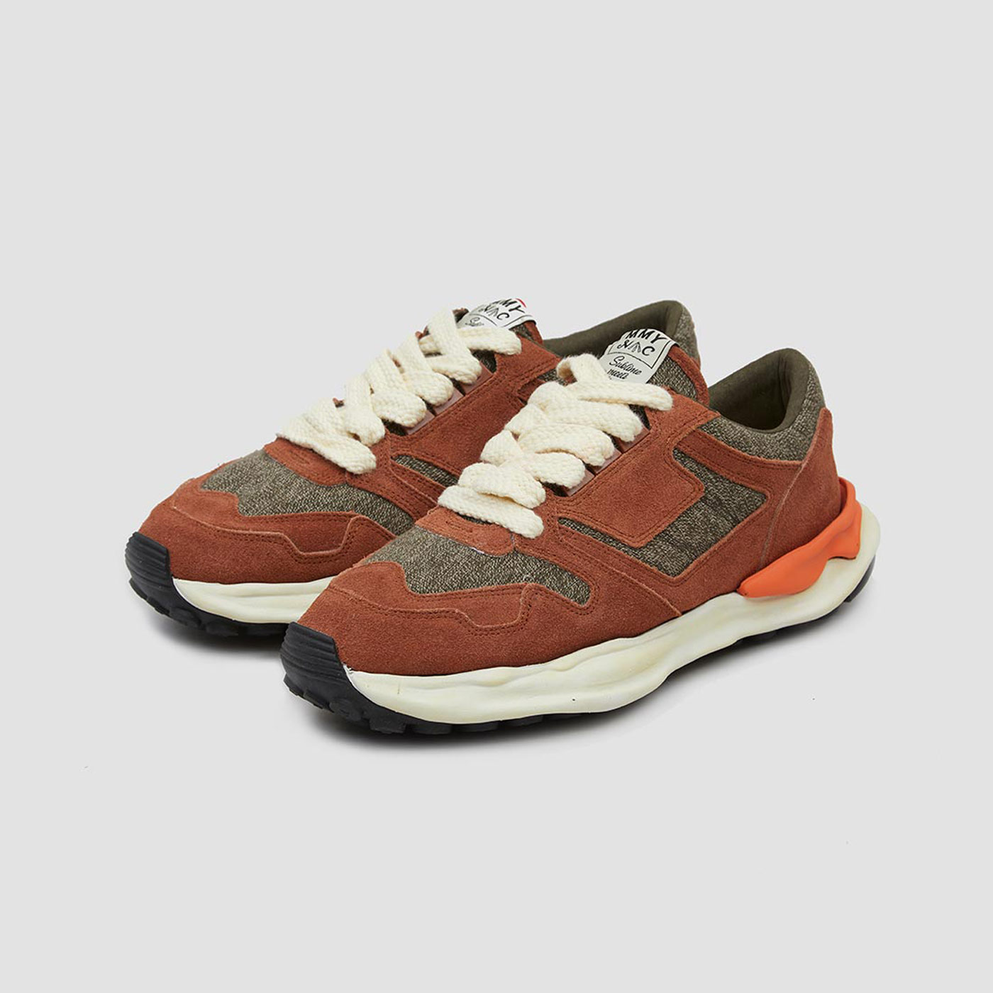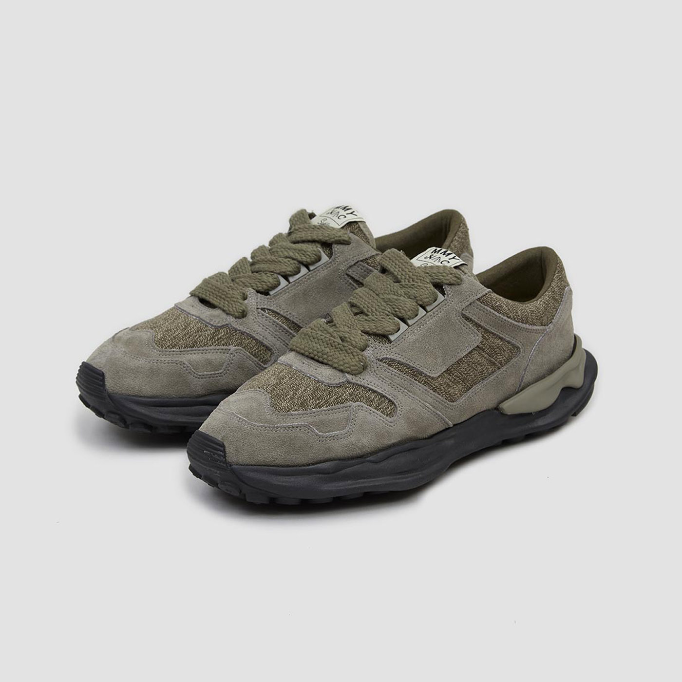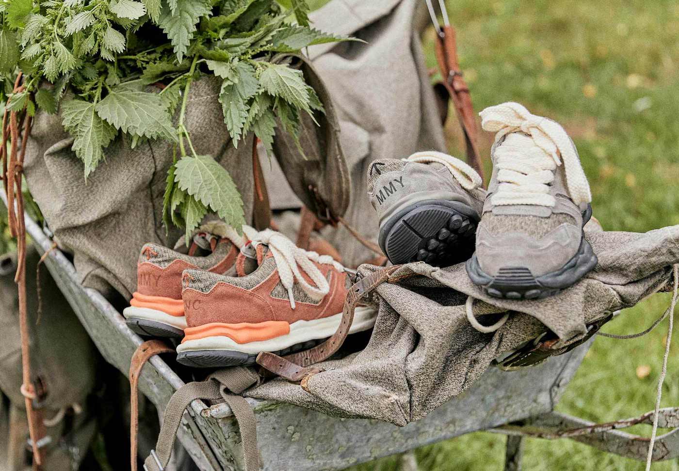 The Swiss Army Rucksack inspired Nigel Cabourn’s latest collaboration with Japanese designer Mihara Yasuhiro. Dating back to the Napoleonic wars, the bags heavy-duty canvas was traditionally made by blending cotton yarns with stinging nettle fibers, creating a unique salt and pepper ‘blurring camo’ pattern. Yasuhiro recreated the technique in Japan using 100% cotton to produce two exclusive versions of the Mihara Running Trainer in Rough Tan & Swiss Green. The sneaker mixes rough suede and mesh paneling with oversize laces and Yasuhiro’s signature ‘ripple’ sole.
