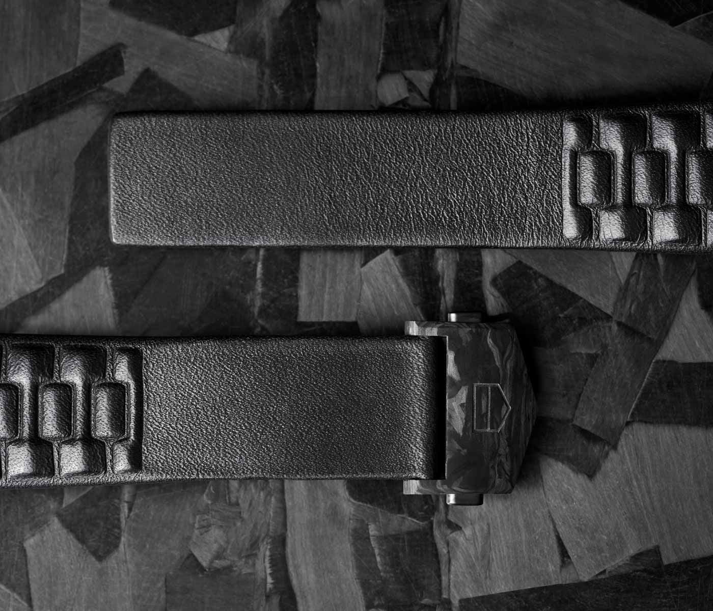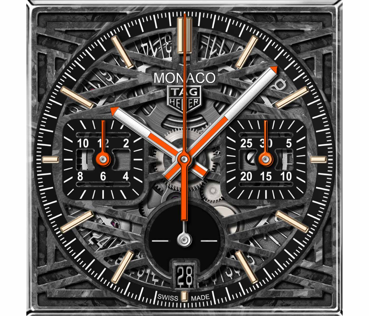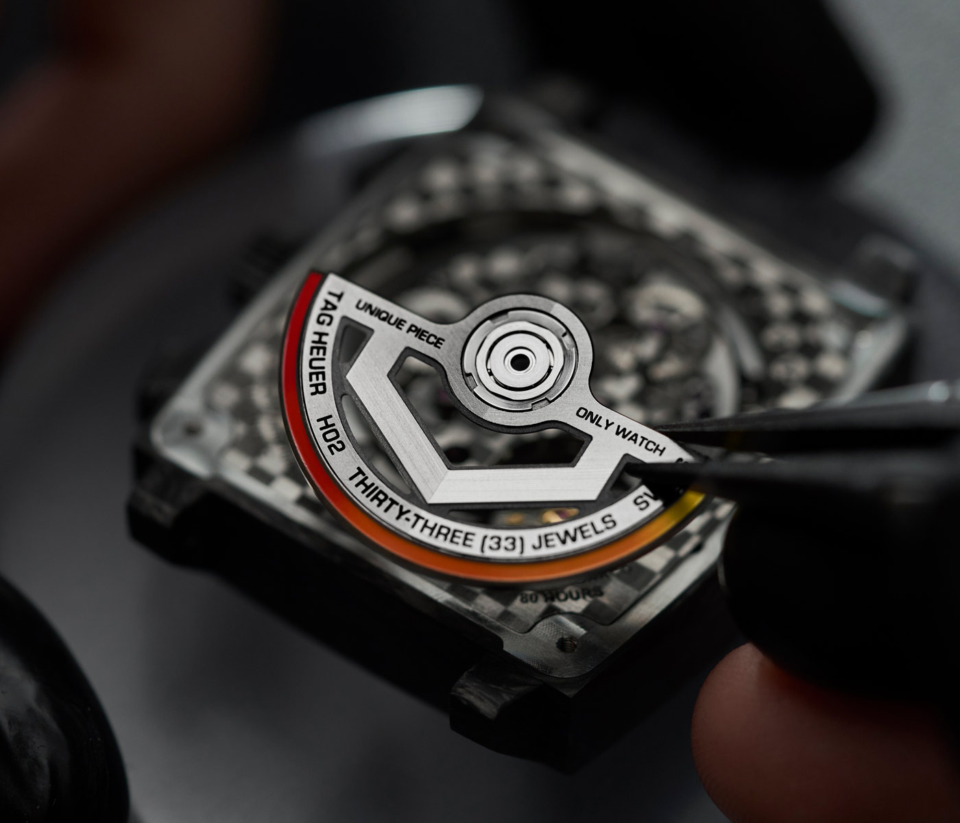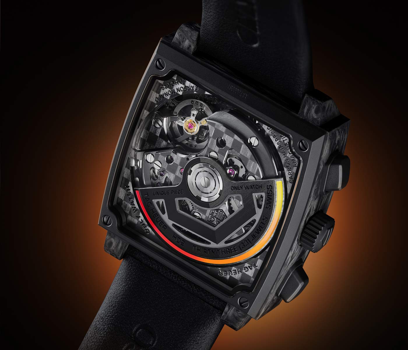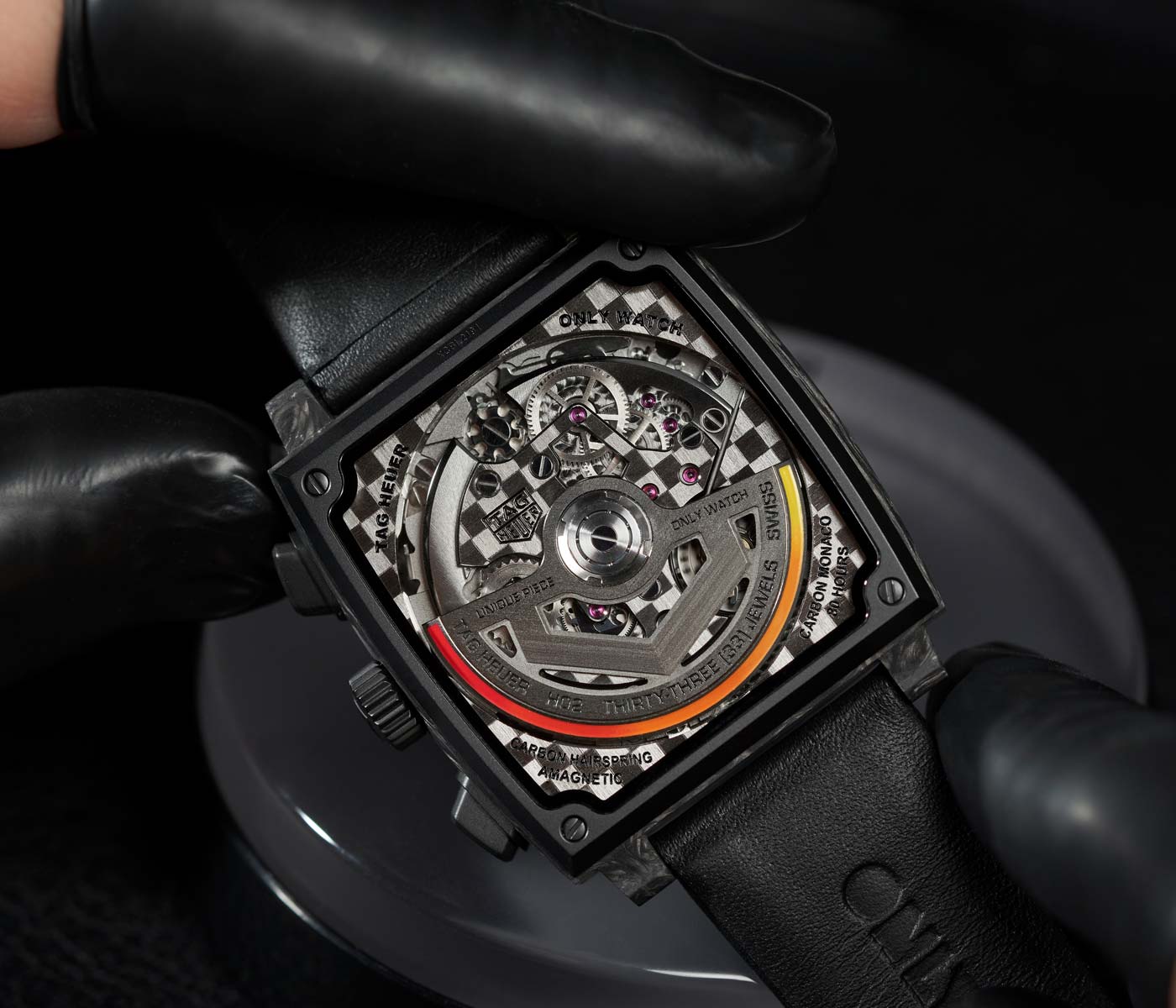 TAG Heuer created the Only Watch Carbon Monaco for the ninth edition of the auction. The noirish design echos the highly collectible Heuer Monaco 74033N ‘Dark Lord’ – a black-coated version of the company’s square-cased chronograph produced in limited quantities in the mid-1970s. TAG Heuer’s partner ArteCad fashioned the skeletonized dial from a single piece of carbon. Each facet stretches across the face of the watch like struts on a racing car – a reference to the brands long association with motor sport. The facets were finished using a beveling technique that creates angles and depth, giving the dial a multidimensional look. Orange accents on the hands and yellow luminescent markers reflect this year’s Only Watch palette, a gradient sunburned orange to yellow. The watch is powered by an exclusive version of the Heuer 02 movement, equipped with a carbon hairspring developed in-house, and an oscillating weight shaped like TAG’s shield logo – decorated with a gradient orange to yellow line. All the finishing is visible through the largest sapphire crystal case back ever applied to a Monaco. Fittingly, the strap is as unique as the watch. The watchmaker injected silicon into a leather strap and molded it in the shape of a link bracelet. TAG Heuer has never used this technique on a watch strap before.