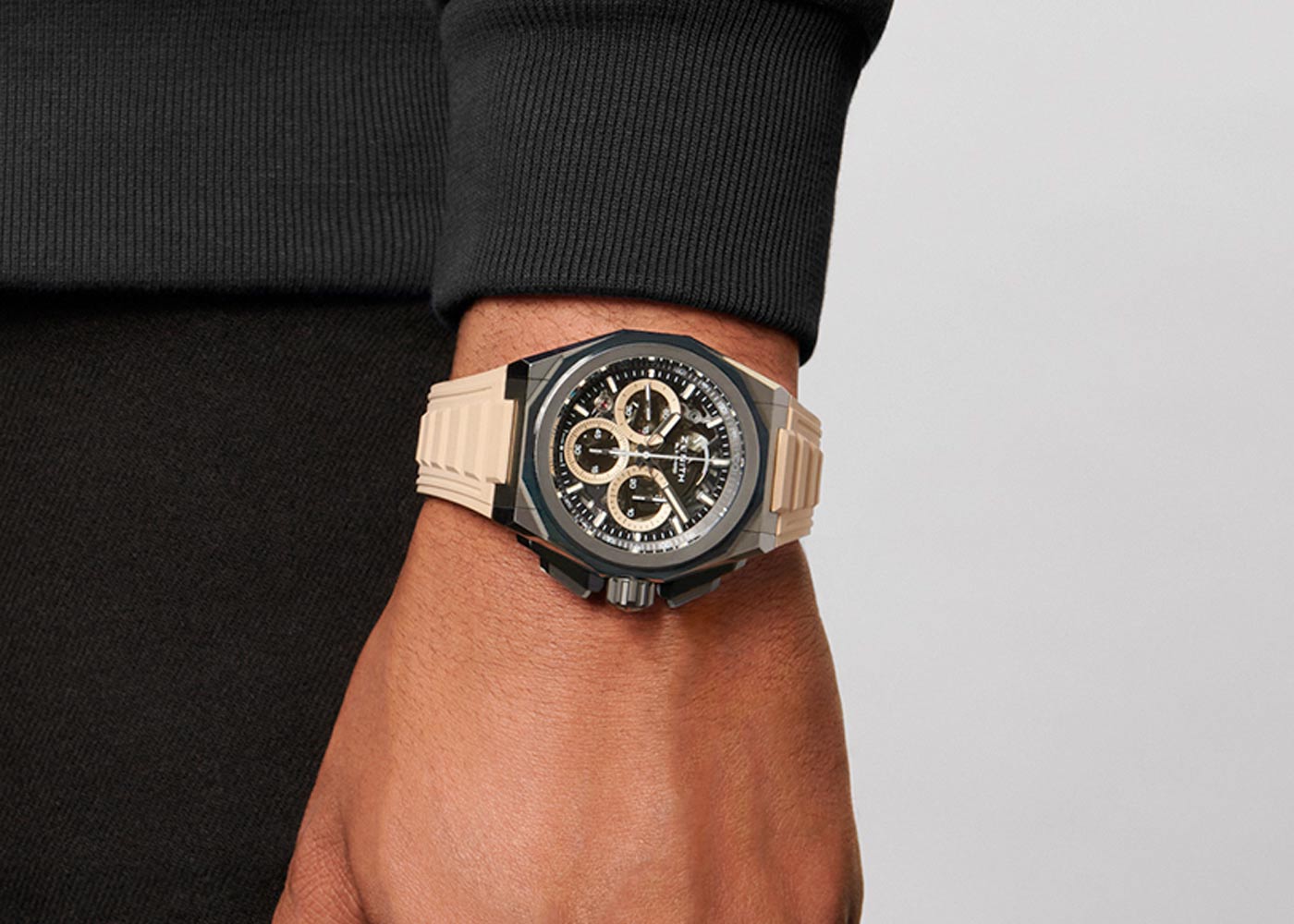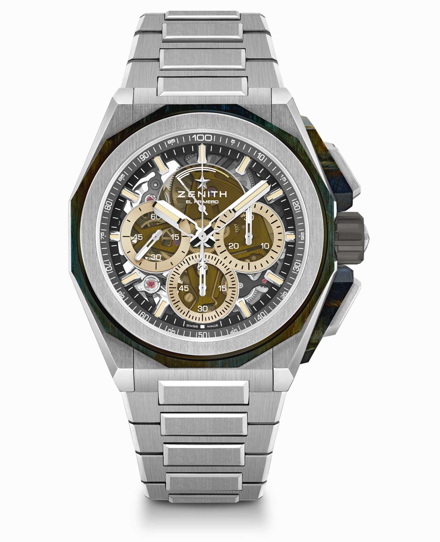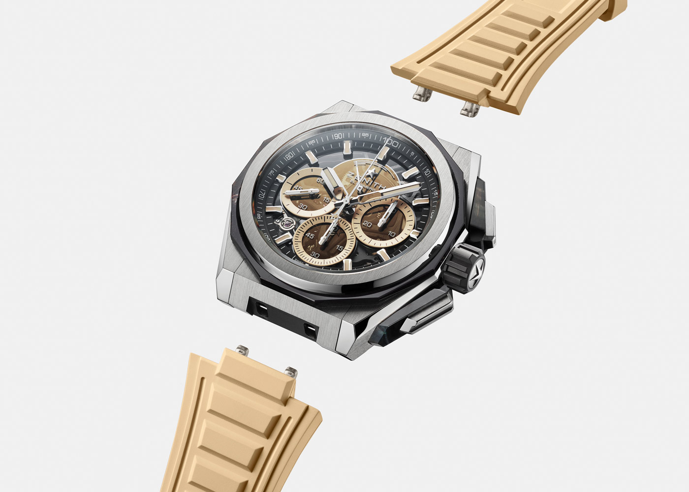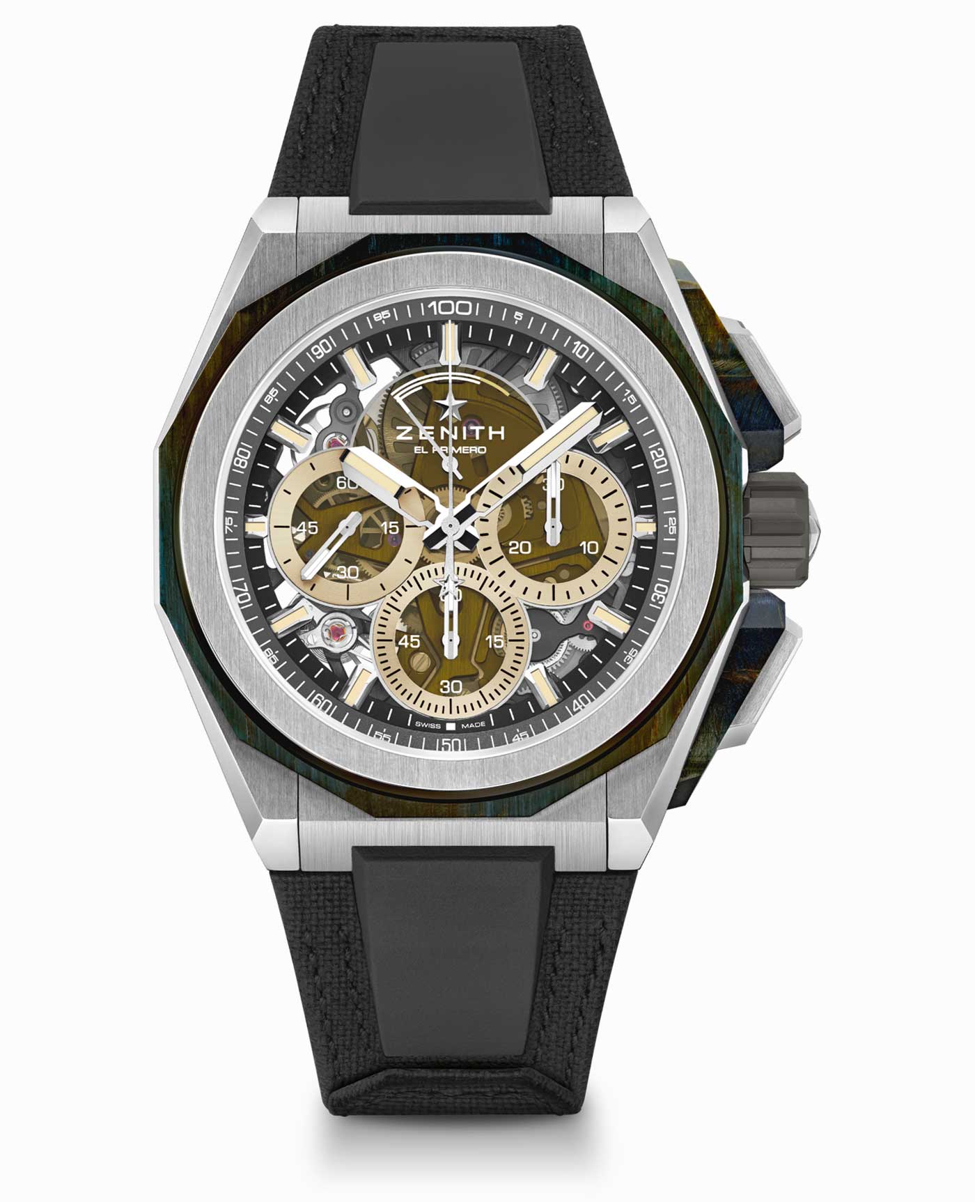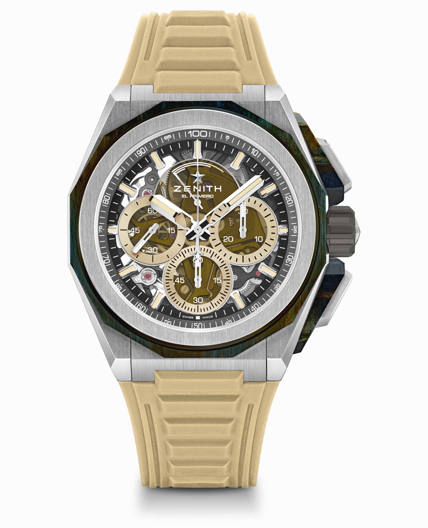 For the first-ever limited edition Defy Extreme, Zenith created a watch that’s equal parts precision craftsmanship and wearable art. Inspired by desert landscapes, the Defy Extreme Desert features a 45-mm titanium case accented with falcon’s eye, a variety of tiger’s eye. The 12-sided bezel and the component that protects the pushers are crafted from the blue-grey quartz. As each stone exhibits slightly different colors and fibrous structures, each of the 50 watches produced is a unique piece. Inside the case, the open dial reveals the inner workings of the El Primero 21 movement powering the 1/100th of a second chronograph. Atop the open dial is a tinted sapphire crystal with luminescent markers and hands, applied chronograph counters and a power reserve indicator – all in matching beige-brown tones. The titanium bracelet can be easily swapped for the supplied black Velcro or beige rubber strap using the quick change mechanism on the back of the case.