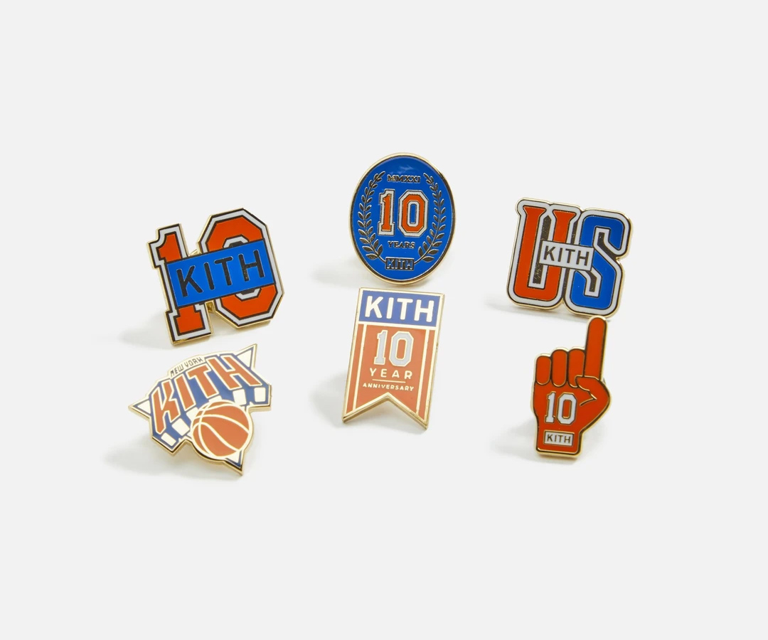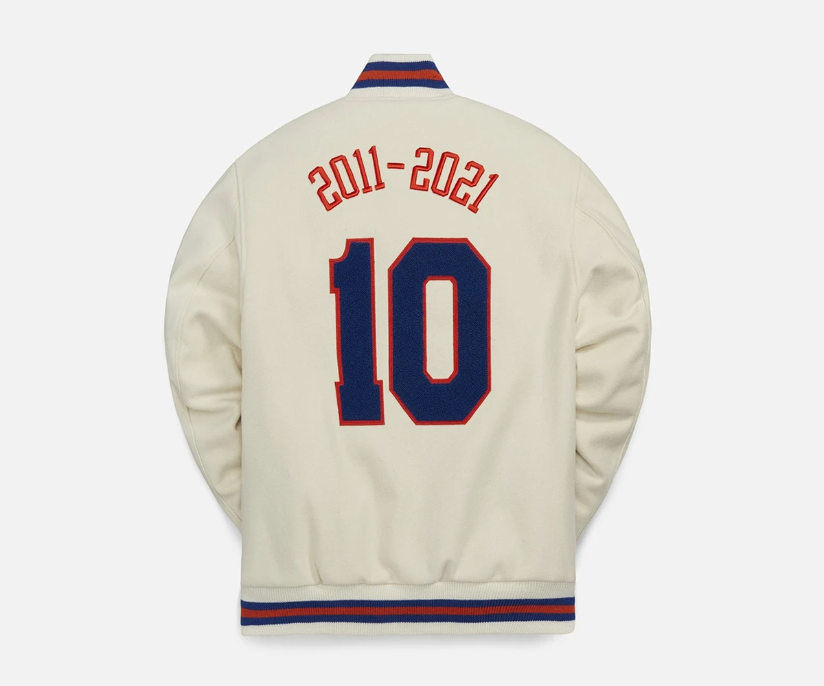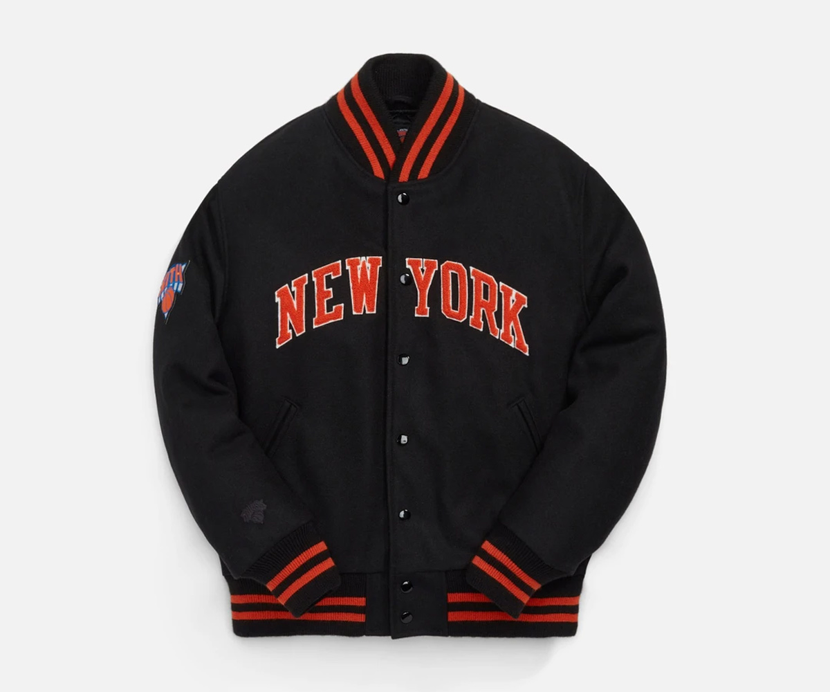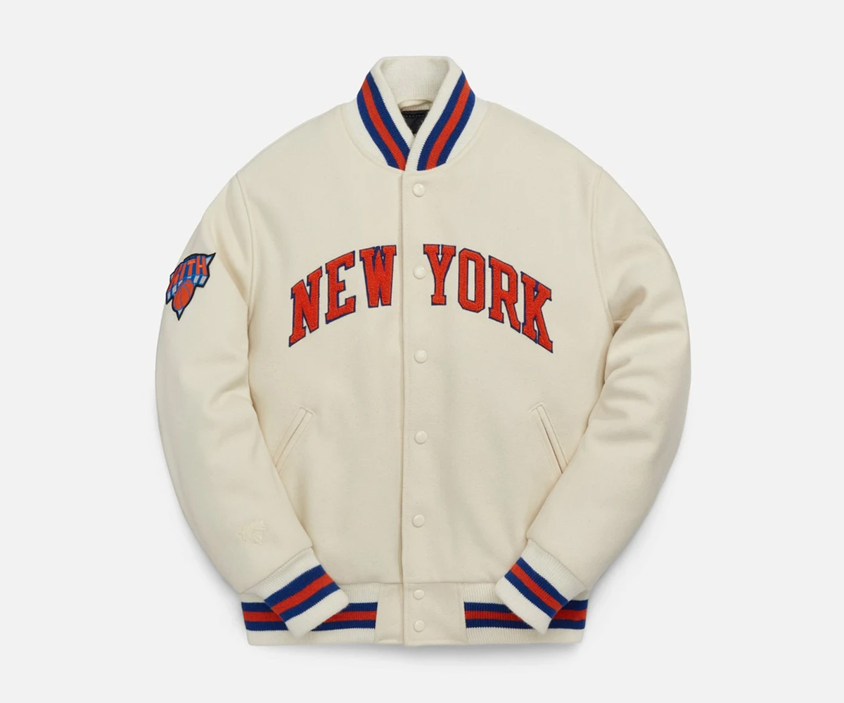 Kith’s tenth anniversary celebrations continue with a NYC-themed ‘Monday Program’ drop. The Kith for the New York Knicks capsule includes two exclusive Golden Bear Varsity Jackets ($595.00) and a custom pin set ($35.00) inspired by the hometown team. Each limited edition wool jacket is emblazoned with a New York chenille patch on the chest and embroidered with a Knicks logo patch on the left arm and a tonal Knicks logo above the left cuff. Available now.
