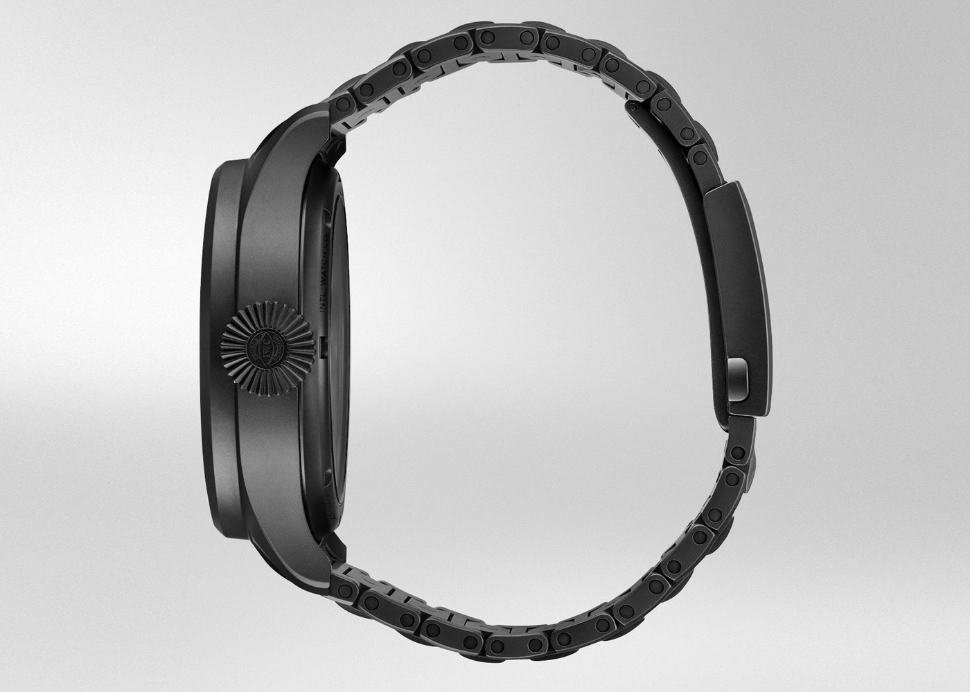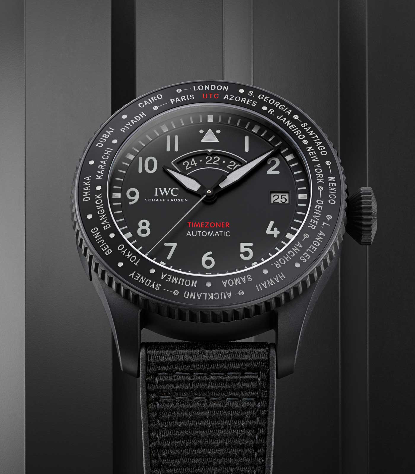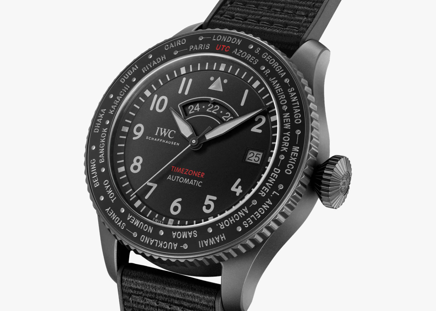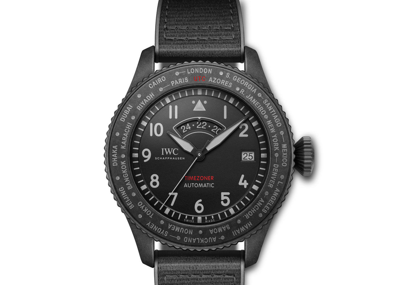 Available in a limited edition of 500 pieces, the 46-mm Pilot’s Watch Timezoner Top Gun Ceratanium ($16,900.00) is the first Top Gun model with a Timezoner complication. This proprietary mechanism allows the wearer to set two different time zones simply by pressing down and rotating the bezel. The hour hand, 24-hour display and date will move forward or backward in one-hour steps. This also works across the dateline without losing a single second. On the ceramic city ring, the names of 24 cities represent different international time zones. The numerals are printed in gray on the dial, while the numbers 12, 3, 6 and 9 are coated with a luminescent material. Visible through the sapphire crystal case back, the IWC-manufactured 82760 calibre uses a Pellaton winding system reinforced with ceramic components to build up a power reserve of 60 hours in the mainspring.
