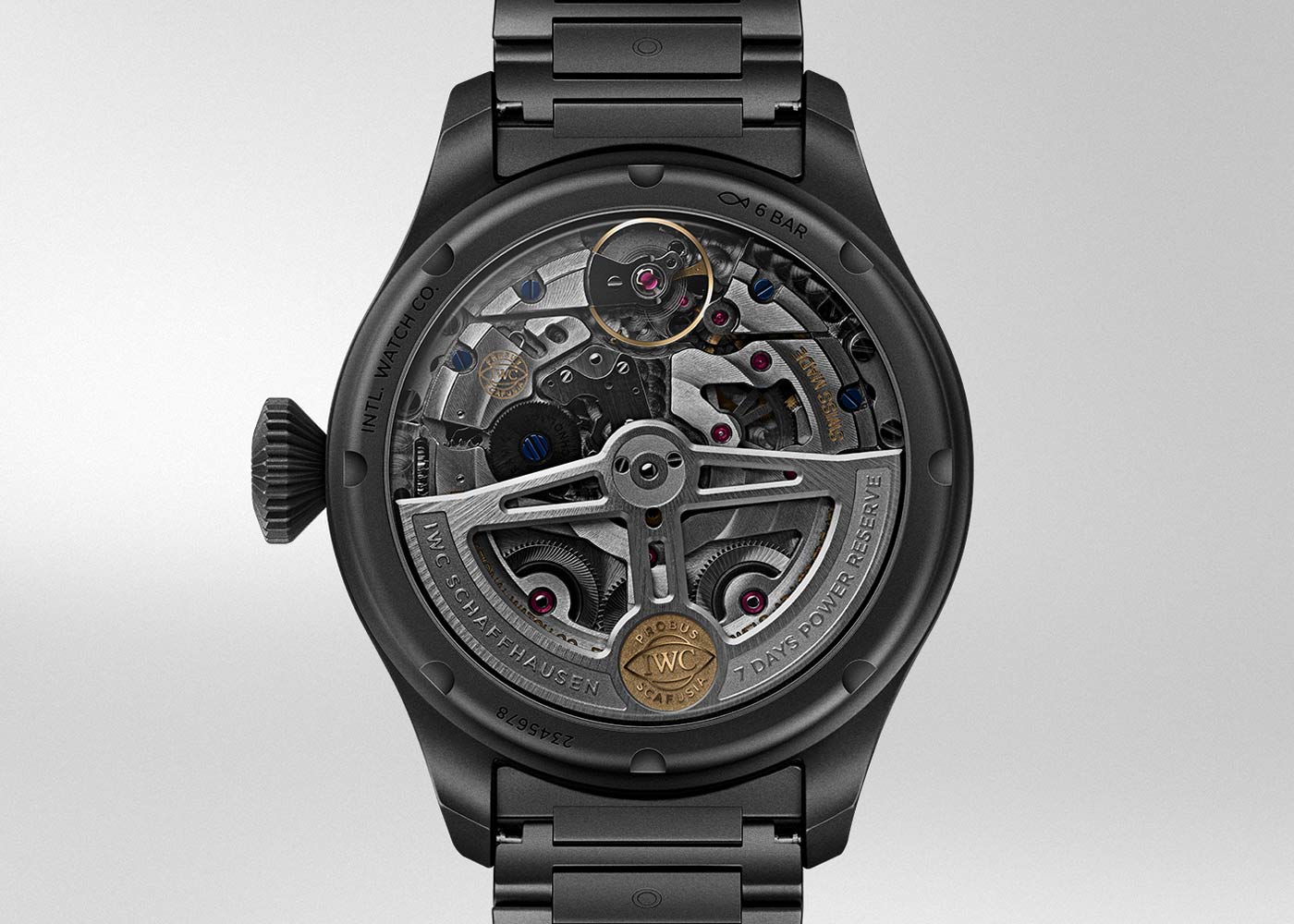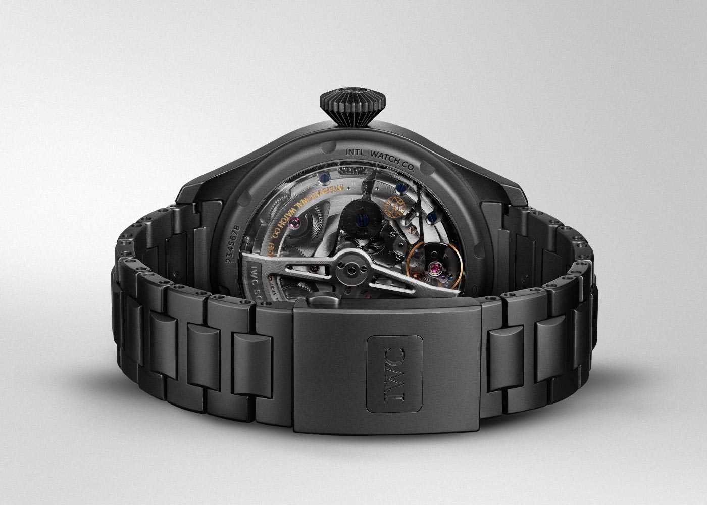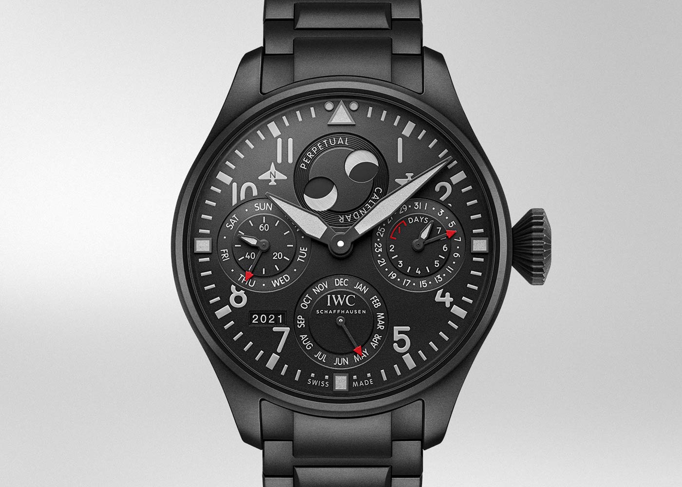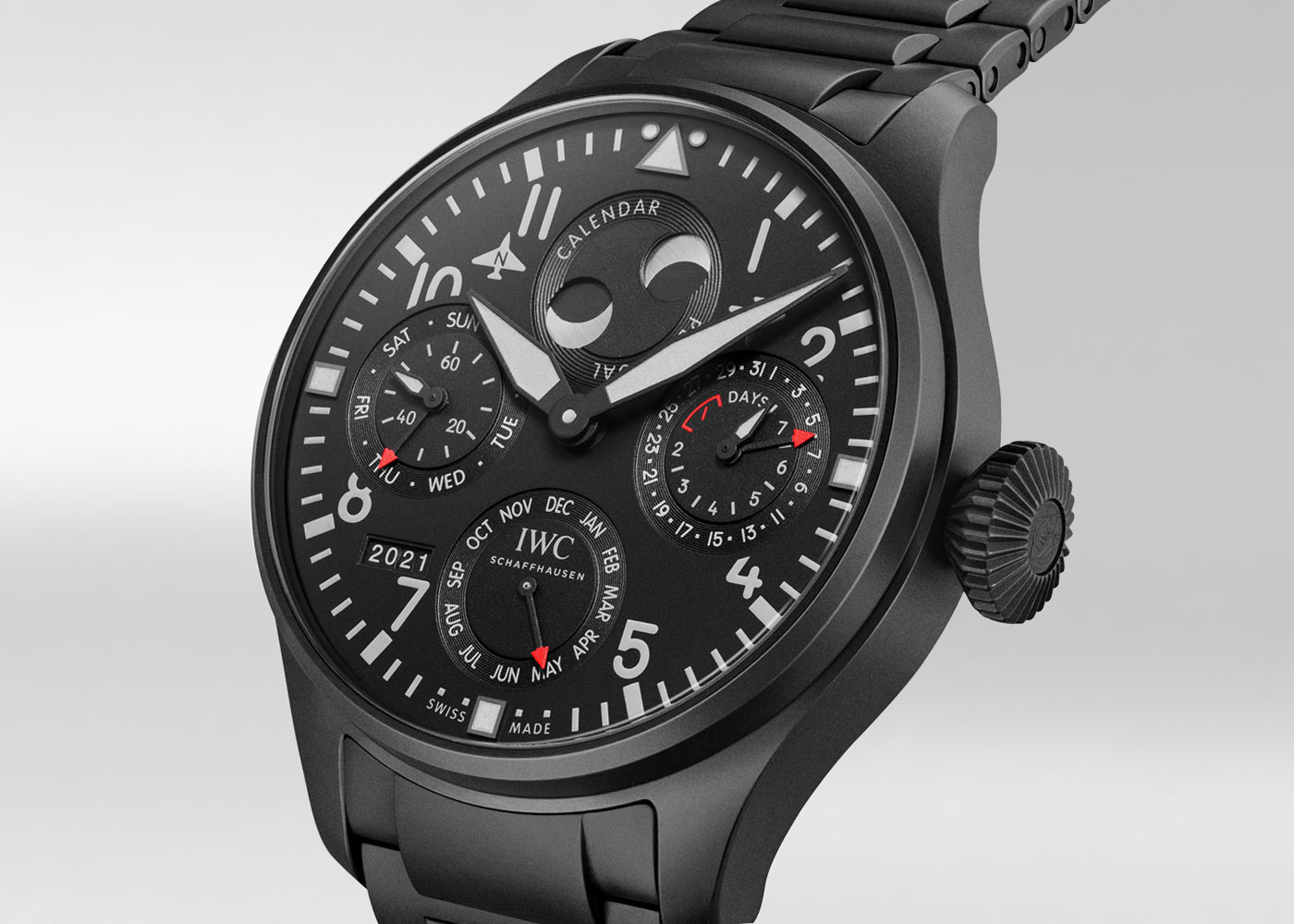The Big Pilot’s Watch Perpetual Calendar Top Gun Ceratanium ($48,000.00) is the first watch from IWC with a Ceratanium bracelet, which is lighter than steel. Limited to 150 pieces, this 46.2-mm Top Gun model is powered by the IWC-manufactured 52615 calibre, visible through the tinted sapphire glass case back. The Pellaton winding system is fitted with components made of virtually wear-free ceramic and builds up a power reserve of seven days in two barrels. A single nightly switching impulse from the base movement drives the perpetual calendar. Its mechanical program automatically recognizes different month lengths and leap years and will require no correction until 2100.