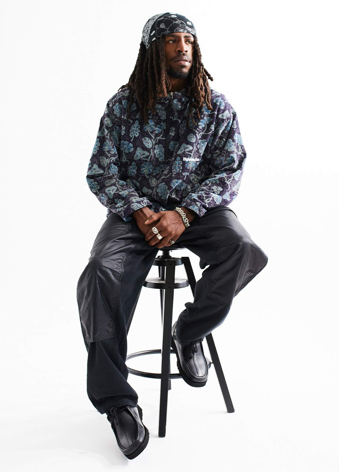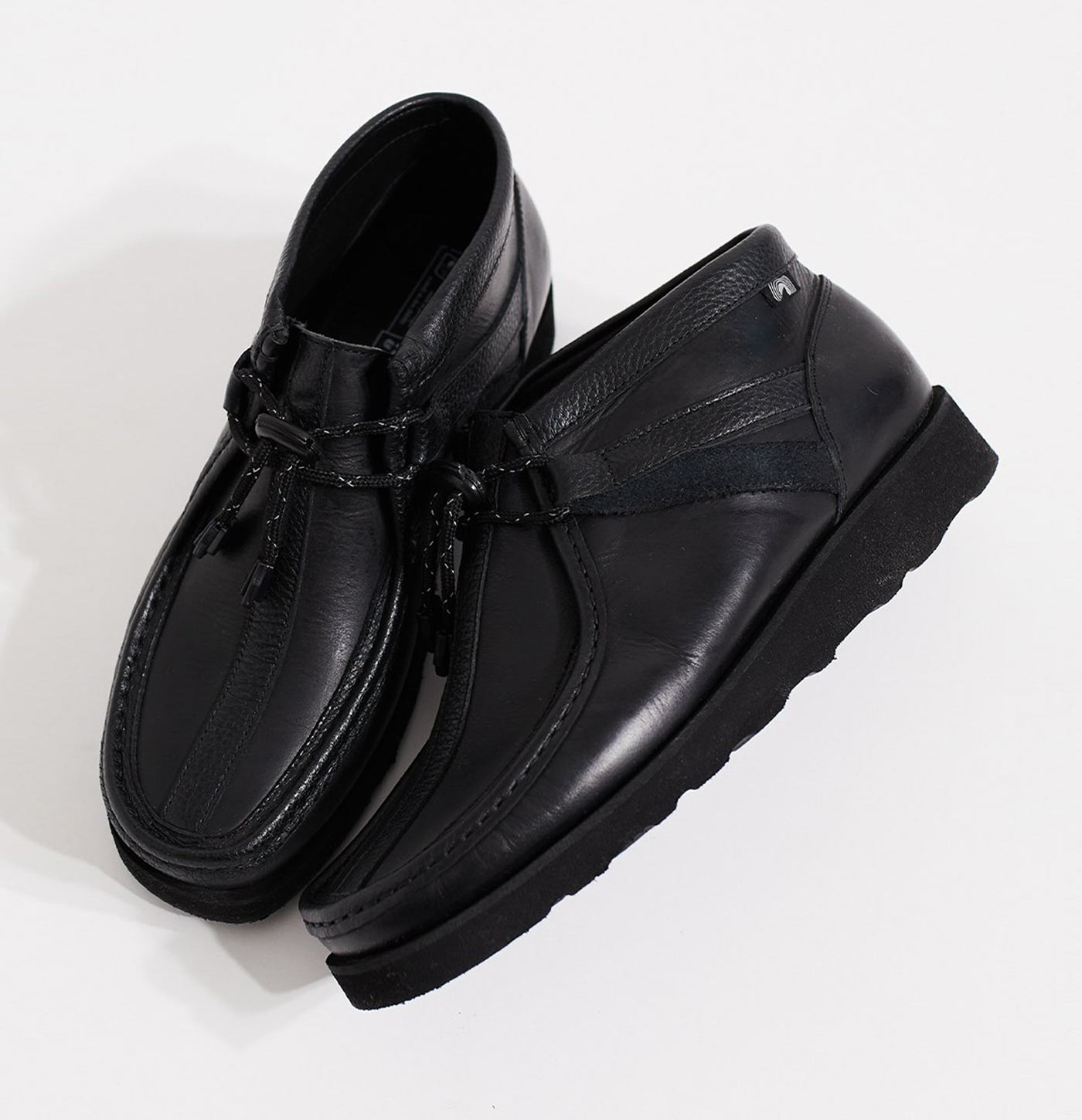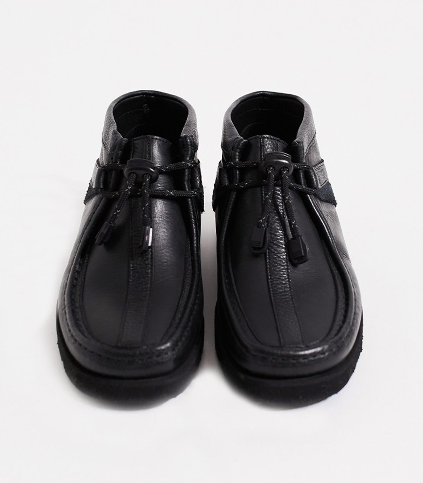 Padmore & Barnes created an all-weather version of their moc toe ‘original boot’ exclusively for 18 East’s fall collection. Inspired vintage British military boots, the 18 East All-Weather P404 wallabee features a waxed leather upper trimmed in contrasting matte pebble leather. A suede & pebble leather overlay secures the boots single lace loop, holding a nylon cord with 3M reflective tracers and a bungee lock. Each pair has co-branded leather insoles and is set atop Vibram Morflex outsoles.
