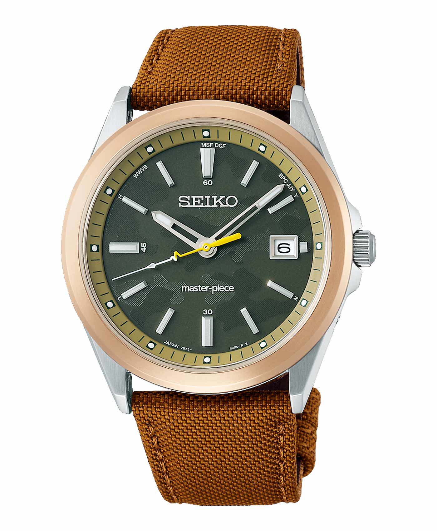 Military styling inspired Seiko’s second collaboration with Osaka-based accessories line Master-Piece. The new SBTM314 (¥64,900/$574) and the SBTM316 (¥68,200/$603) watches feature co-branded green or black camo dials, baton numerals, a date window at 3 o’clock and a yellow seconds hand in the shape of the Master-Piece logo. The 39.8 stainless steel case is fitted to a Mastertex-07 Cordura nylon strap, in Camel or Black. Seiko’s 7B72 solar-powered movement automatically adjusts according to timezone and runs for nine months on a full charge – or up to two months when the power save function is activated.