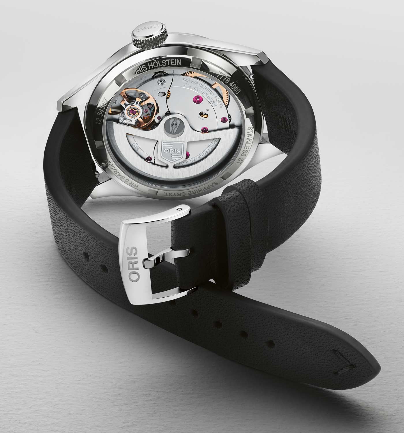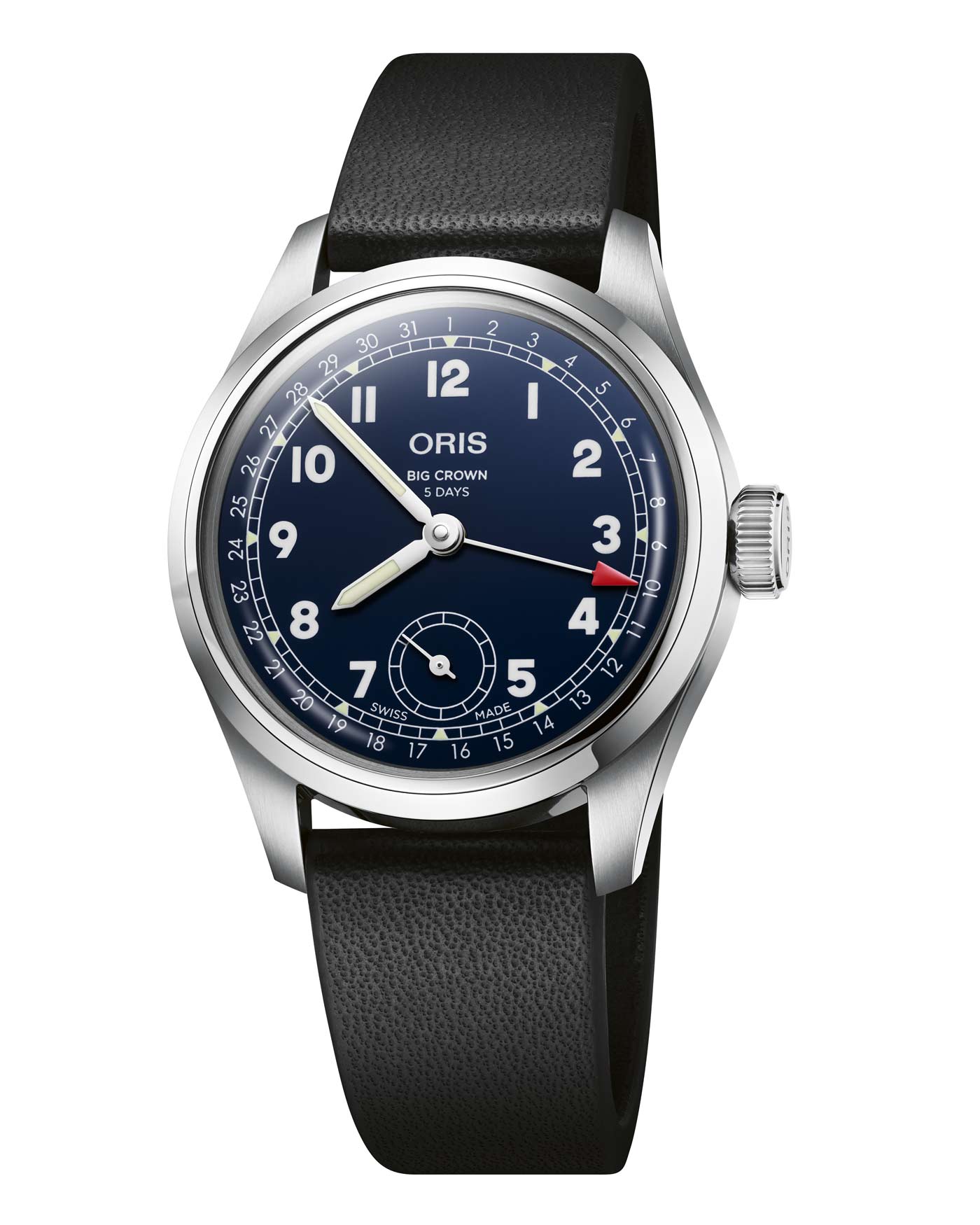 Introduced in 1938, the original Big Crown Pointer Date had two distinctive features – an oversize crown easily operated by gloved airmen, and a central hand pointing to a date scale around the edge of the dial. In constant production for more than 80 years, the model is now one of Oris’s signature designs. The latest iteration comes equipped with the Oris Calibre 403, an in-house automatic movement with elevated levels of anti-magnetism and a five-day power reserve. It provides the watch with small seconds and pointer date complications. Calibre 403 first appeared in the 250-piece Hölstein Edition 2021, but this is the first time it features in a collection piece. The Big Crown Pointer Date Calibre 403 has a blue dial with luminescent hands, indices and numbers housed in 38-mm stainless steel case reminiscent of vintage pilot’s watches. It retains the original’s style with a flat bezel and red-tipped center hand pointing to the date along the outer scale of the dial.