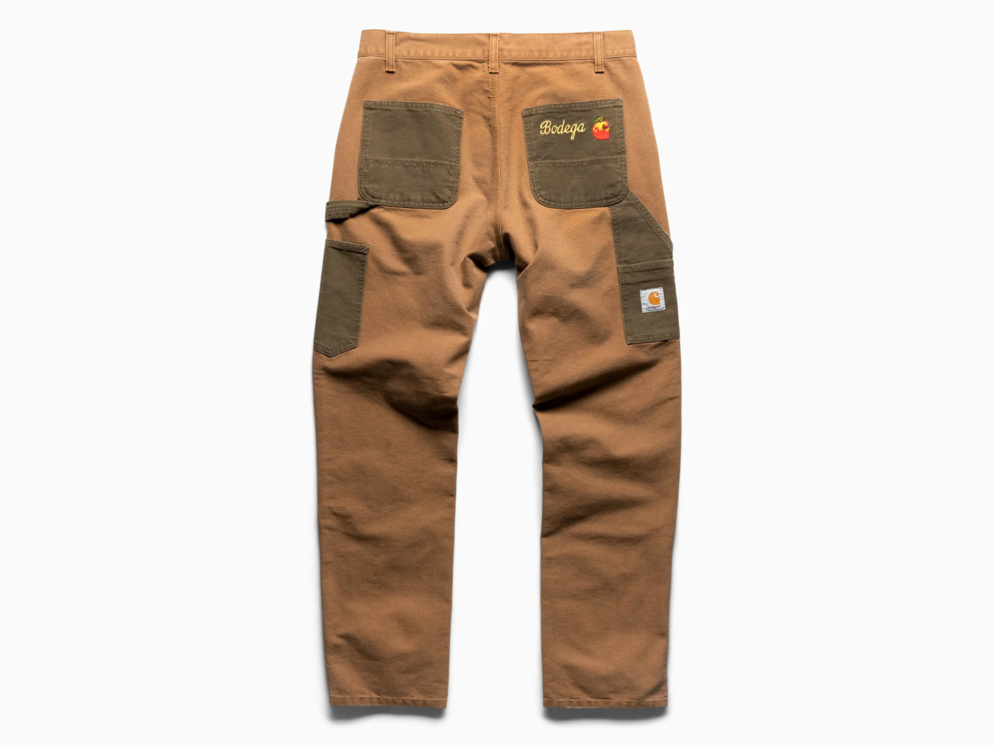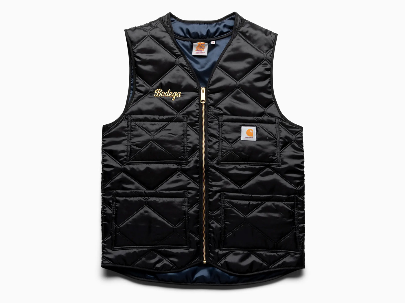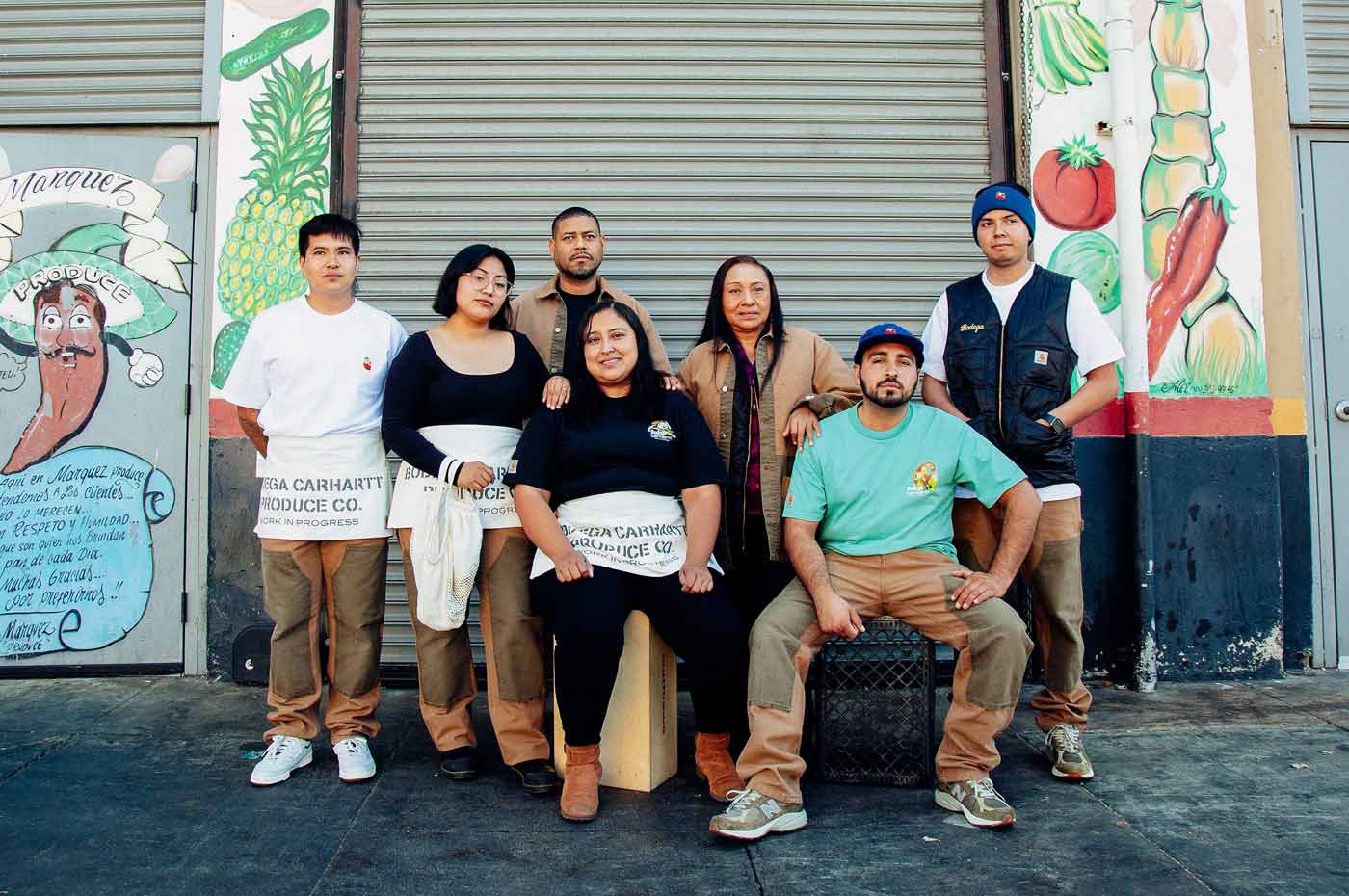 Bodega is celebrating 15 years in business with a new Carhartt WIP collaboration. Rooted in functionality and community, the eight-piece capsule collection reworks Charhartt classics like the Michigan Coat, Double Knee Pant and Vest. Each piece bears the collaboration’s C Logo apple emblem and incorporates elements of work uniforms, like internal name labels and reconfigured utility pockets. To shoot the corresponding editorial Bodega recruited the crew from L.A.’s Reyna Fruits stand “because as a multi-generational family-owned business, they exemplify the spirit of hard work, hustle, and community focus — people who do the work that’s essential, but sometimes goes unnoticed.” Bodega rounds out the capsule with an apron, beanie and cap, along with three graphic t-shirts inspired by Reyna Fruits.