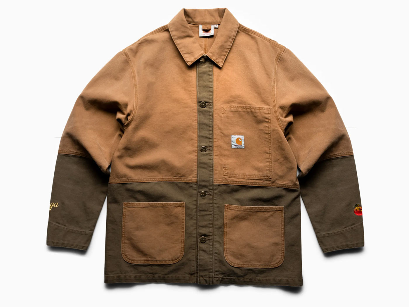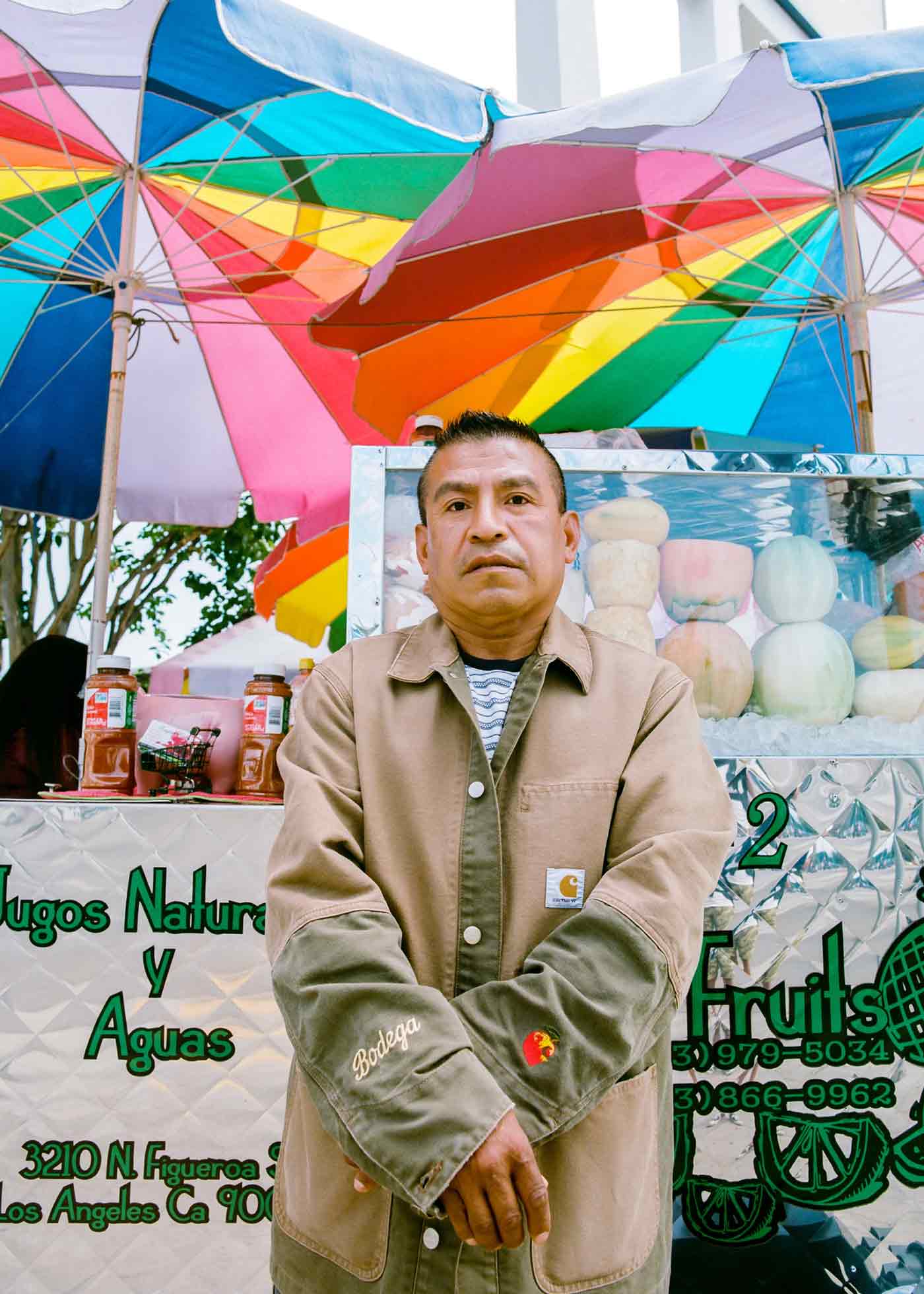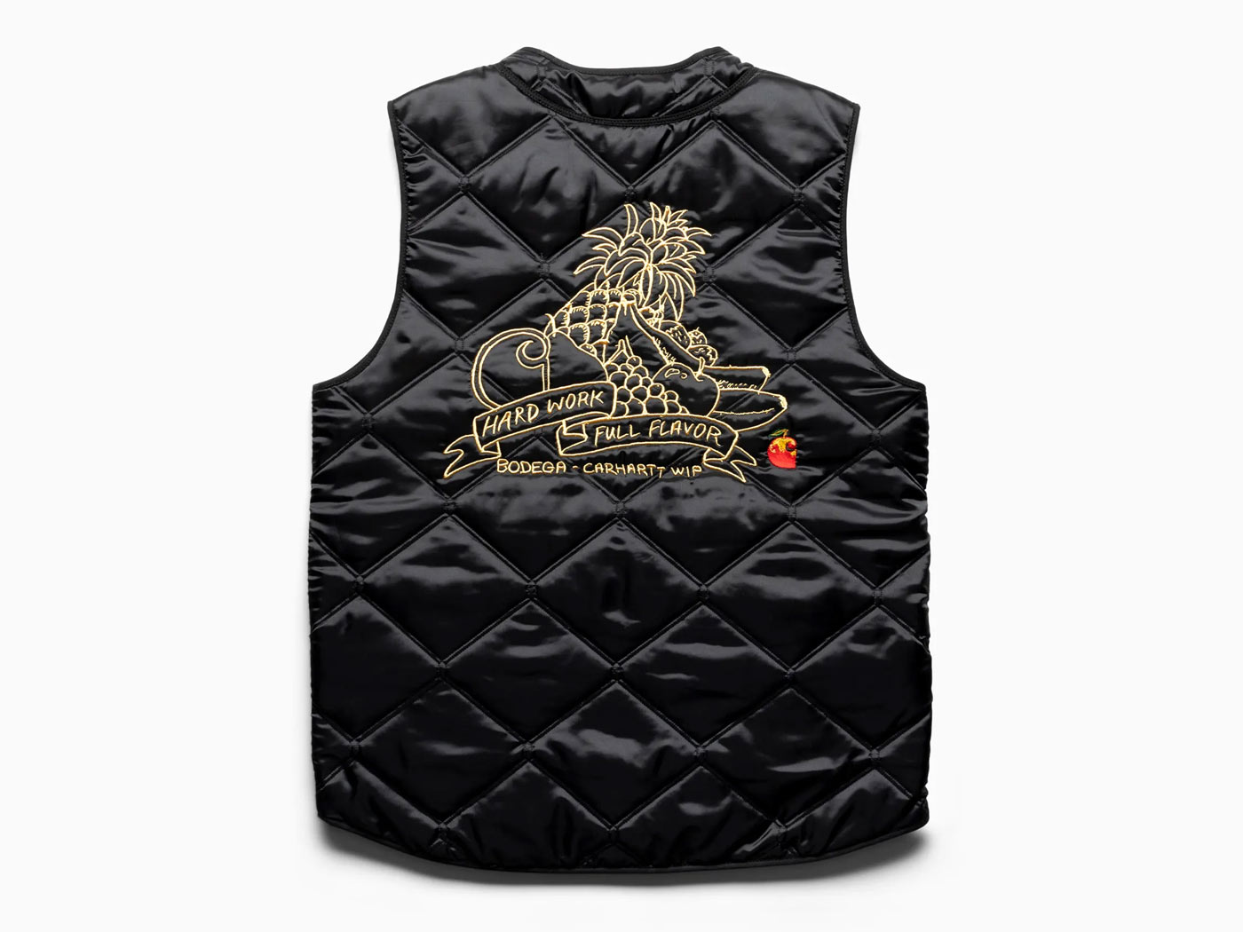 Bodega is celebrating 15 years in business with a new Carhartt WIP collaboration. Rooted in functionality and community, the eight-piece capsule collection reworks Charhartt classics like the Michigan Coat, Double Knee Pant and Vest. Each piece bears the collaboration’s C Logo apple emblem and incorporates elements of work uniforms, like internal name labels and reconfigured utility pockets. To shoot the corresponding editorial Bodega recruited the crew from L.A.’s Reyna Fruits stand “because as a multi-generational family-owned business, they exemplify the spirit of hard work, hustle, and community focus — people who do the work that’s essential, but sometimes goes unnoticed.” Bodega rounds out the capsule with an apron, beanie and cap, along with three graphic t-shirts inspired by Reyna Fruits.