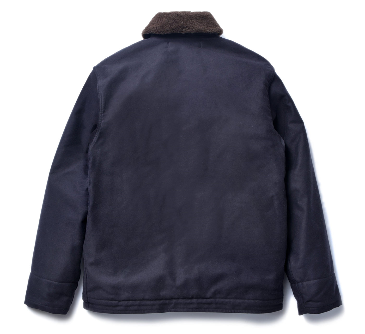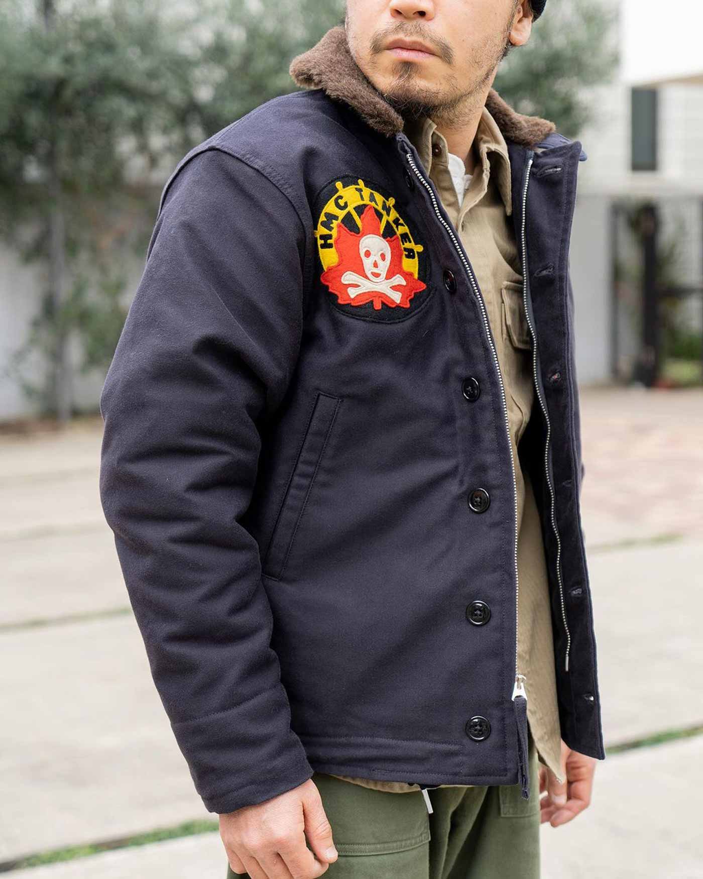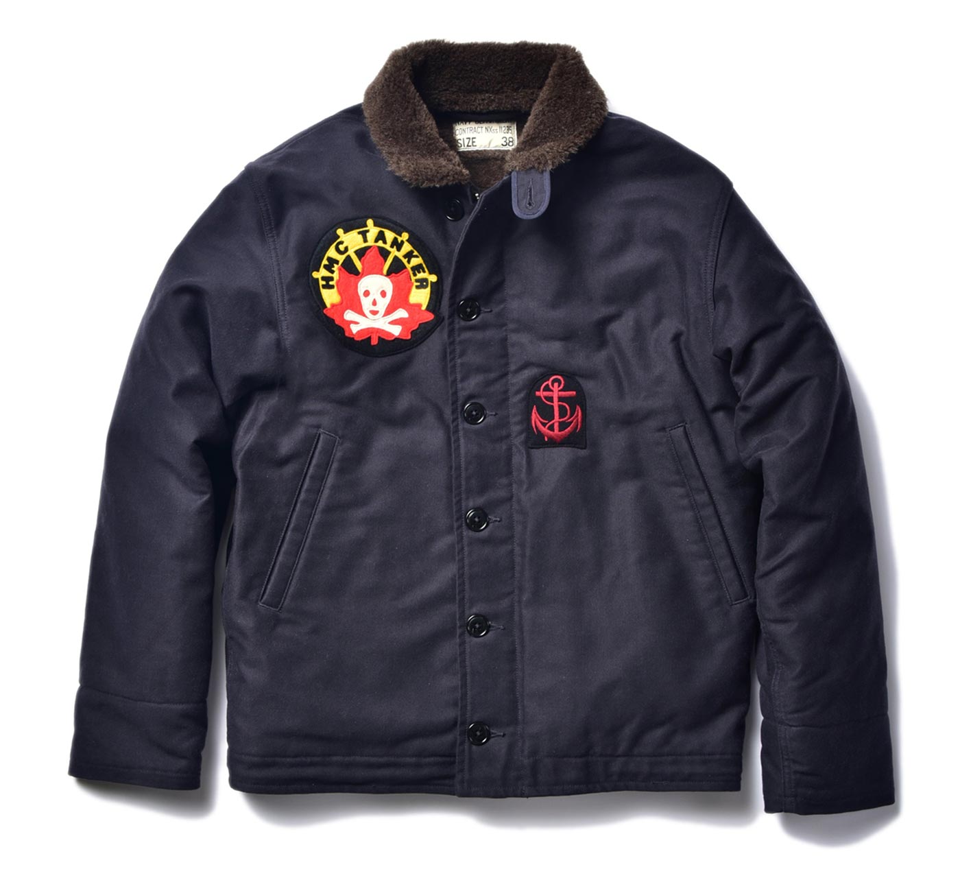 Inspired by mid-century American style, The Real McCoy’s painstaking reproductions of vintage military and workwear pieces manage to feel retro and modern. Case in point, the HMC Tanker Sweatshirt and N-1 Jacket. Both pieces have an embroidered patch on the right chest with a US Coast Guard skull, Canadian maple leaf and the words HMC Tanker. The symbols on the patch reference the transport ships used by the Royal Canadian Navy to supply British and American naval forces during WW2’s Battle of the Atlantic. Made from 12oz. loopwheel fabric, the HMC Tanker Sweatshirt ($326.00) has extra thick ribbed trims and an uneven rubber ink print on the back – giving it an authentic ’40s finish. The N-1 Navy HMC Tanker Jacket (1,134.00) channels deck jackets worn by aircraft carrier crews during WW2 and the Korean War. An alpaca lining inside the thick cotton shell provides extra warmth.