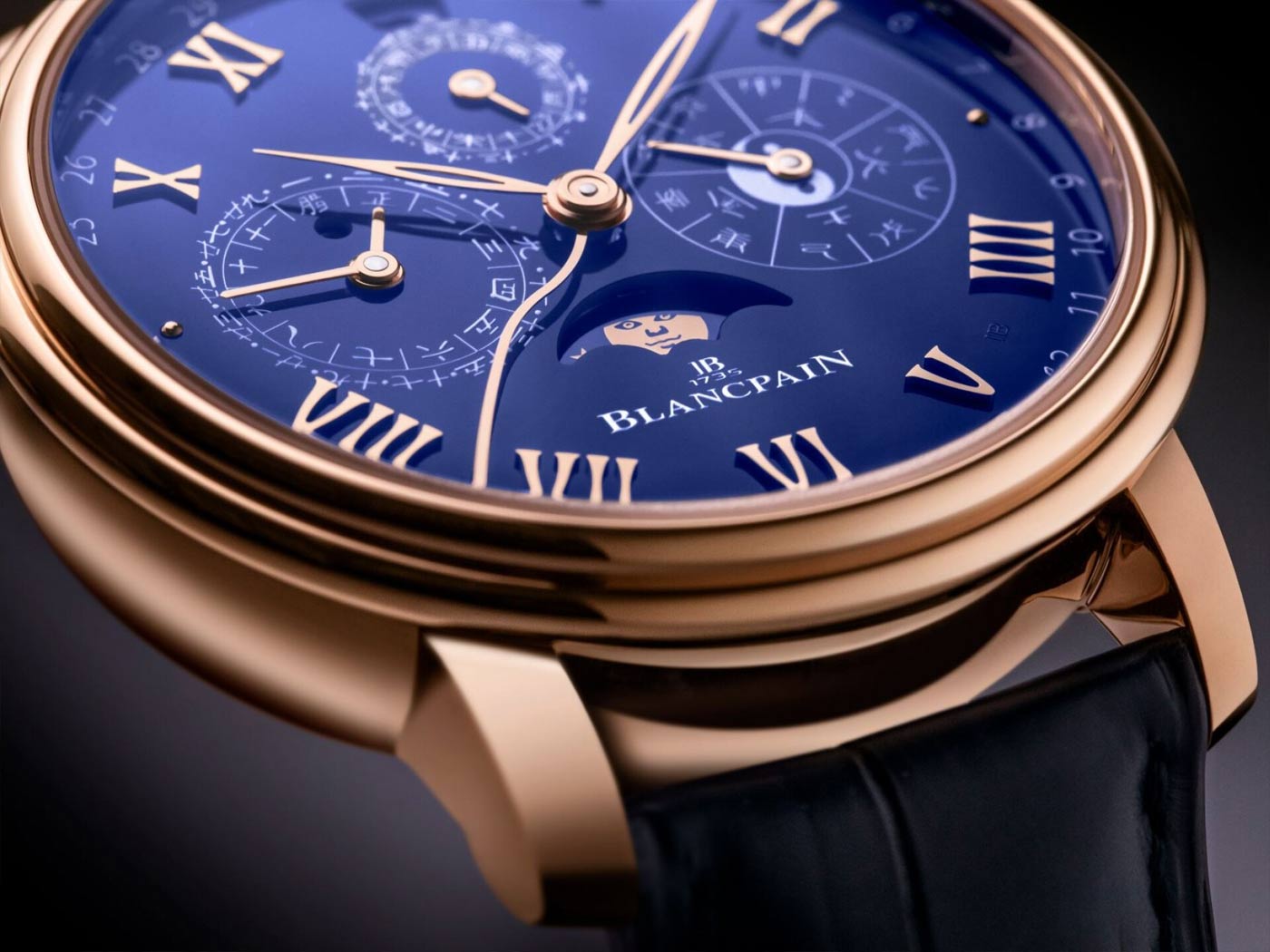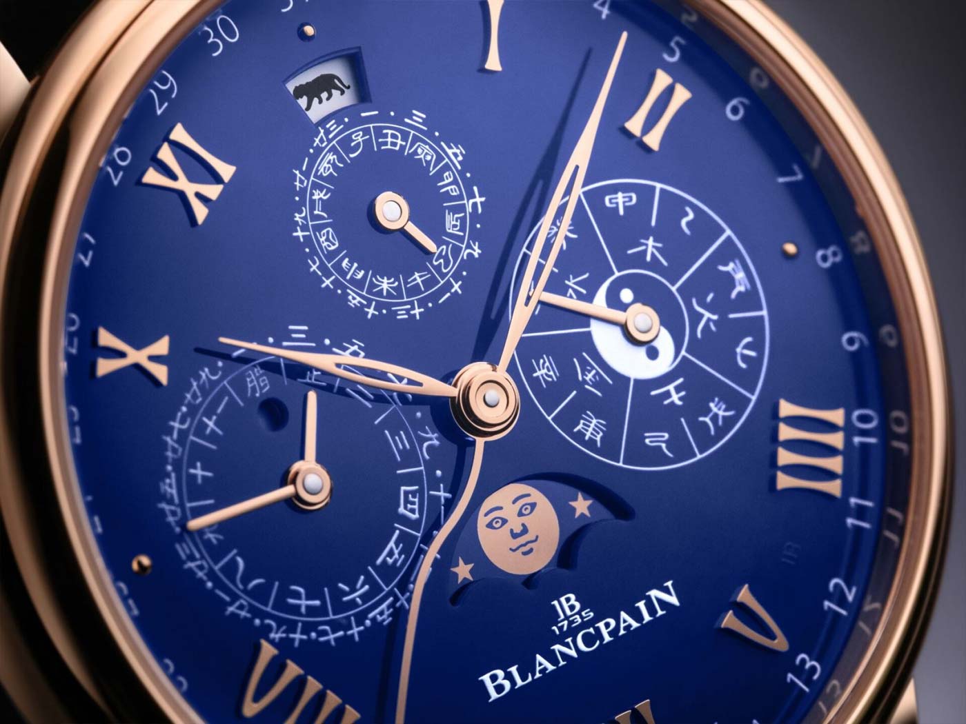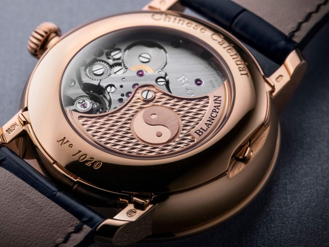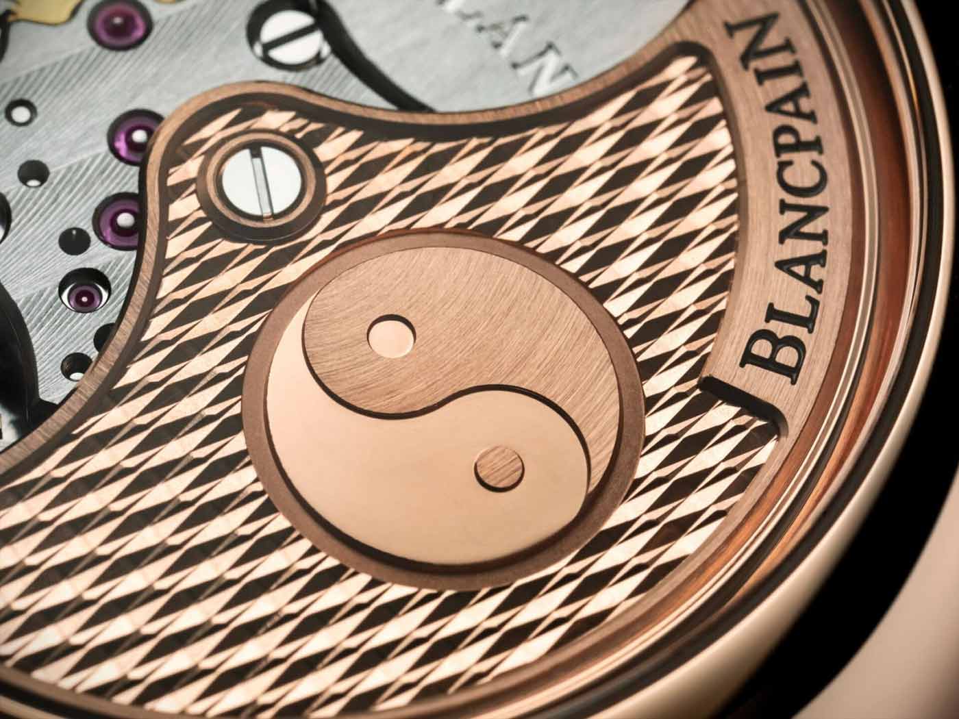 With the 2022 Lunar New Year approaching, Blancpain unveils a second version of the Traditional Chinese Calendar watch for the Year of the Tiger. Crafted in red gold with a blue grand feu enamel dial, this limited edition is only available at Blancpain boutiques. Gold Roman numerals applied to the blue dial indicate the hours, while enamel Arabic numerals on the periphery follow the Gregorian calendar. A small sub-dial at 12 o’clock denotes traditional Chinese ‘double hours’ in figures and symbols over a 24 cycle. With a yin and yang symbol in its center, the sub-dial at 3 o’clock signals the five elements (wood, fire, earth, metal, water) and the ten celestial stems over a cycle of ten years. A third sub-dial at 9 o’clock tracks the lunar months of the Chinese calendar. The inscription on the periphery of this counter uses the longer hand to indicate the lunar days. The moon phases are displayed in an aperture above 6 o’clock. The 45-mm double-stepped red gold case features an exhibition back offering a view of the self-winding movements oscillating weight and honeycomb pattern engraved with the yin and yang symbol.